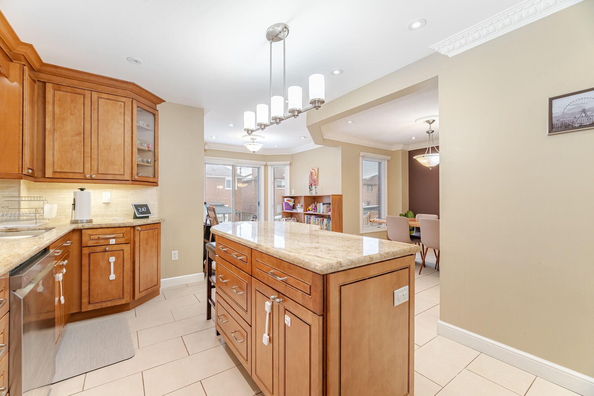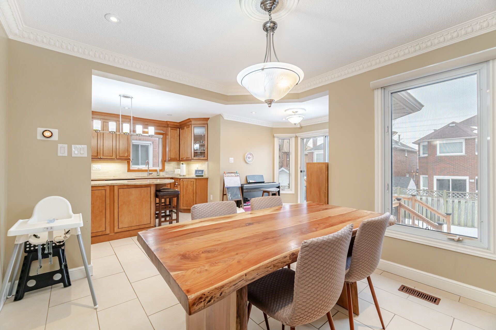 • Large family and dining rooms with a cozy gas fireplace.