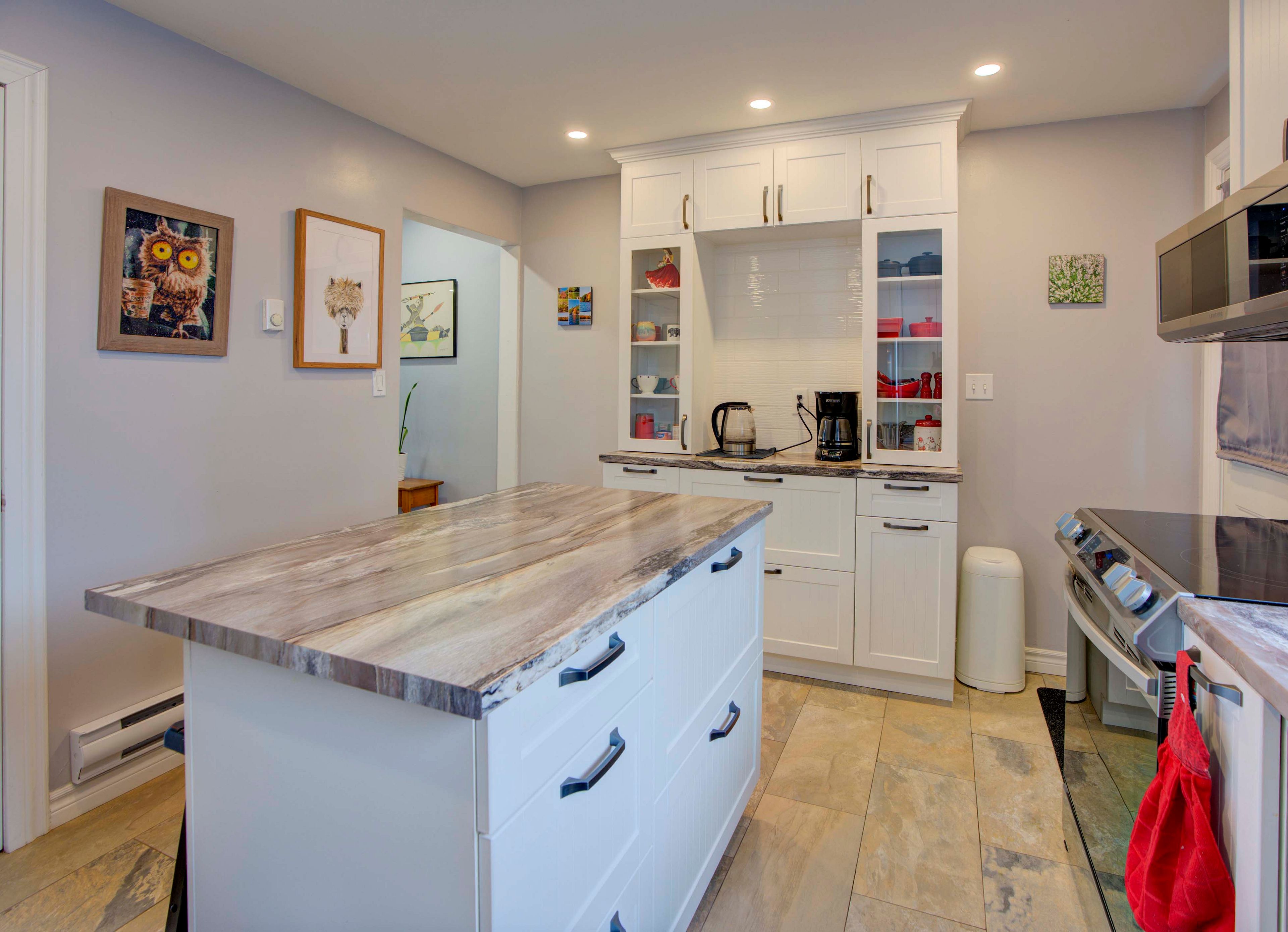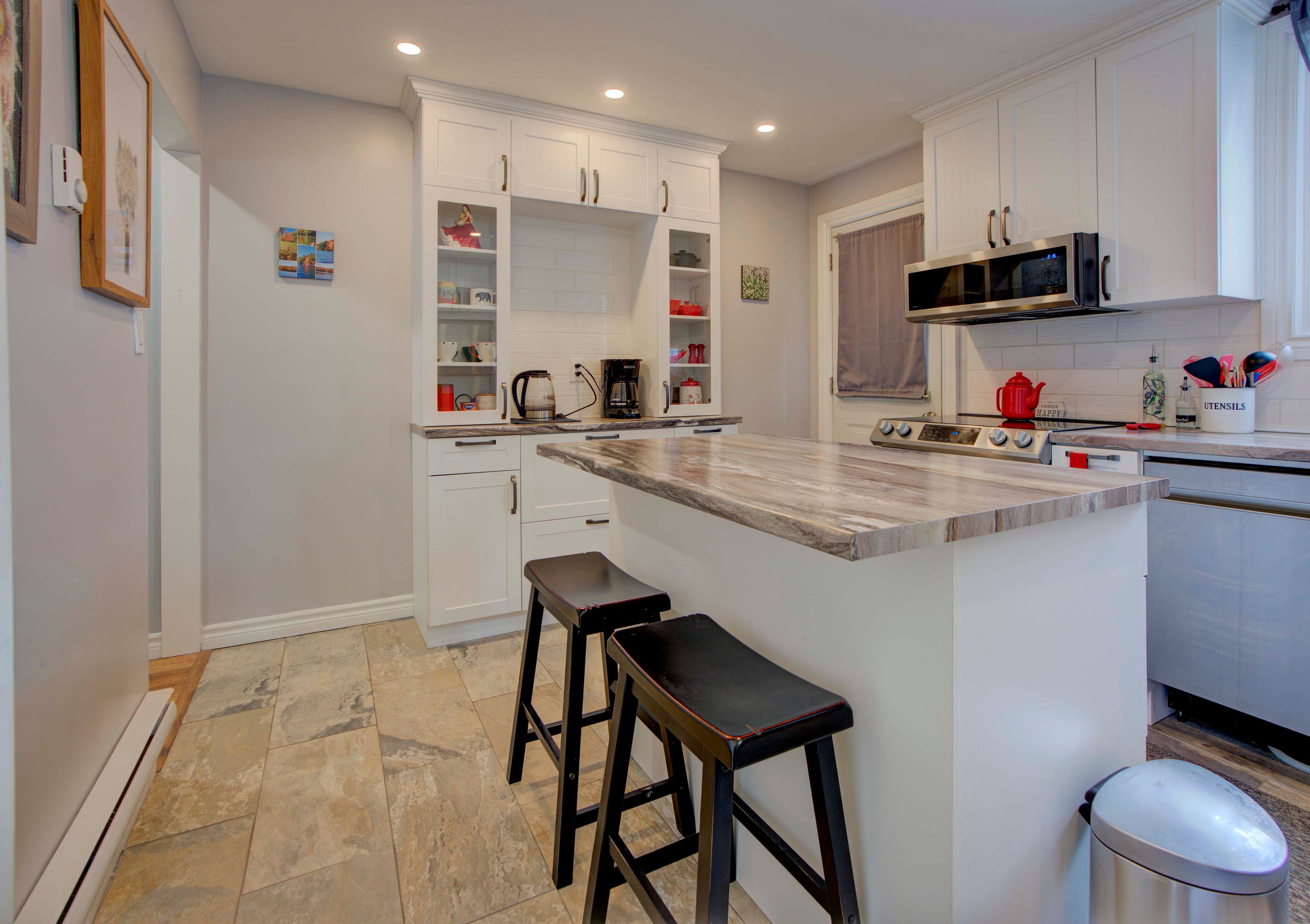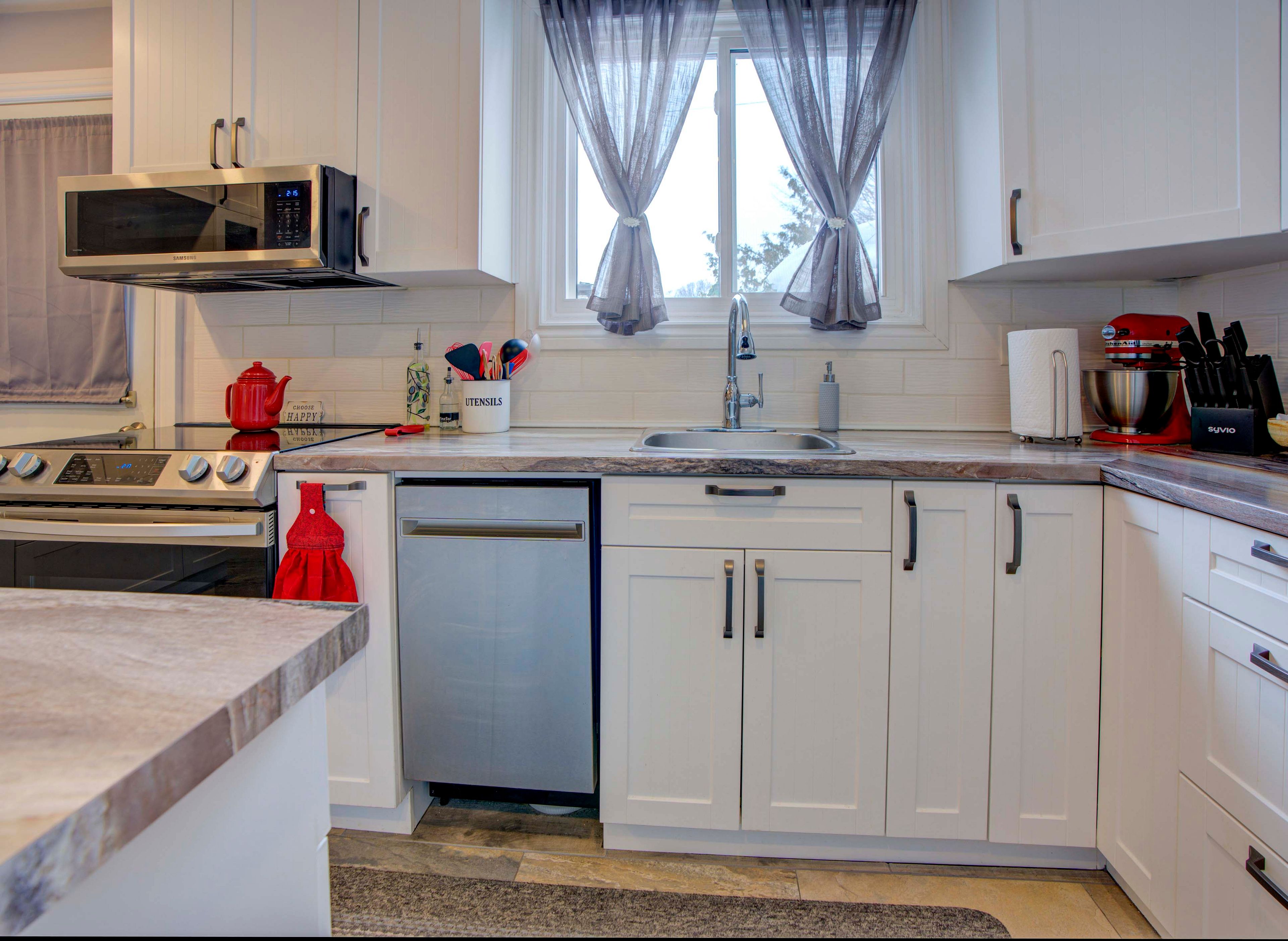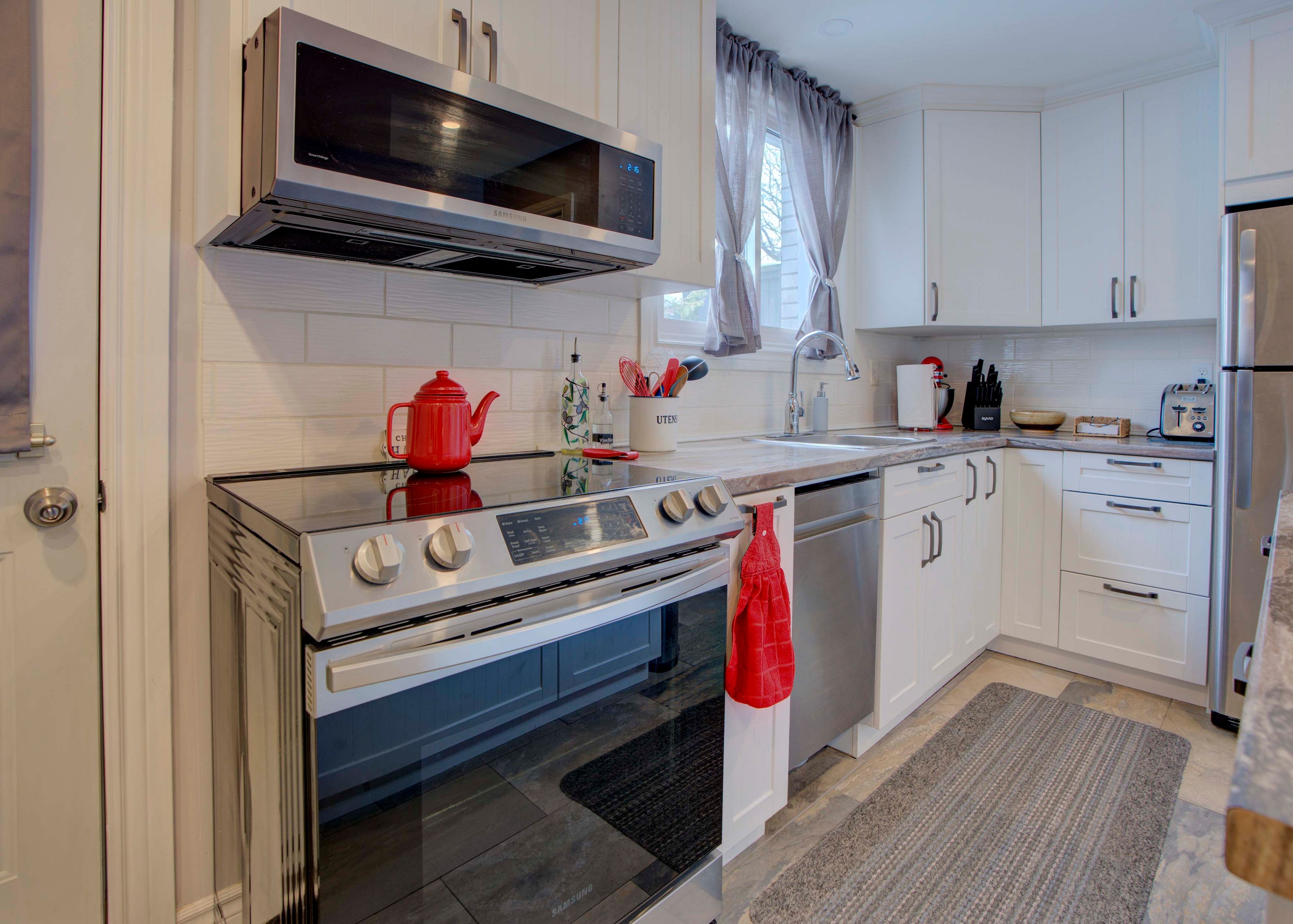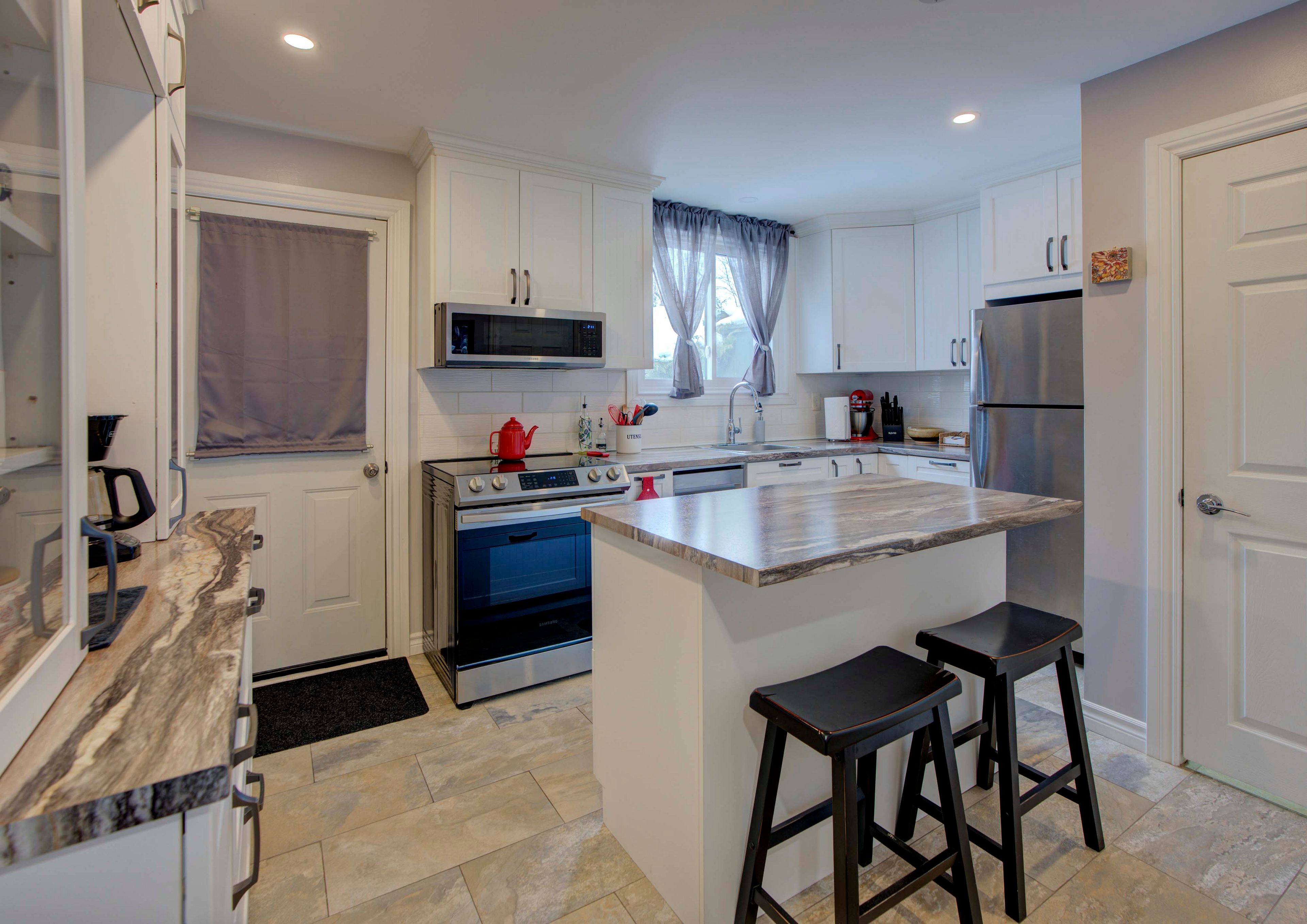 • Custom kitchen with ample storage, modern appliances, and backyard access.