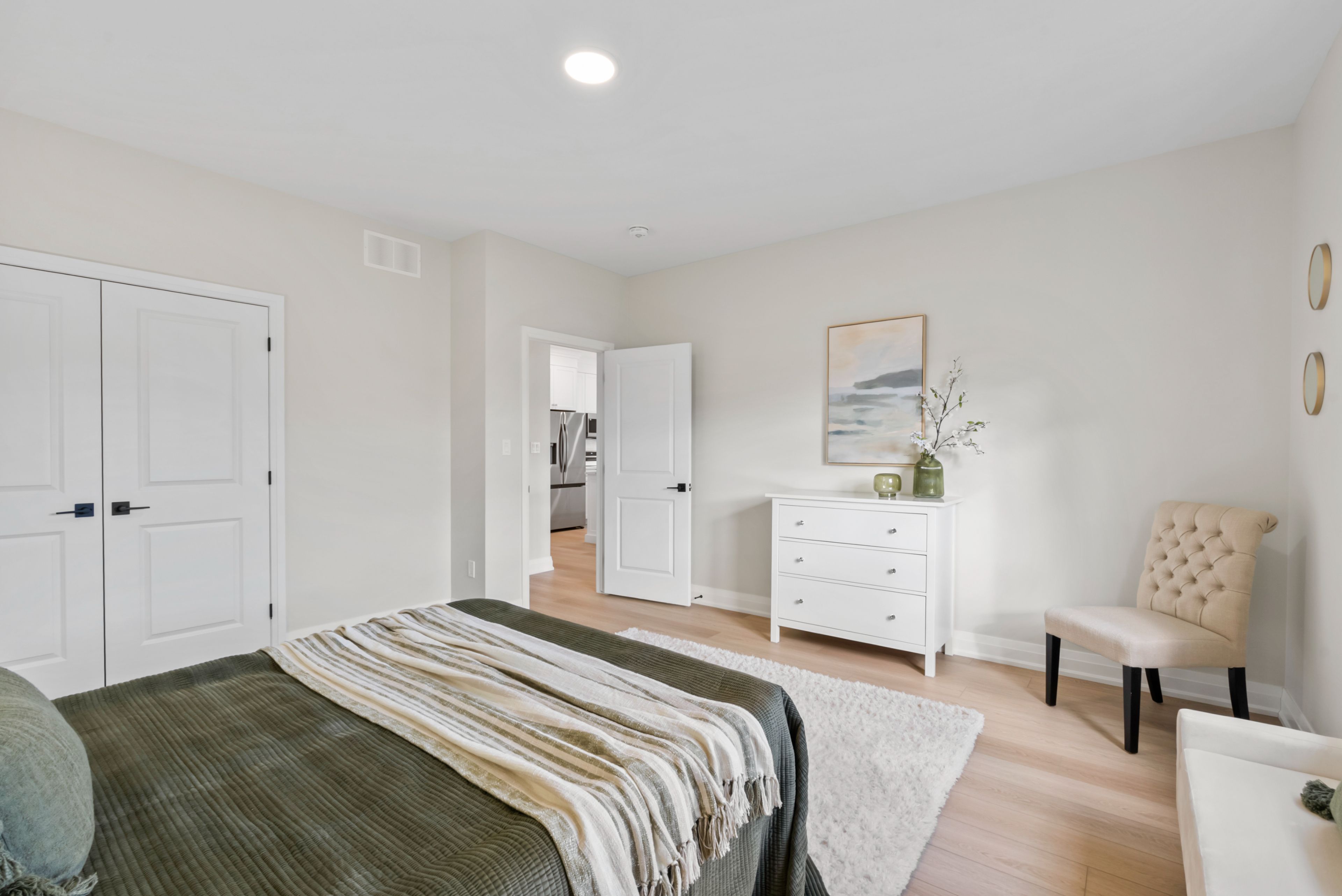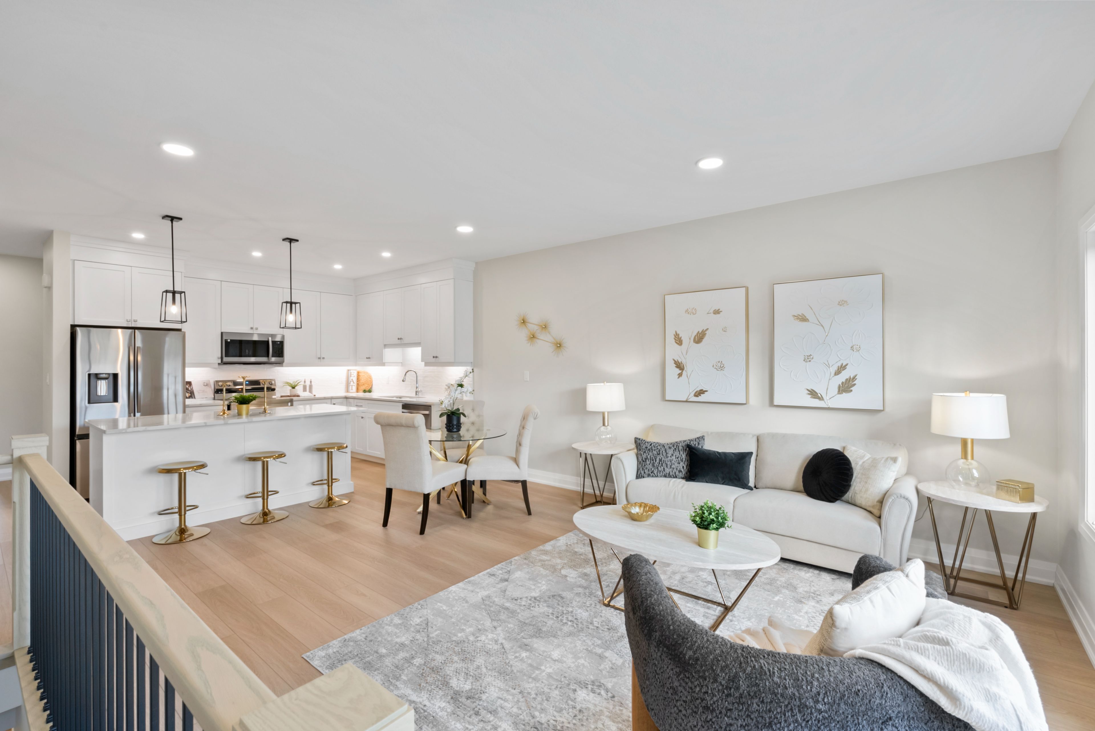 • Main-level living with two bedrooms and open-concept kitchen and dining areas.
