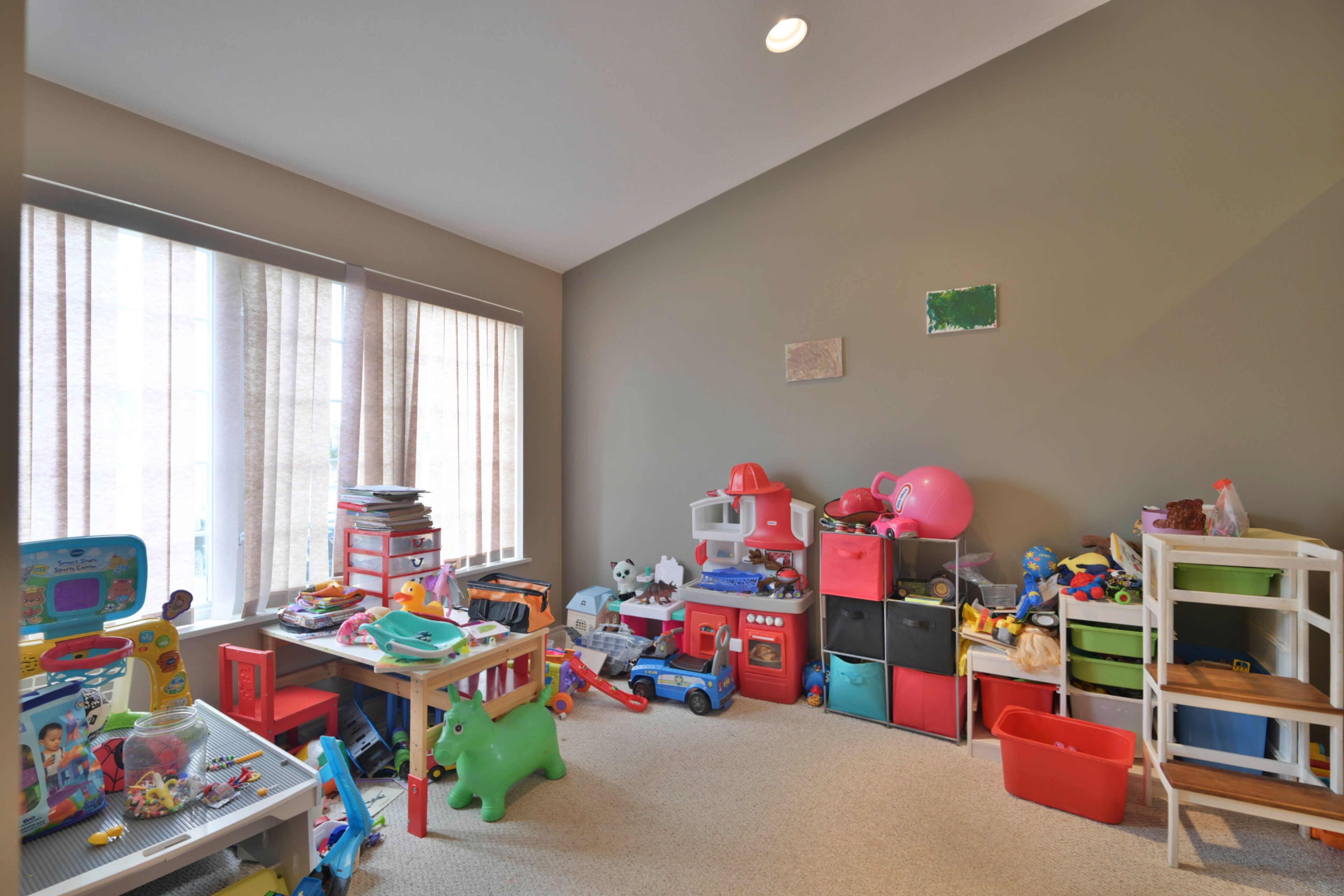 • Finished basement includes a rec room, games area, and extra storage space.