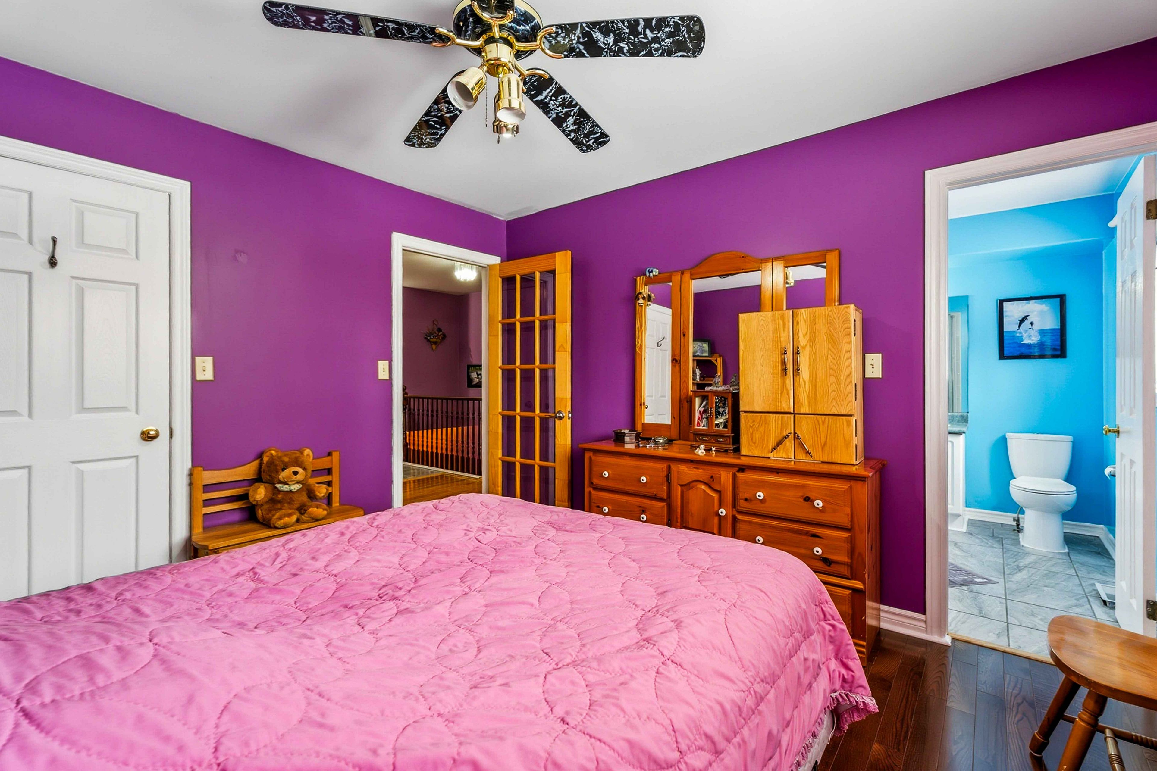 • Two bedrooms with dark wood flooring and a walk-in closet in primary.