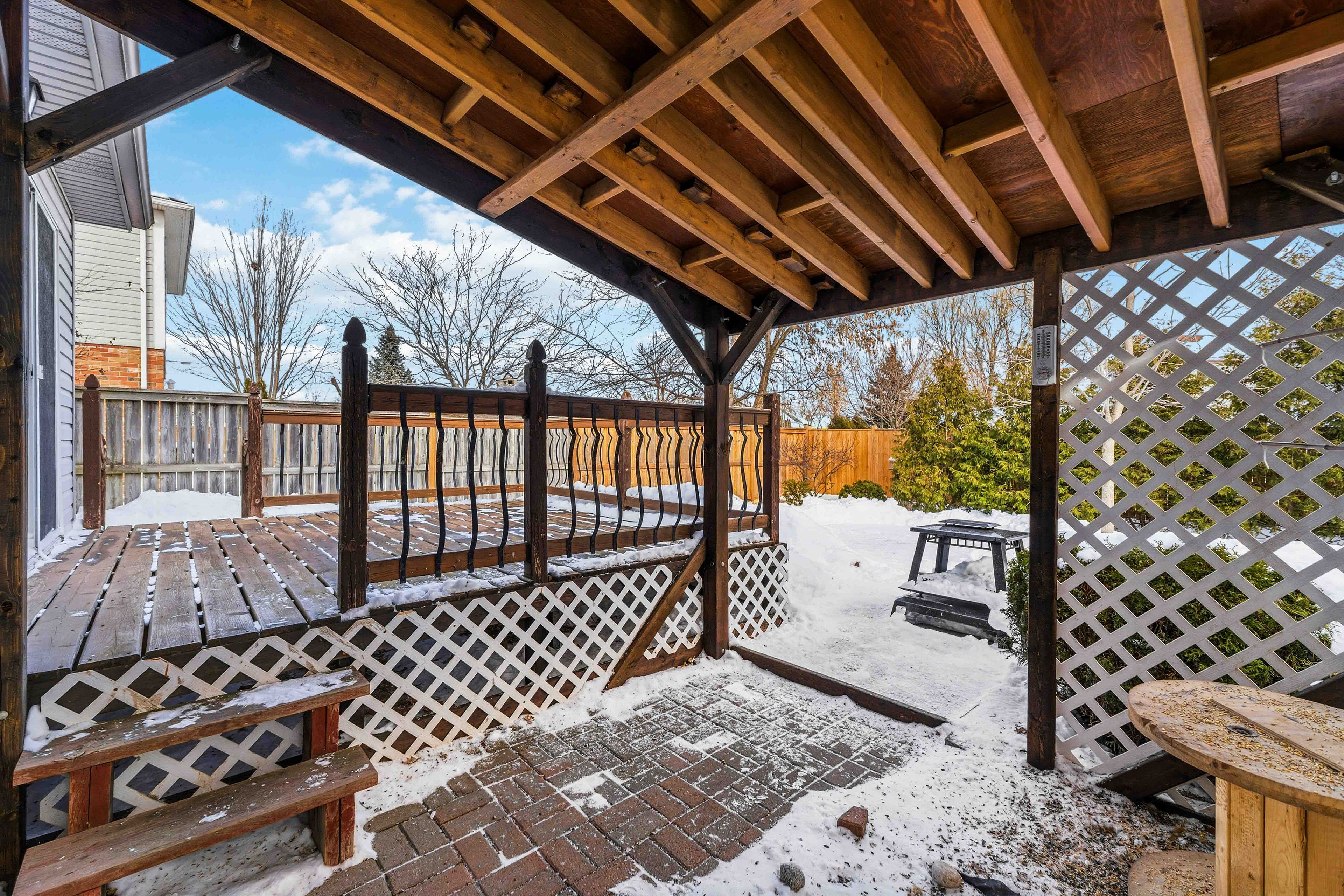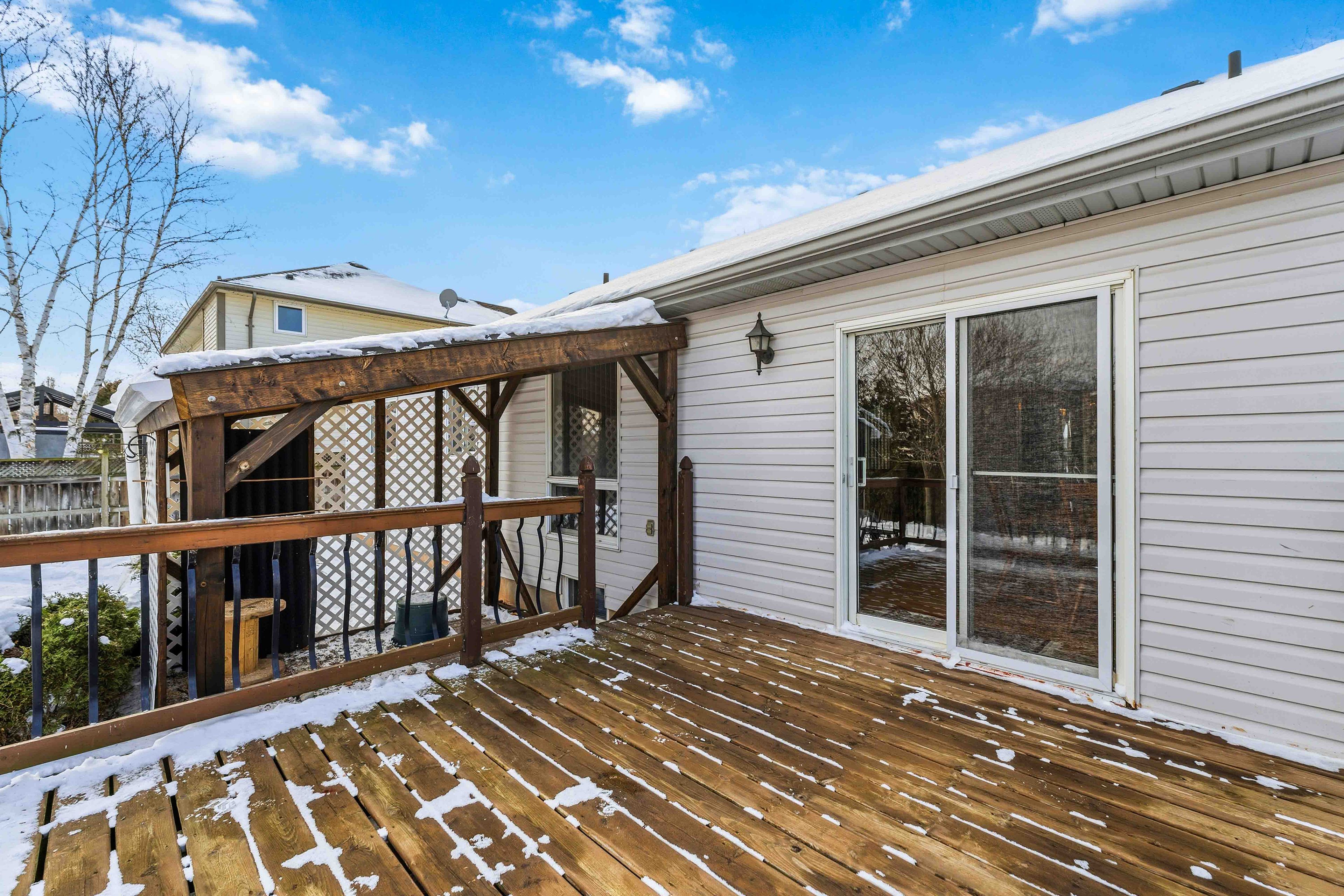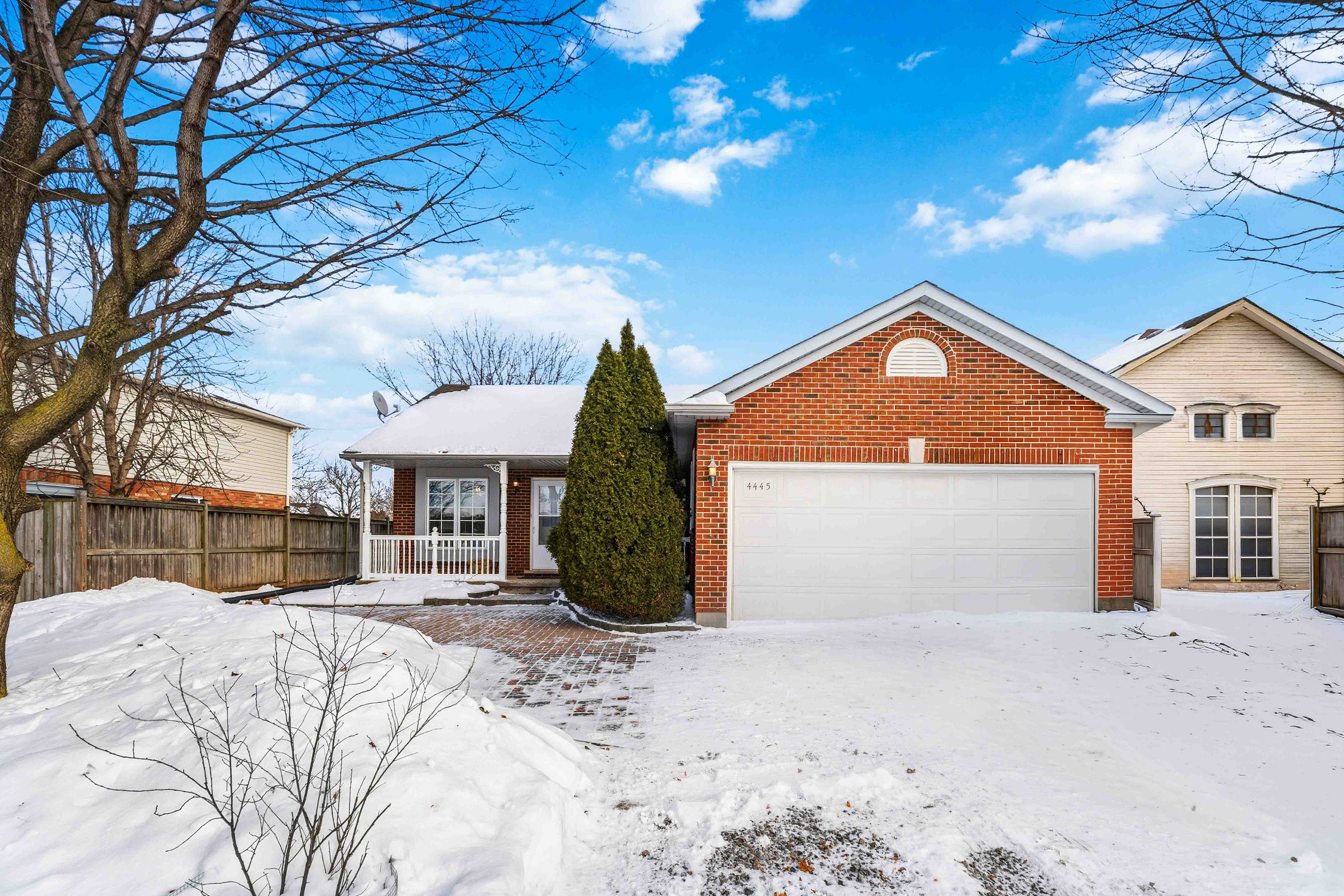 Welcome to this extremely well maintained 1183sqft solid bungalow in the heart of wine country. Vaulted ceilings, functional layout, double garage, finished basement, wide lot & numerous updates throughout! Brick & vinyl exterior, maintenance-free porch railing, and a generous driveway offer easy curb appeal. The main level features a tiled foyer with vaulted ceiling, a bright eat-in kitchen with tile flooring and backsplash, and open concept living and dining areas. The living room includes built-in plant shelving & an 11'4" vaulted ceiling peak. Sliding doors from the dining area lead to the deck & beautiful backyard. Two bedrooms feature dark wood flooring, including the primary with walk-in closet & private ensuite. A main-floor office with french doors and built-in storage provides flexible living space. Inside access from the double car garage. The finished basement offers ample space with a recently replaced sump pump. Oak staircase to basement. The outdoor features include a rebuilt deck (2017), pergola with stone patio (2021), rebuilt shed (2022), and tested drainage system with emergency sump bypass. Roof replaced in 2018. Insulated & drywalled garage with double-walled insulated door.