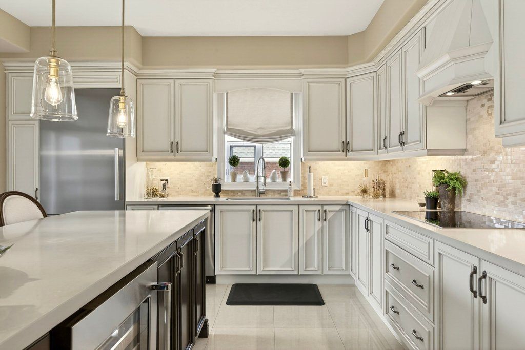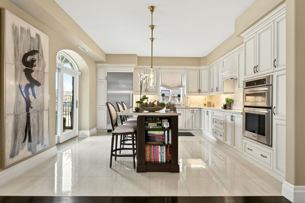 • Custom kitchen with quartz countertops and stainless steel appliances.