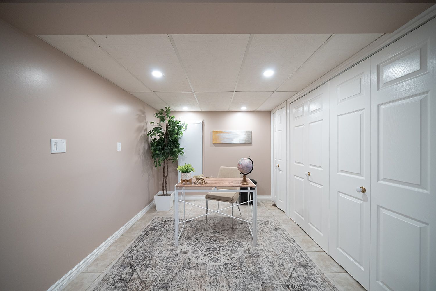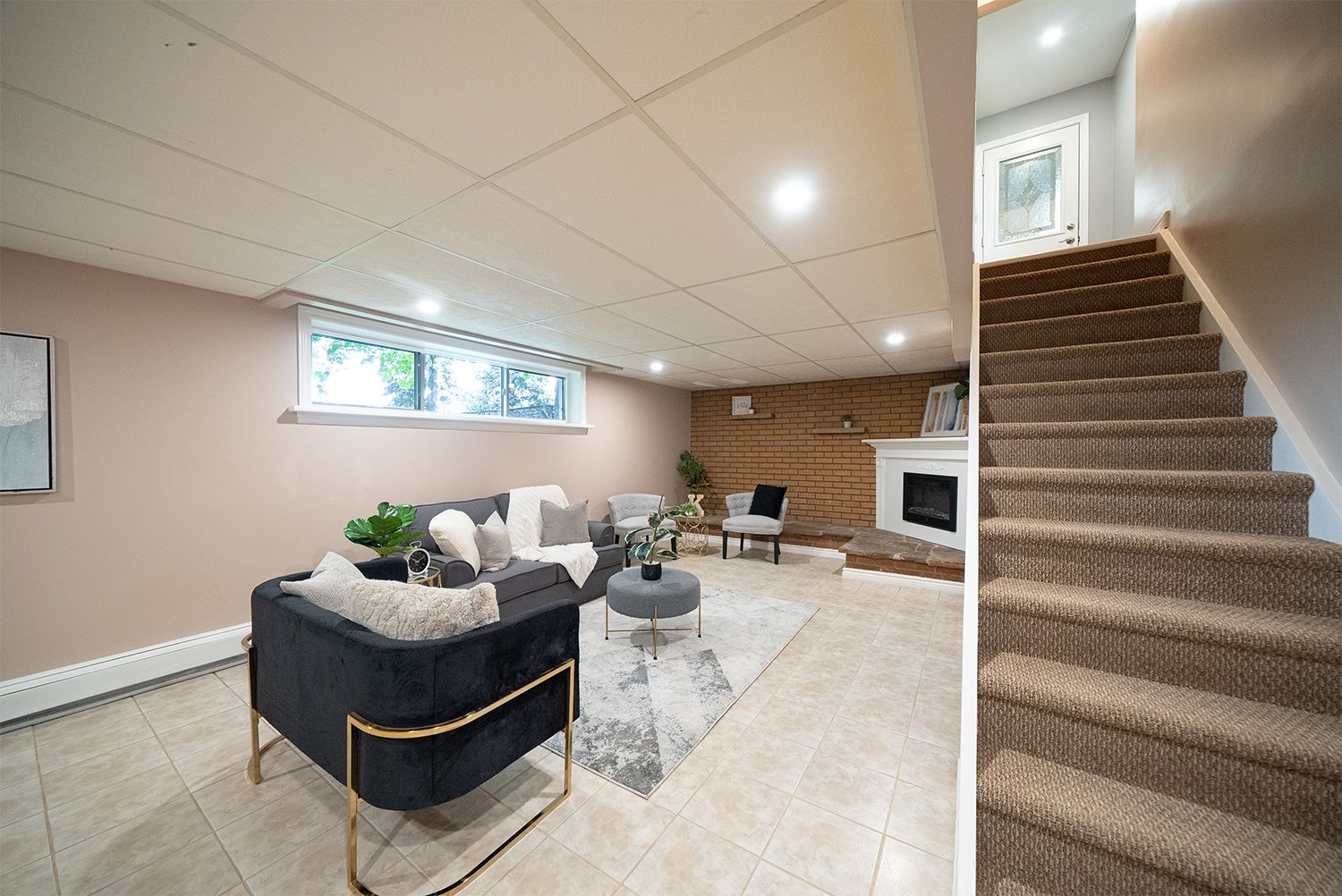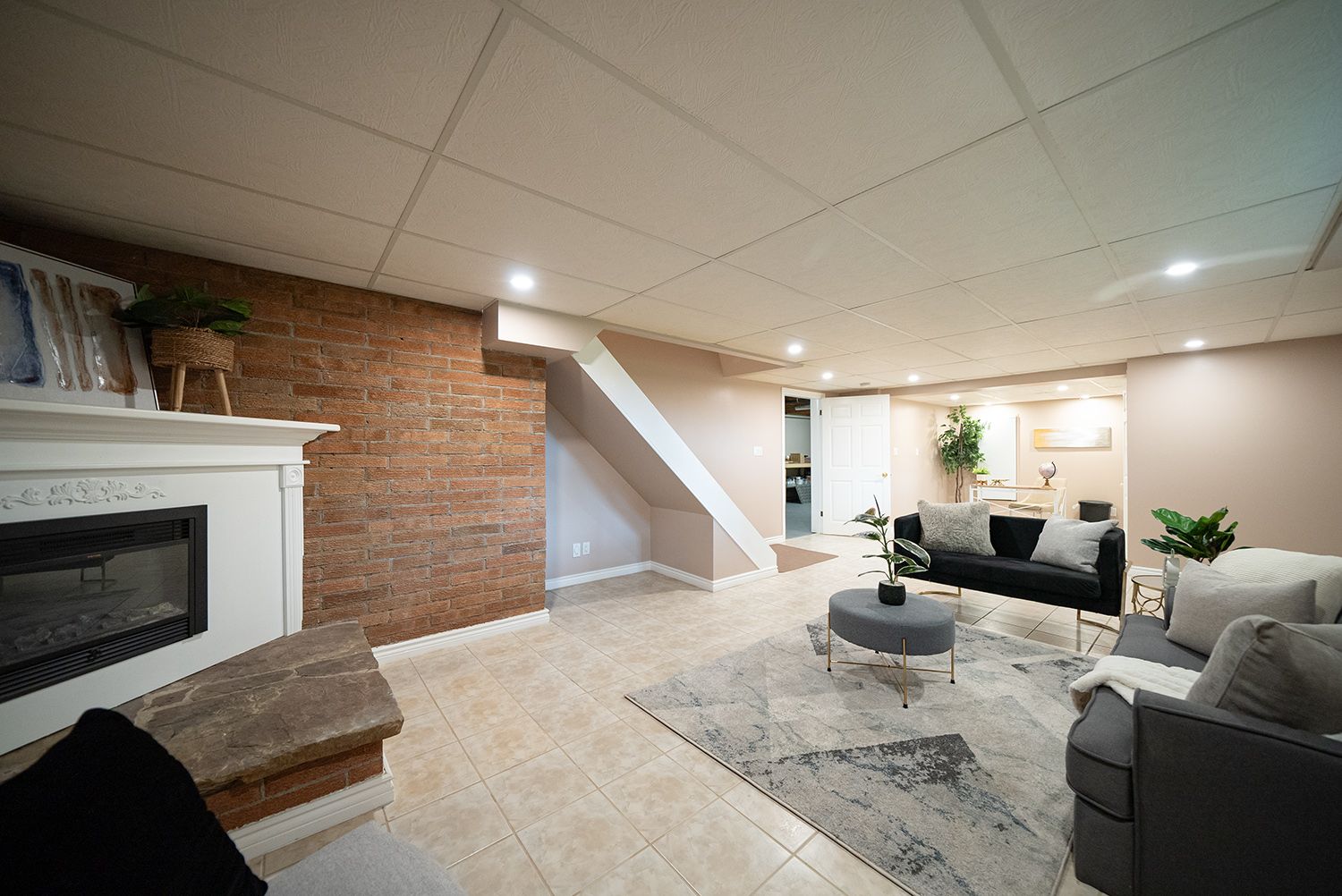 • Finished basement with a recreation room, gas fireplace, and office space.