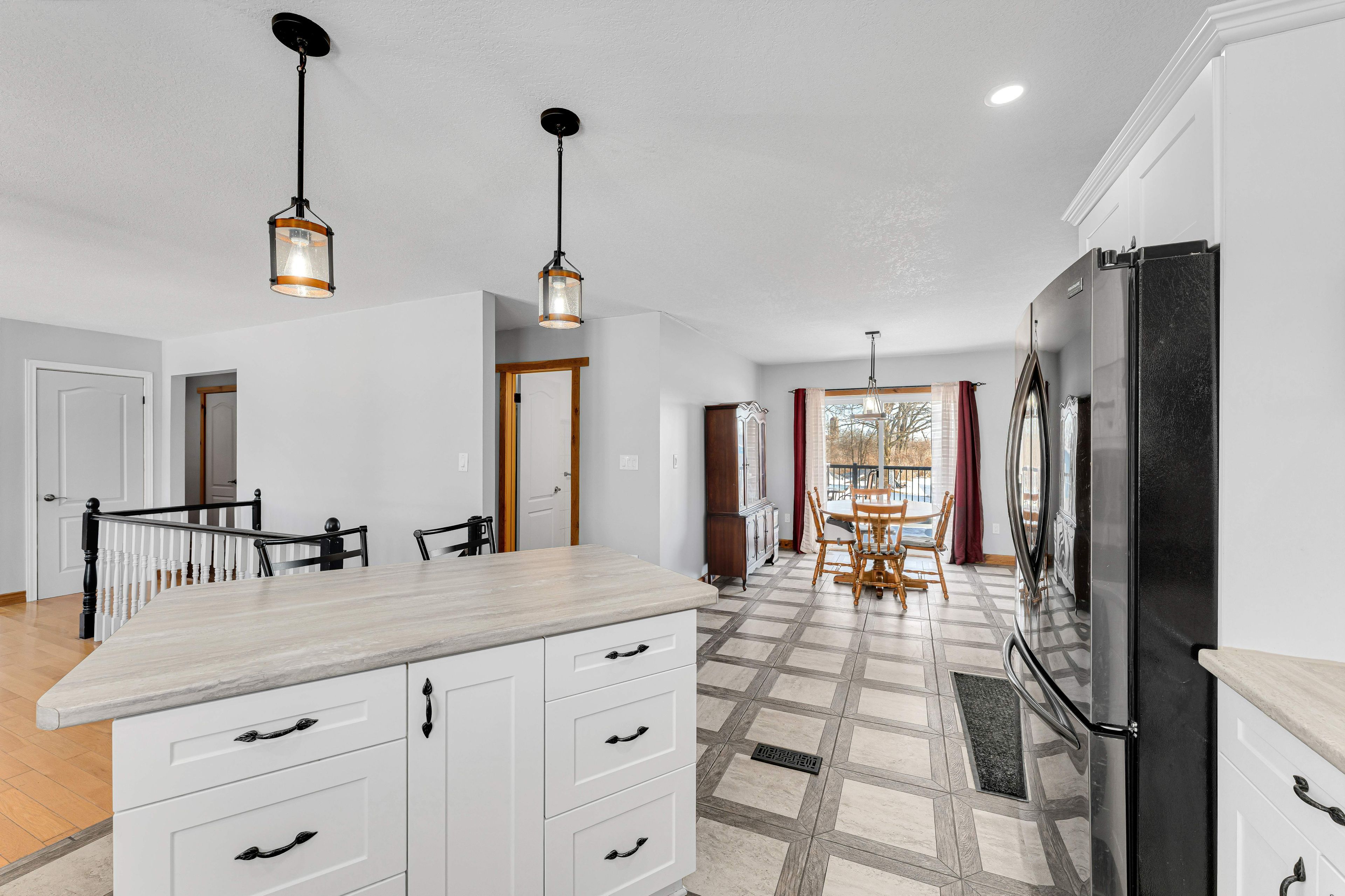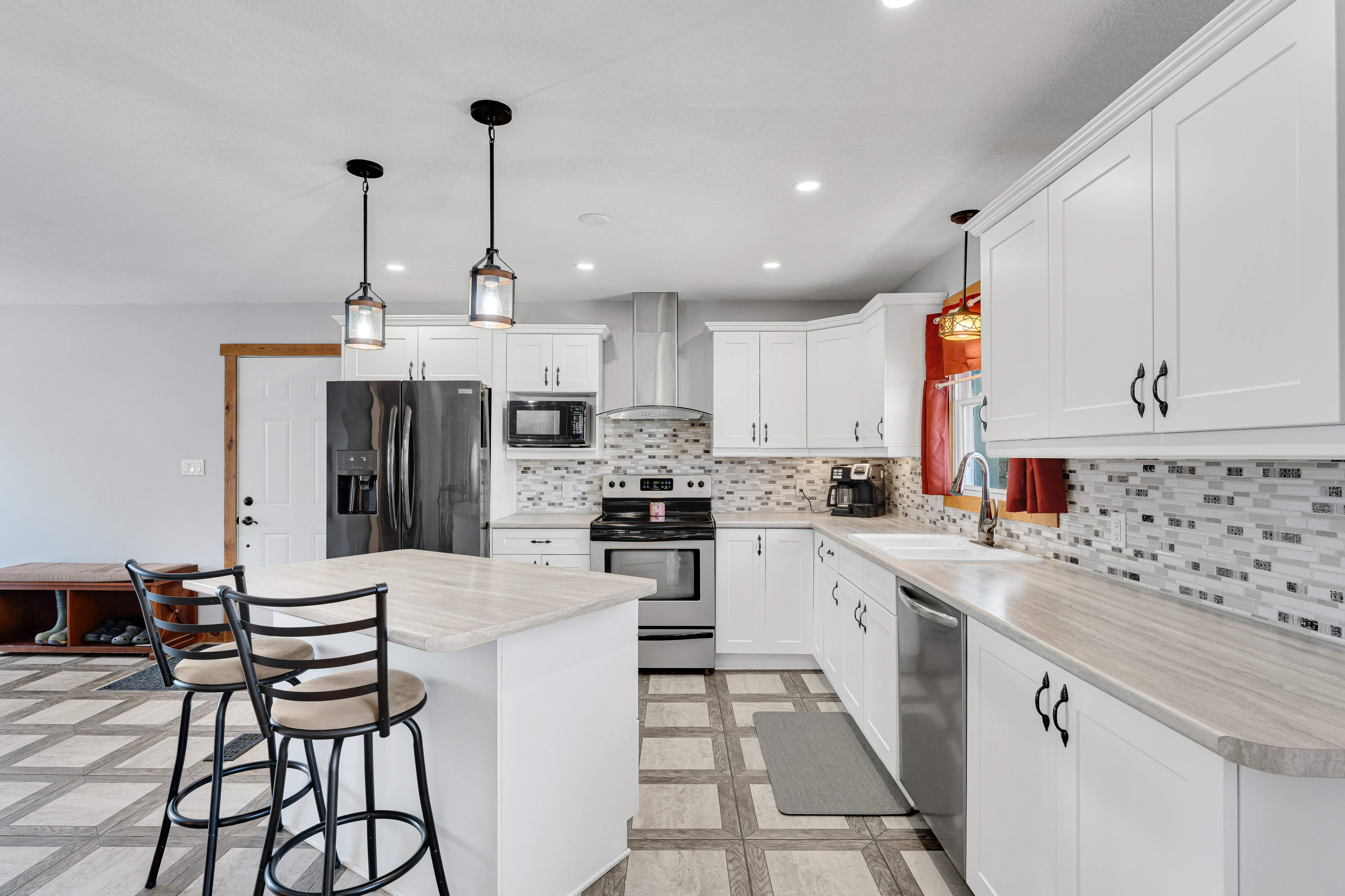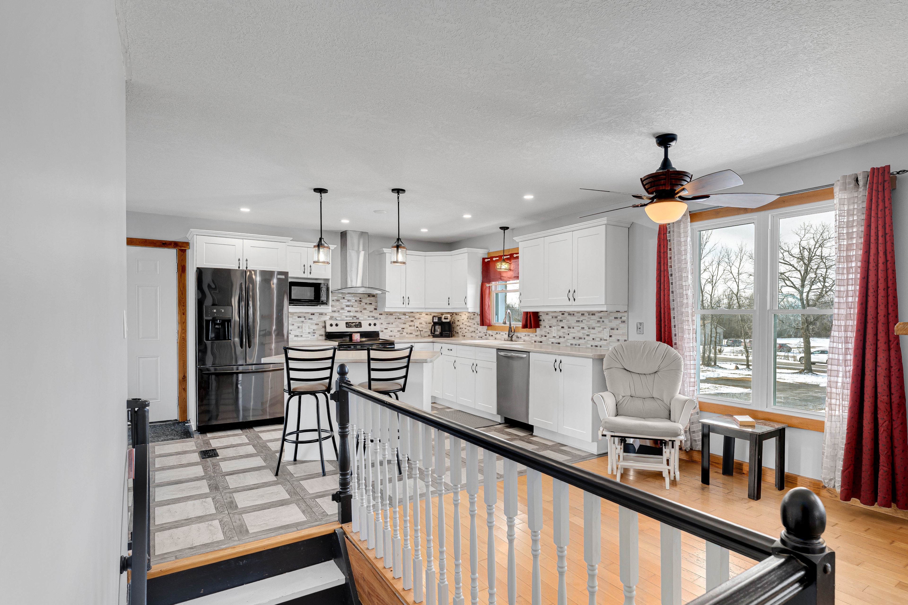 • Updated kitchen boasts an island, dining area, and breakfast nook.