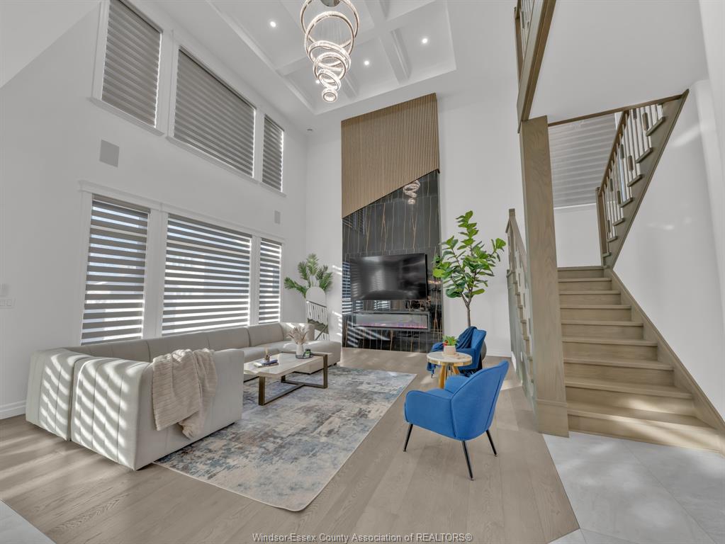 • Bright open-concept main floor with modern fireplace and chef-inspired kitchen.