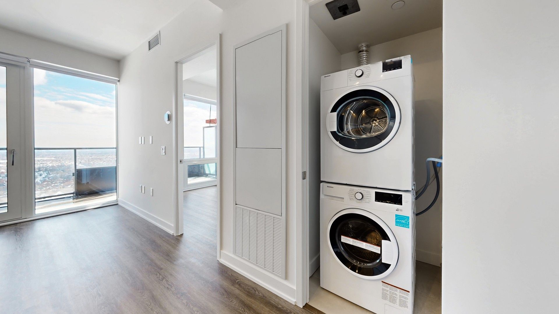 Stunning brand new 1 bedroom + den suite on the 19th floor, conveniently located at m3 at m city, one of the most highly anticipated luxury residences in the heart of mississauga's vibrant downtown core. Breathtaking views from the windows & balcony breathtaking clear south views to lake ontario. Thoughtfully designed with modern finishes, floor-to-ceiling windows, and an open-concept layout, this bright and spacious unit provides the perfect blend of comfort and contemporary style. The unit is equipped with a convenient centre island with extended side for convenient dining (add in a couple of bar stools for a convenient dining area!), branded stainless steel kitchen appliances, as well as an in-suite clothes washer and dryer for added convenience. Convenient bright den is perfect for a home office, collector's display den or child's play area. Located in the iconic m3 at m city tower, residents enjoy world-class, 5-star amenities including a state-of-the-art fitness centre, elegant party room, outdoor terrace, concierge service, and more. (some amenities may still be under construction) available for immediate occupancy. Includes free high speed internet for first year of occupancy, 1 underground parking space and 1 storage locker.