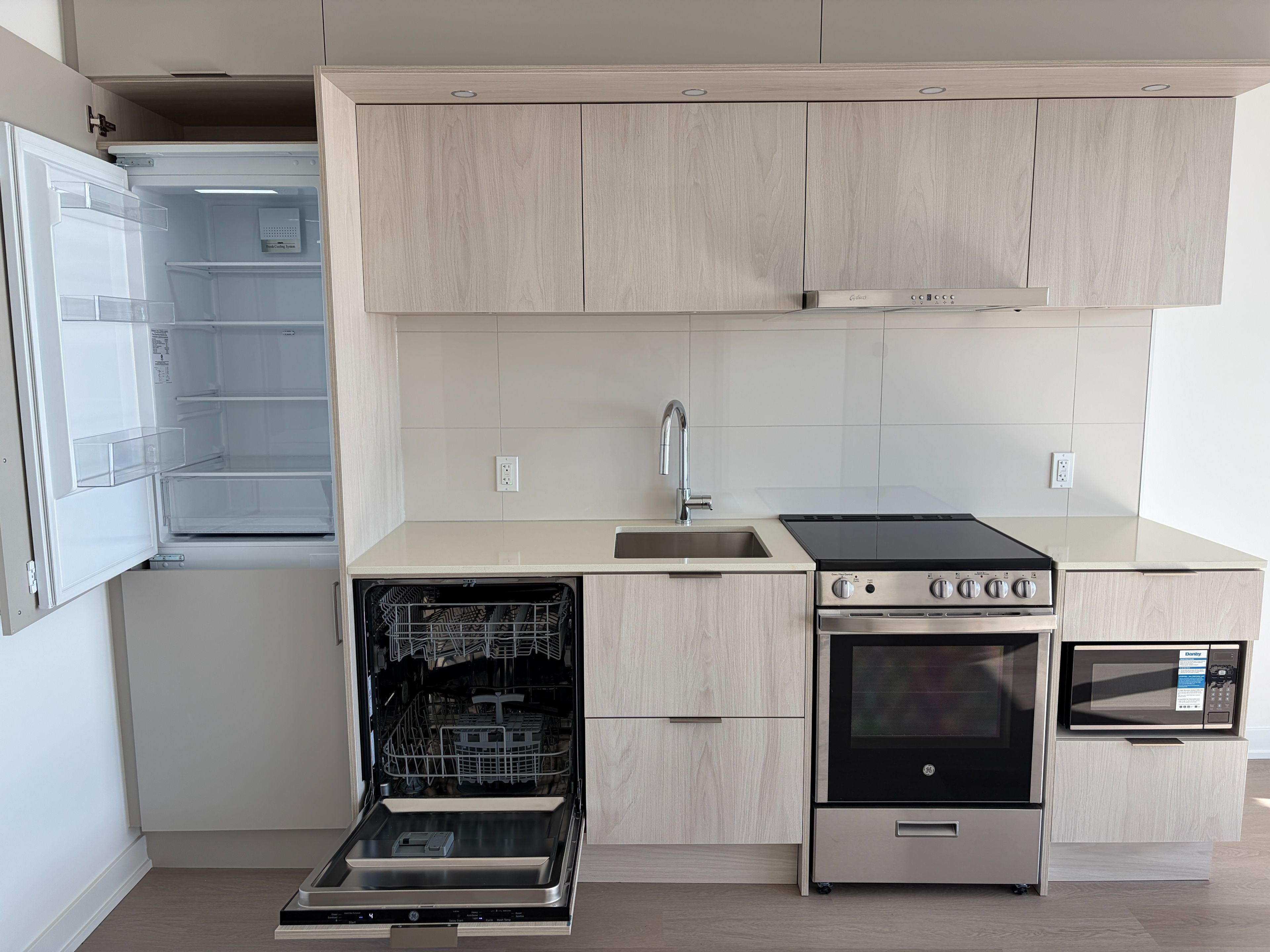 • Sleek kitchen featuring built-in appliances and quartz countertops.