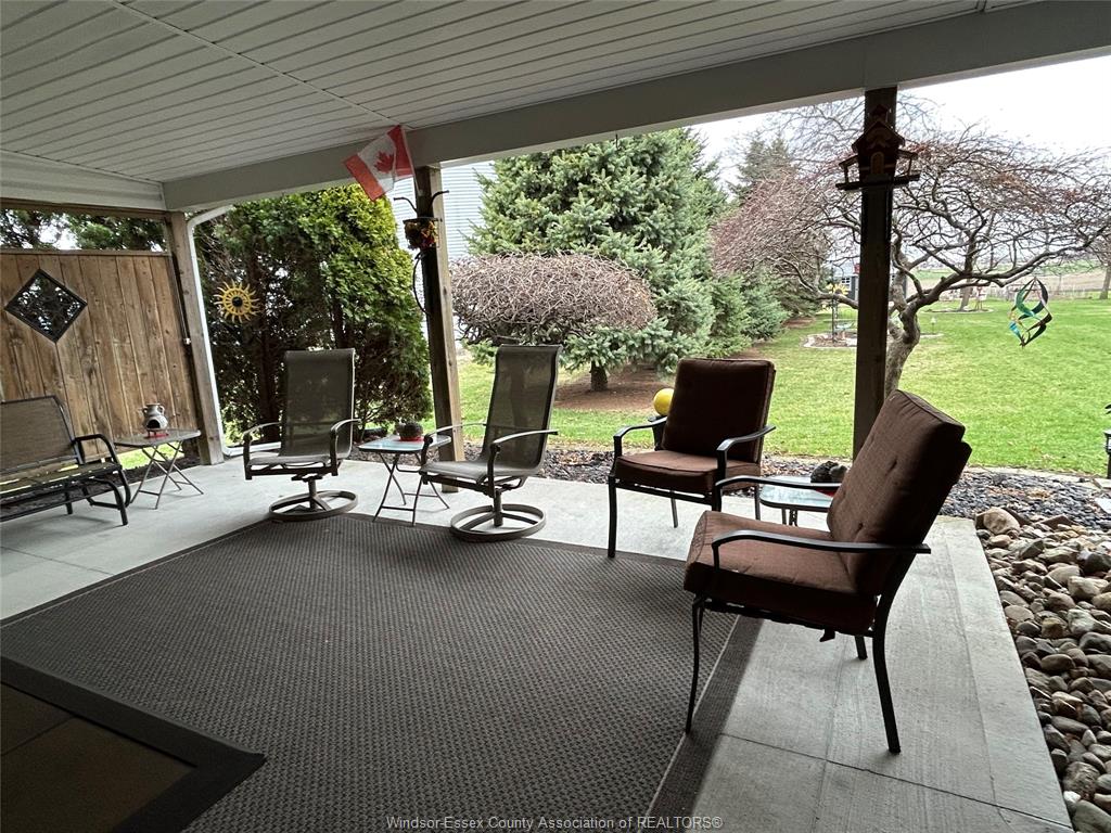 • Covered patio with cement floor, great for outdoor relaxation.