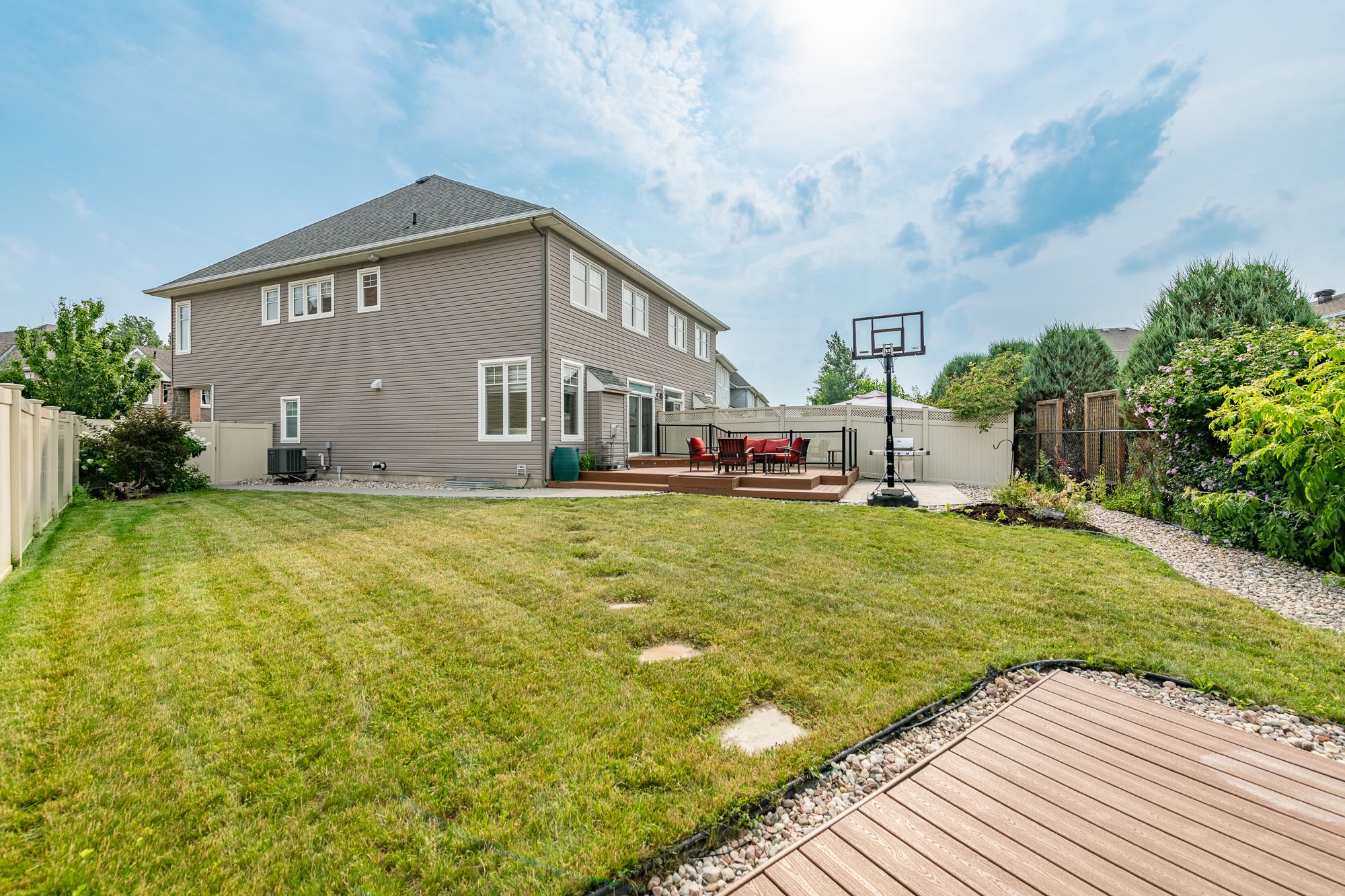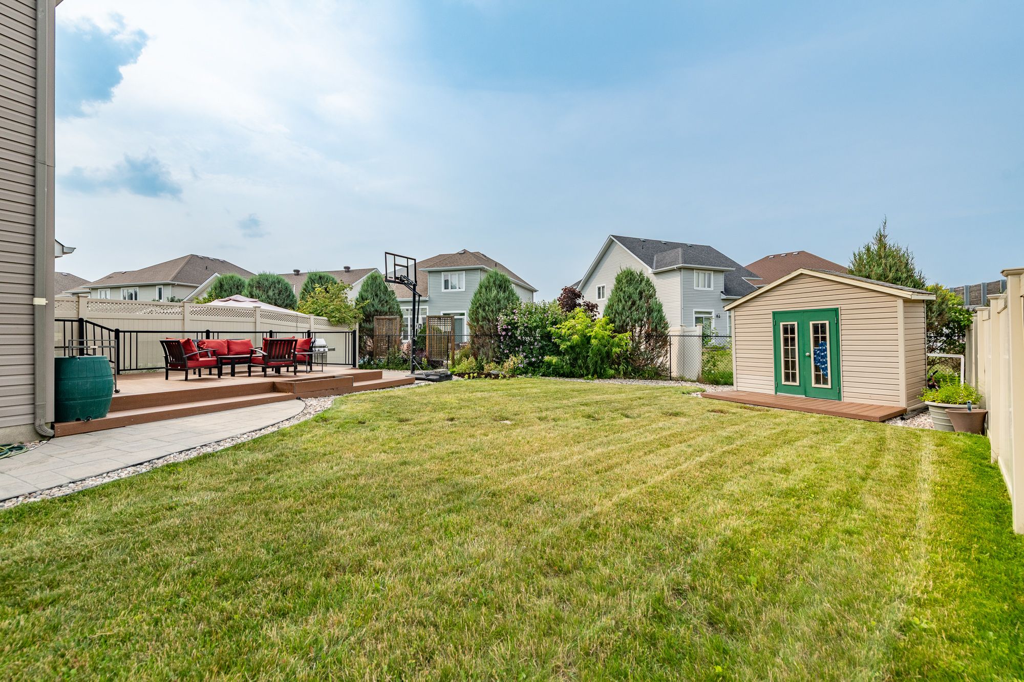 • Low-maintenance backyard with interlock and privacy fencing.