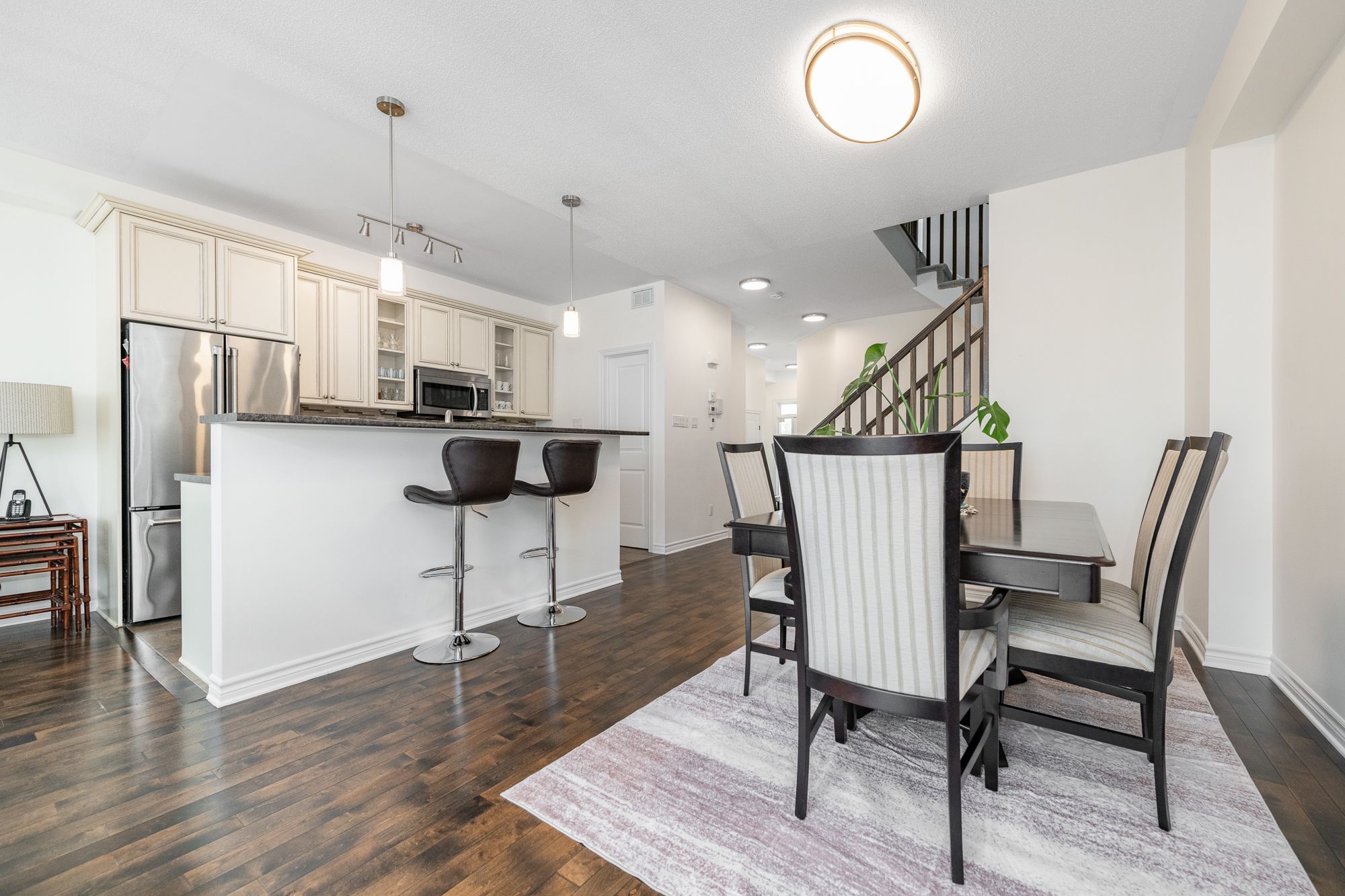 • Modern kitchen with stainless steel appliances and spacious living area.