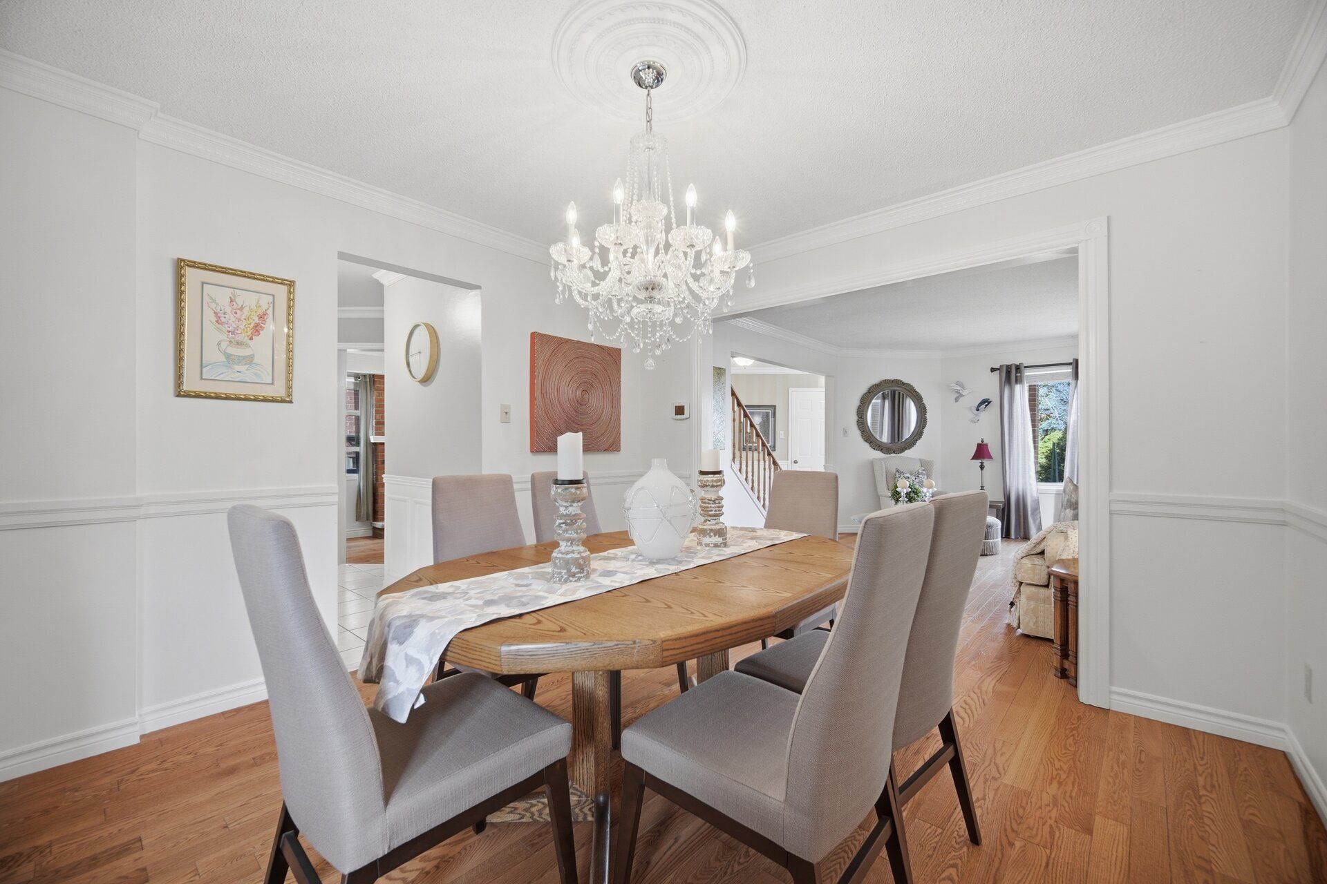 • Large dining room features a stunning Venetian glass-inspired chandelier.