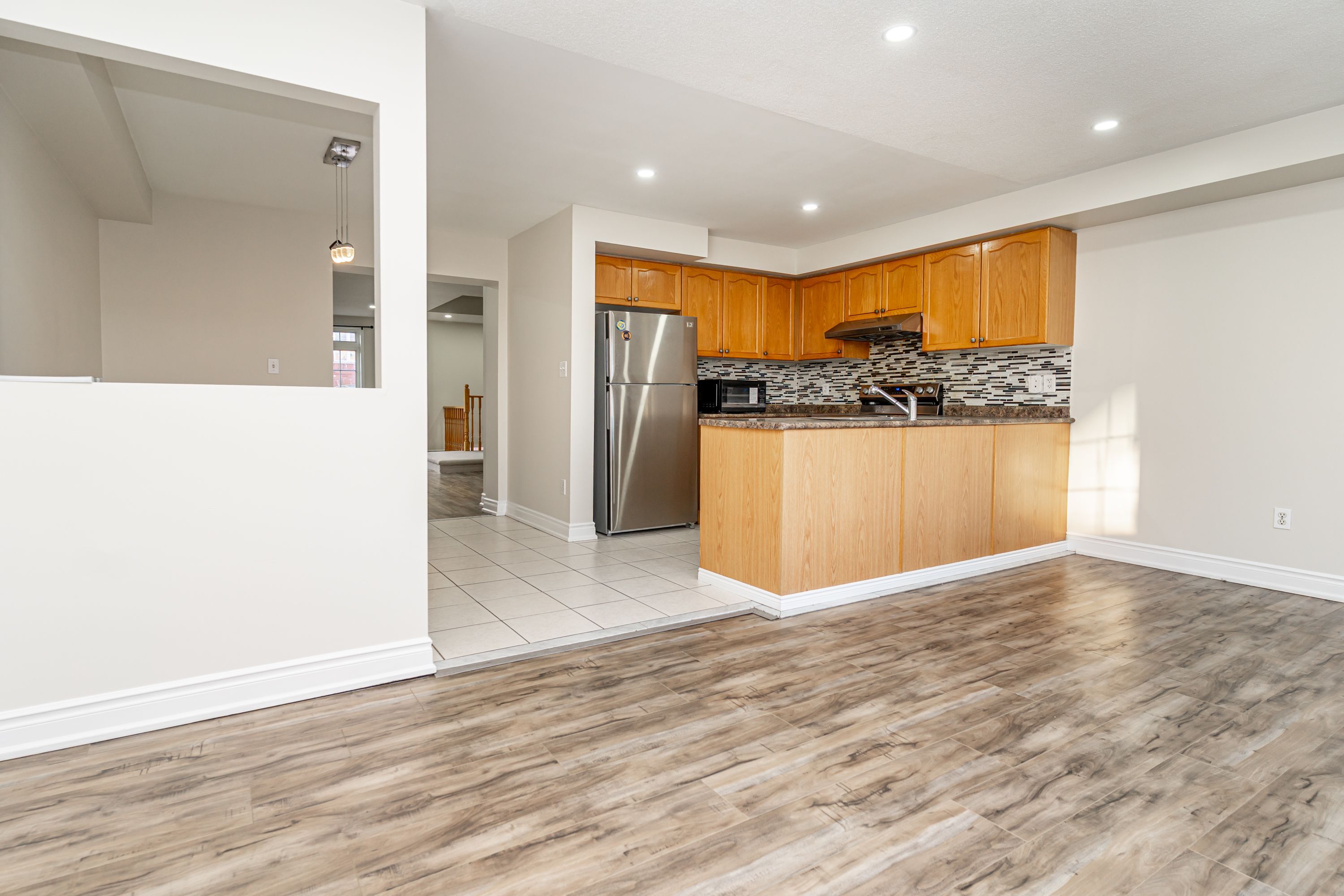 • Modern kitchen features stainless steel appliances and breakfast area.