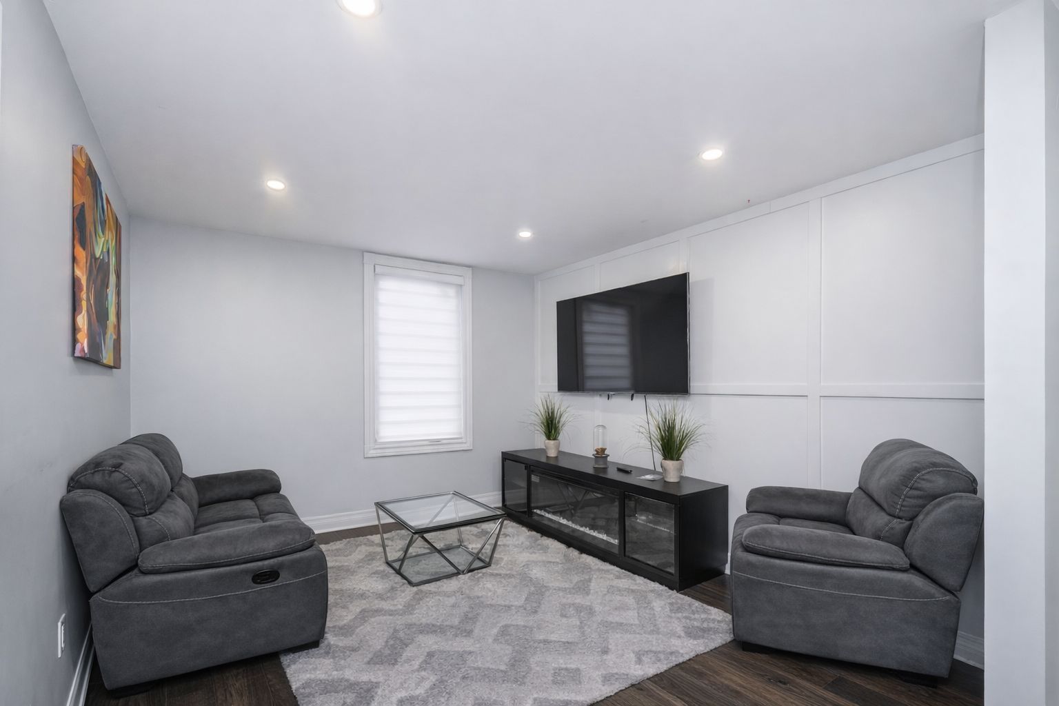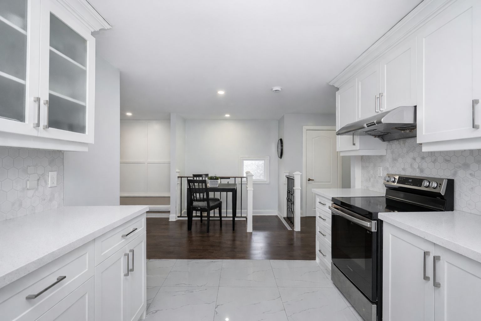 • Open concept living area featuring modern kitchen and stainless steel appliances.