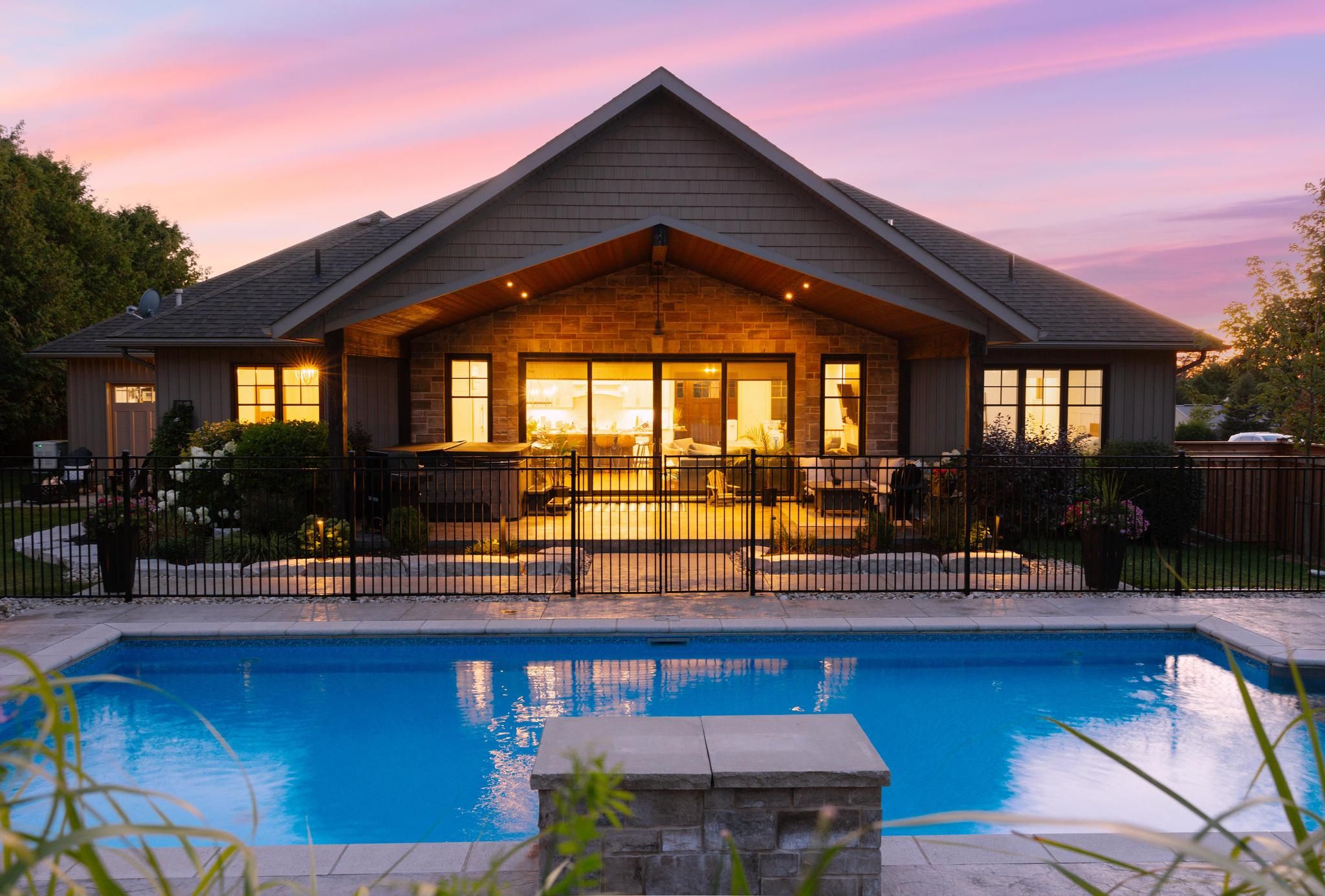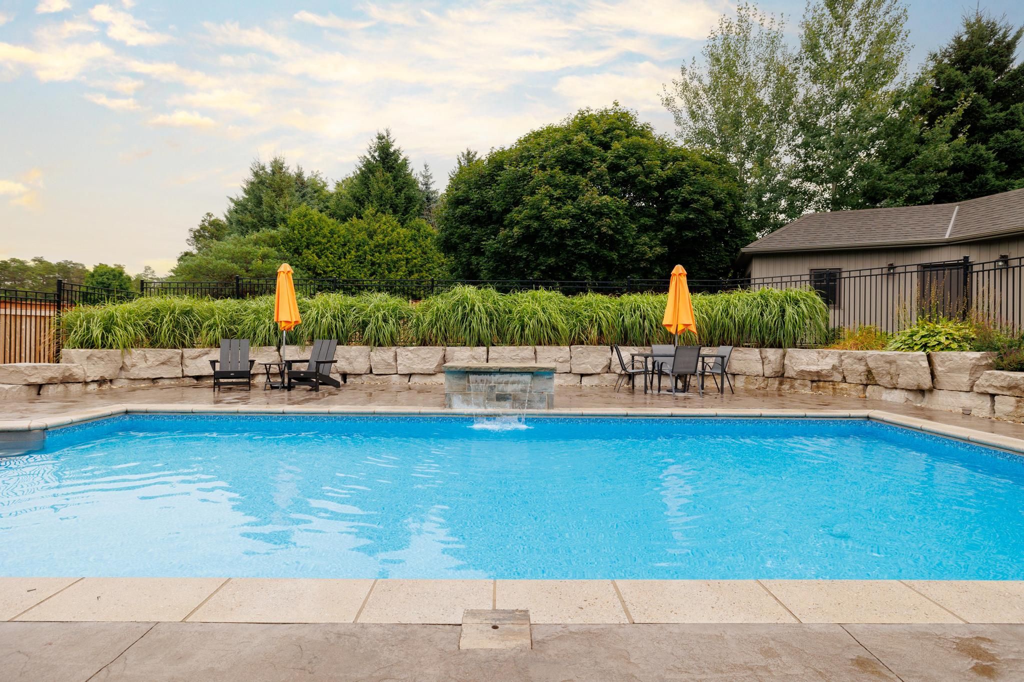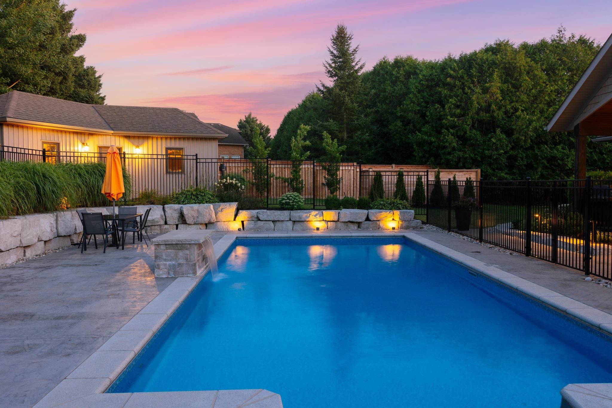 Welcome to 45 amalia crescent, a beautifully designed and custom-built sprawling bungalow offering nearly 5,000 sq ft of finished living space in the heart of belwood. At the center of the home, a chefs kitchen showcases sub-zero appliances, stone countertops, and an induction range by fulgo milano. The open concept living room features a gorgeous gas fireplace bookended with custom millwork, wall to wall windows with remote-operated treatments. The primary suite provides a large walk in closet with built-ins, and a spa-inspired ensuite with heated floors, a freestanding tub, and a dual rain shower. Main floor laundry keeps the layout practical while the finished lower level offers 2 additional bedrooms, 9ft ceilings, a home gym, large living area, a bonus guest room, ample storage, and in-floor heating throughout. Follow the 16ft sliding glass doors to the backyard oasis where you'll find a 16x34ft inground saltwater pool with waterfall, new hot tub, covered living space, drive-in pool shed, and an abundance of natural stone and professional landscaping work. Truly the perfect setting for both relaxation and entertaining. No detail was missed here with a full home back-up power generac system, gas bbq line, heated triple garage with a 4th bay door at the rear for easy mowing, irrigation lines, a fully fenced yard and separate rod-iron fenced pool area for ultimate safety. Surrounded by walking trails, belwood lake, and the charm of local favourites like belwood country market and joanies restaurant, this property offers an ideal blend of small-town living and resort-style luxury just a short drive from fergus for day to day essentials.