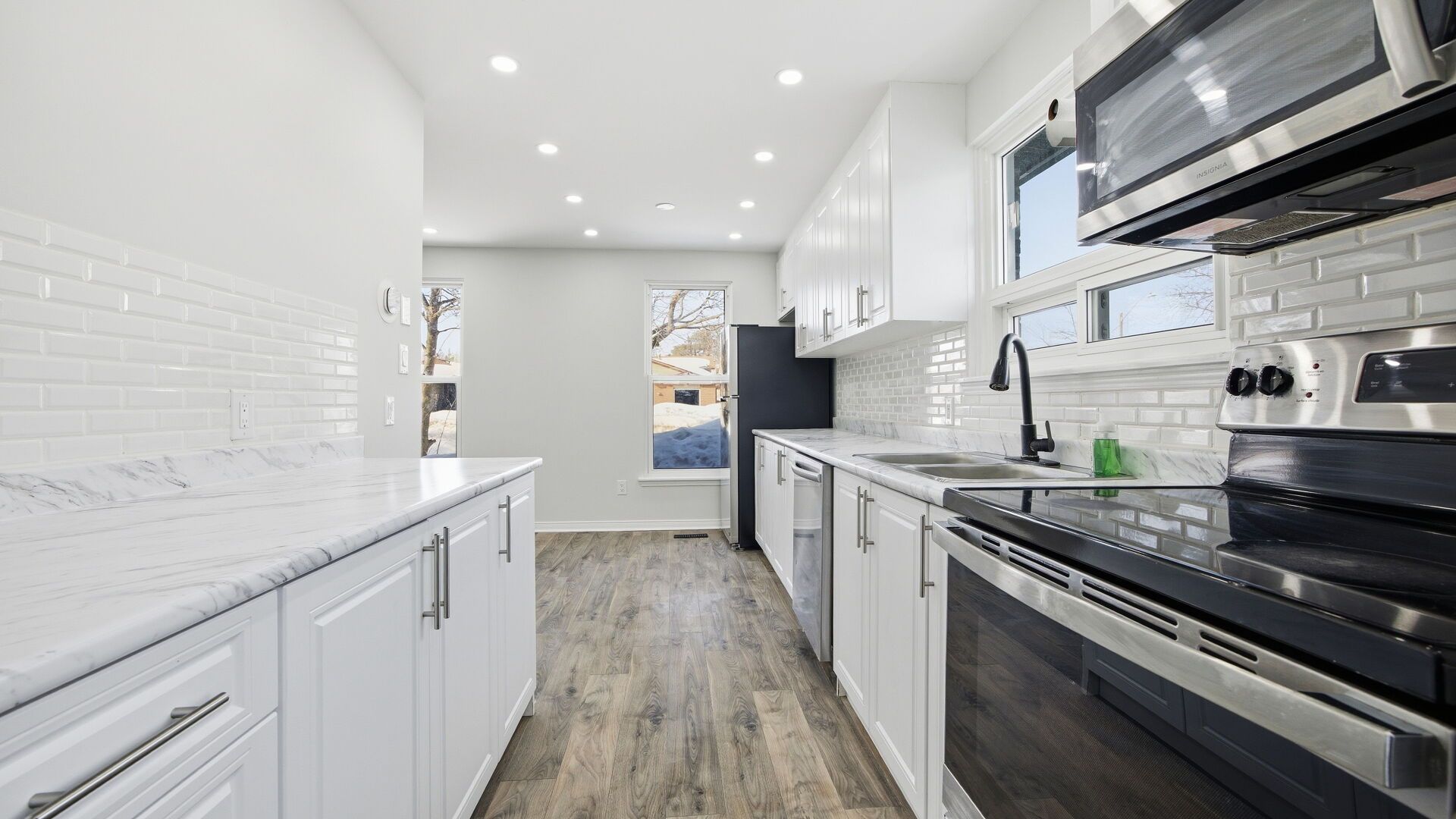 Welcome to 45 austen lane, barrie - a fully detached 4-level backsplit offering approximately 1,800 sq. Ft. Of versatile living space, ideal for first-time buyers, growing families, or investors. Conveniently located with quick access to highway 400, this home is close to schools, recreation centres, shopping, restaurants, and public transit. Step inside to a bright living room featuring a cozy wood-burning fireplace, creating a warm and inviting space for relaxing or entertaining. The renovated kitchen offers updated cabinetry, modern countertops, and newer stainless-steel appliances, providing plenty of room for everyday cooking and family gatherings. The upper level features spacious bedrooms, including a primary bedroom with a walk-in closet and a second bedroom with double closets, along with a fully updated bathroom (2026). The lower level adds two additional bedrooms and another updated bathroom (2026), offering flexible space for extended family, guests, or a home office. The finished basement includes additional living space and a laundry area with kitchenette, creating excellent in-law or multi-generational living potential. Extensive upgrades make this home move-in ready, including new flooring, fresh paint, modern pot lights, and a stylish glass entry door (2026). Major improvements include new windows (2024), gutters and fascia (2024), durable metal roof, and owned furnace & a/c (2022). Parking for up to 4 vehicles on the driveway completes this fantastic opportunity to own a spacious upgraded home in a desirable barrie neighbourhood.