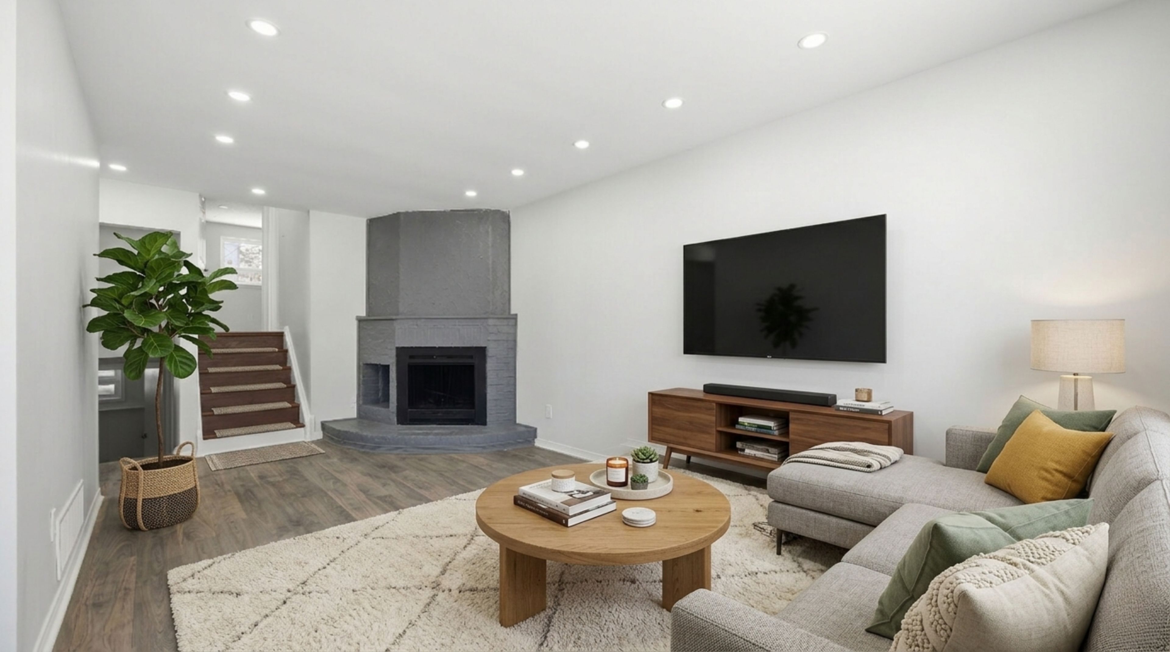 • Bright living room with a cozy wood-burning fireplace.