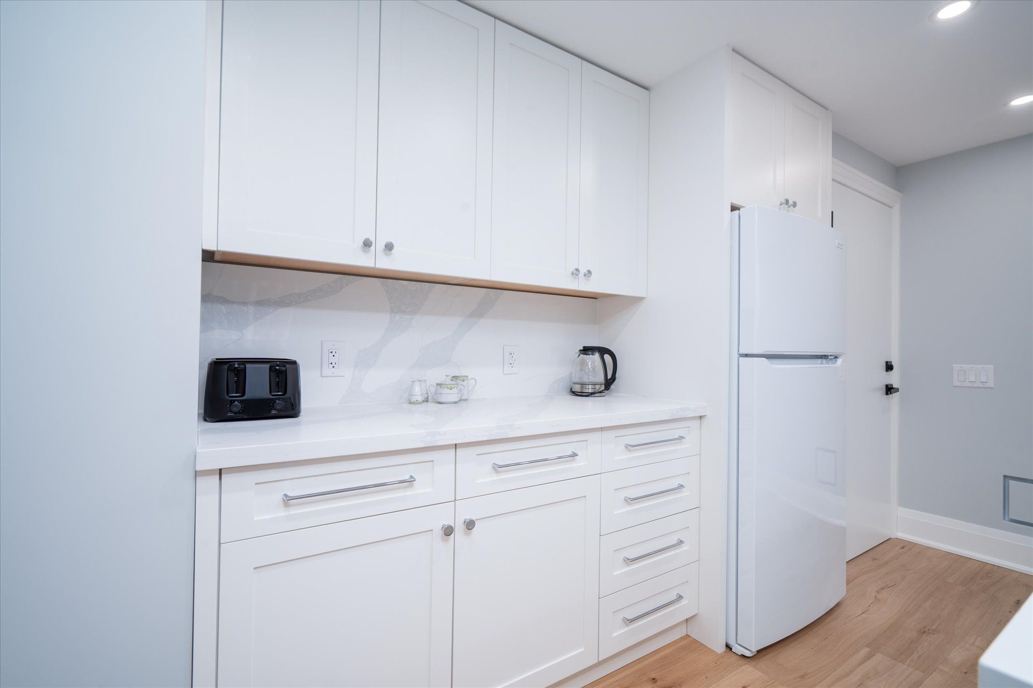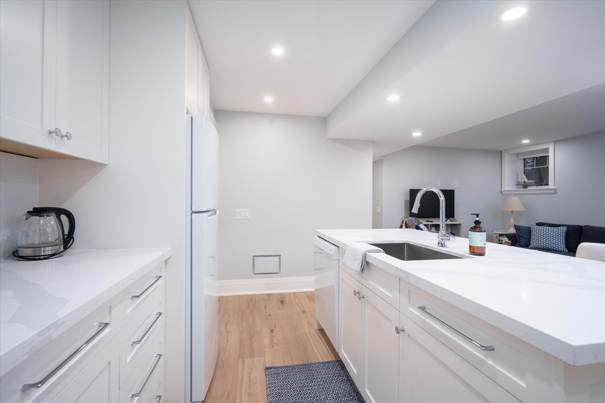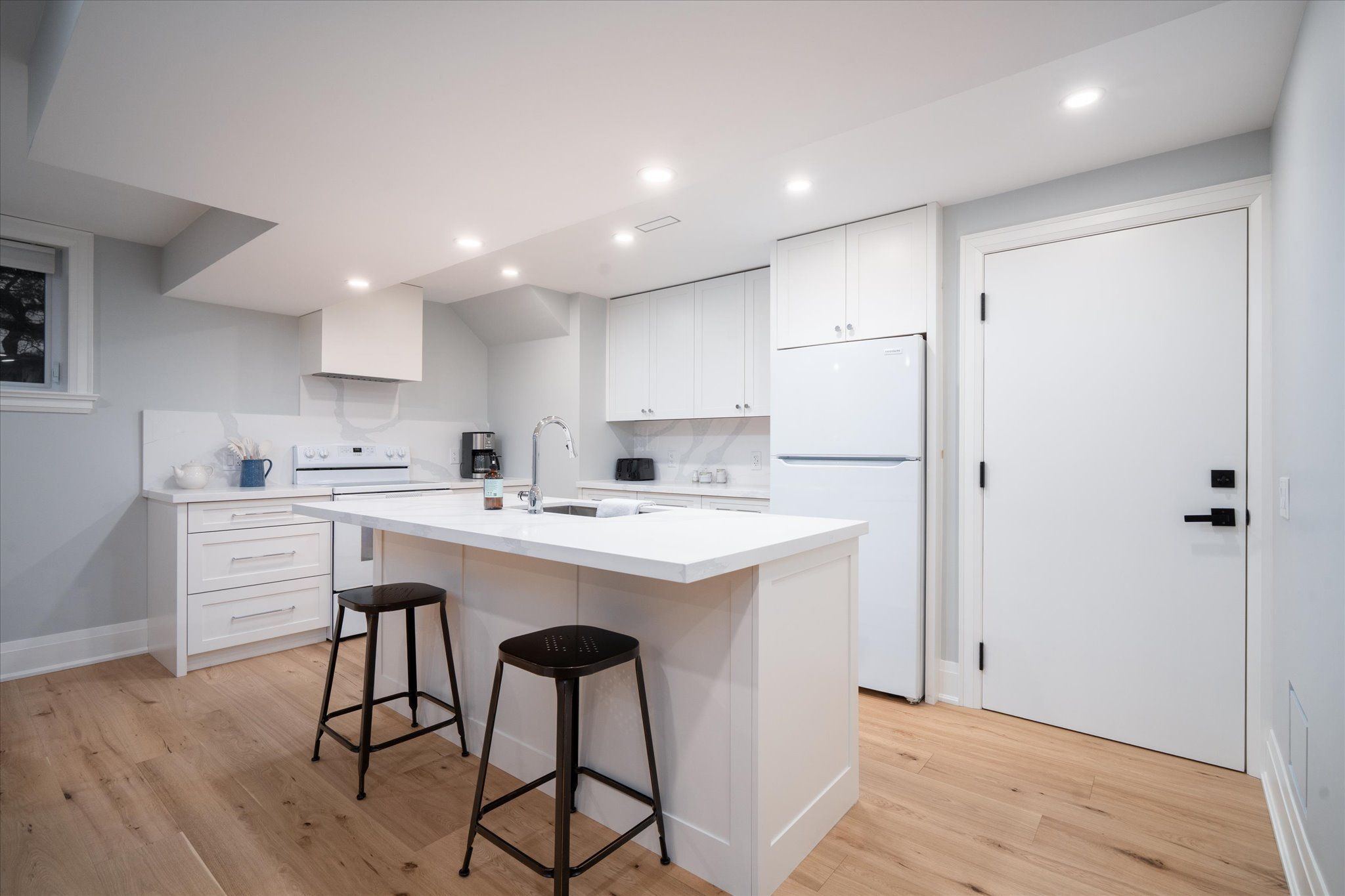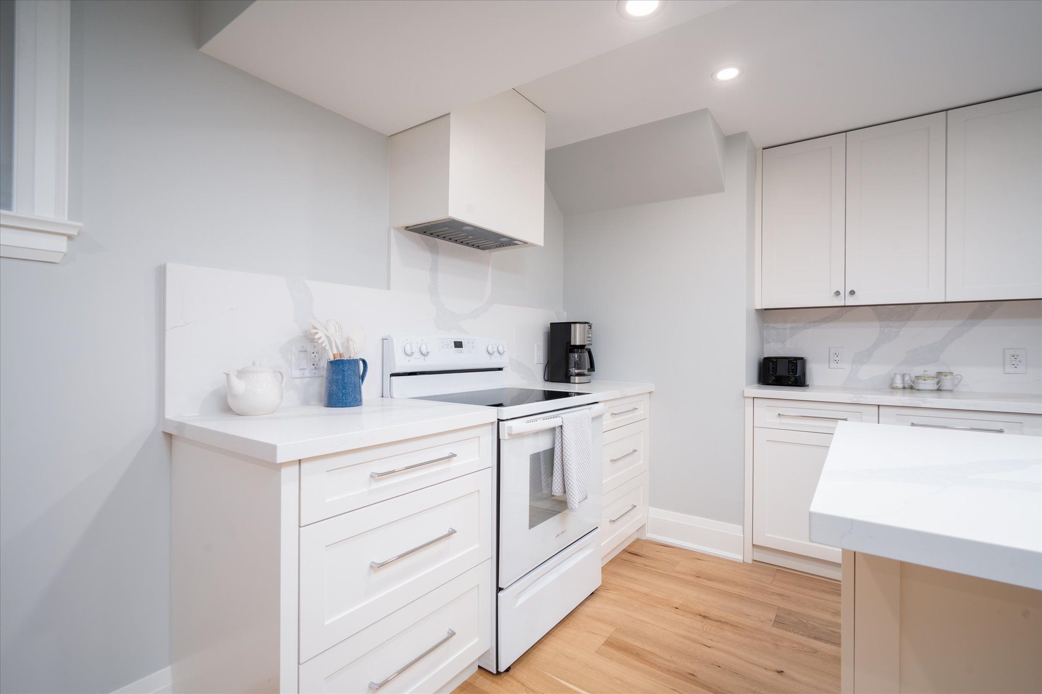 • Chef's kitchen with massive quartz island and high-end appliances.