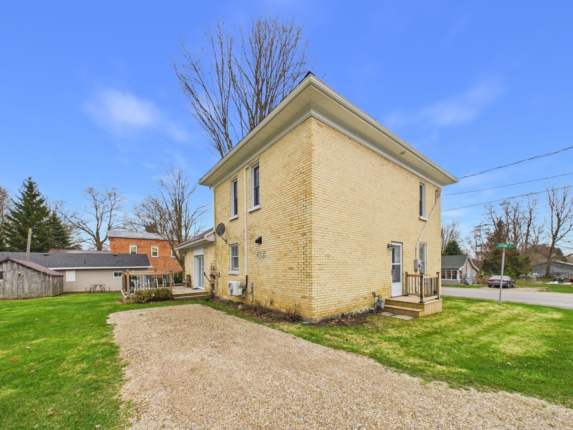 Welcome to 45 clyde street, a stately 2-storey yellow brick home nestled in the charming community of bluevale, ontario. Offering 4 bedrooms and 2 full bathrooms across two thoughtfully updated levels, this property blends timeless character with modern upgrades that today's buyers will appreciate. Step inside to discover a warm and inviting main floor featuring gleaming hardwood floors, a spacious dining room with a chandelier, and a bright living room with a natural gas fireplace - perfect for cozy evenings. The renovated kitchen impresses with crisp white cabinetry, butcher block countertops, a farmhouse sink, subway tile backsplash, gas range with stainless steel hood fan, and elegant marble-look flooring. A generous laundry room and a second living area with direct access to the rear deck round out the main level. Blow-in insulation has been added throughout the main floor for year-round comfort and energy efficiency. The second level has been extensively renovated, featuring new wiring, updated lighting, spray foam insulation, and a beautifully finished 3-piece bathroom. Four well-sized bedrooms offer flexibility for families or guests, and a conveniently located washer/dryer combo unit on the landing adds effortless functionality. Cooling on the second level is handled by a ductless a/c unit, while the primary heat source for the home is a natural gas forced air furnace. Outside, enjoy a good-sized deck overlooking a corner lot, complemented by a storage shed. This move-in-ready home offers exceptional value in a quiet, small-town setting.