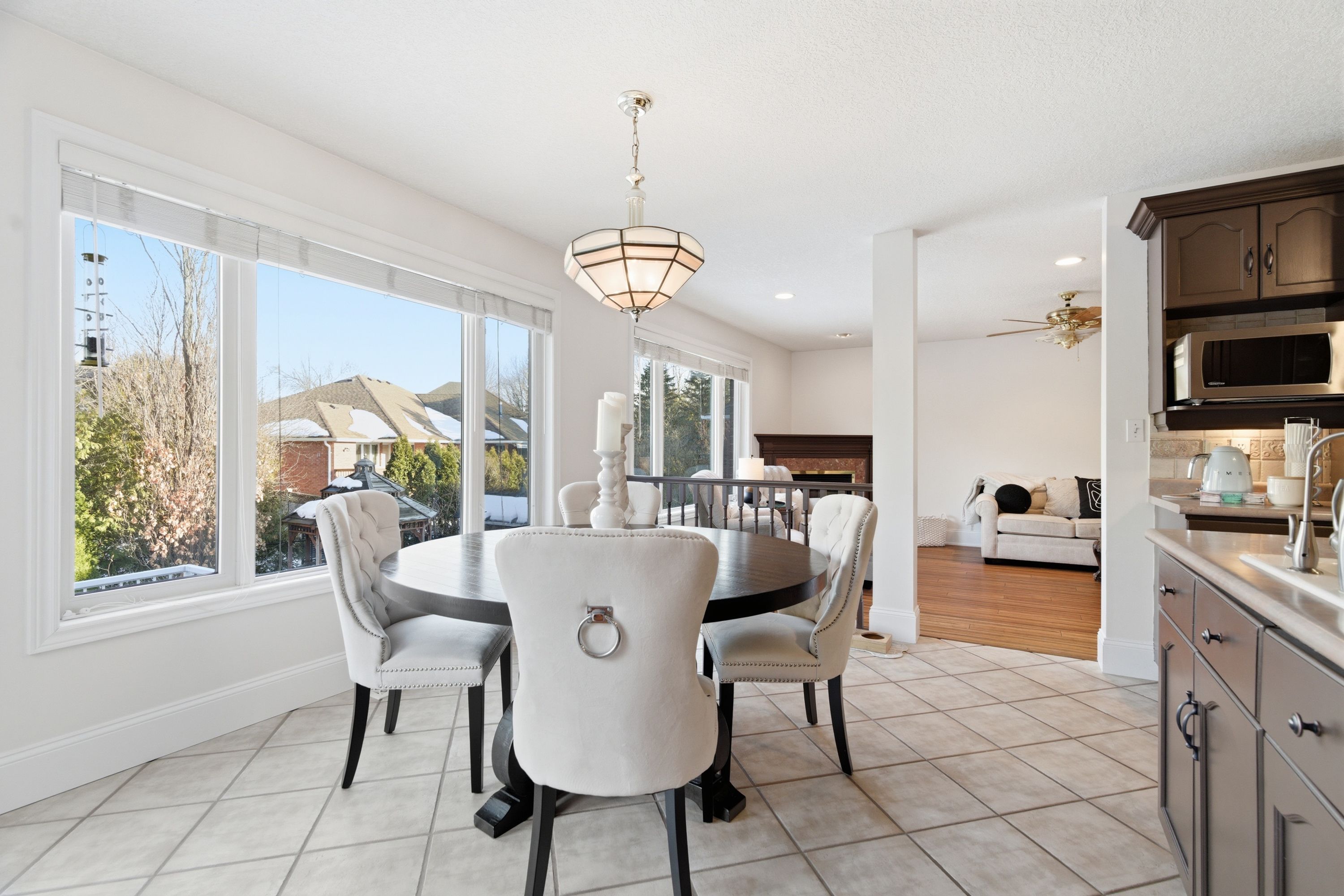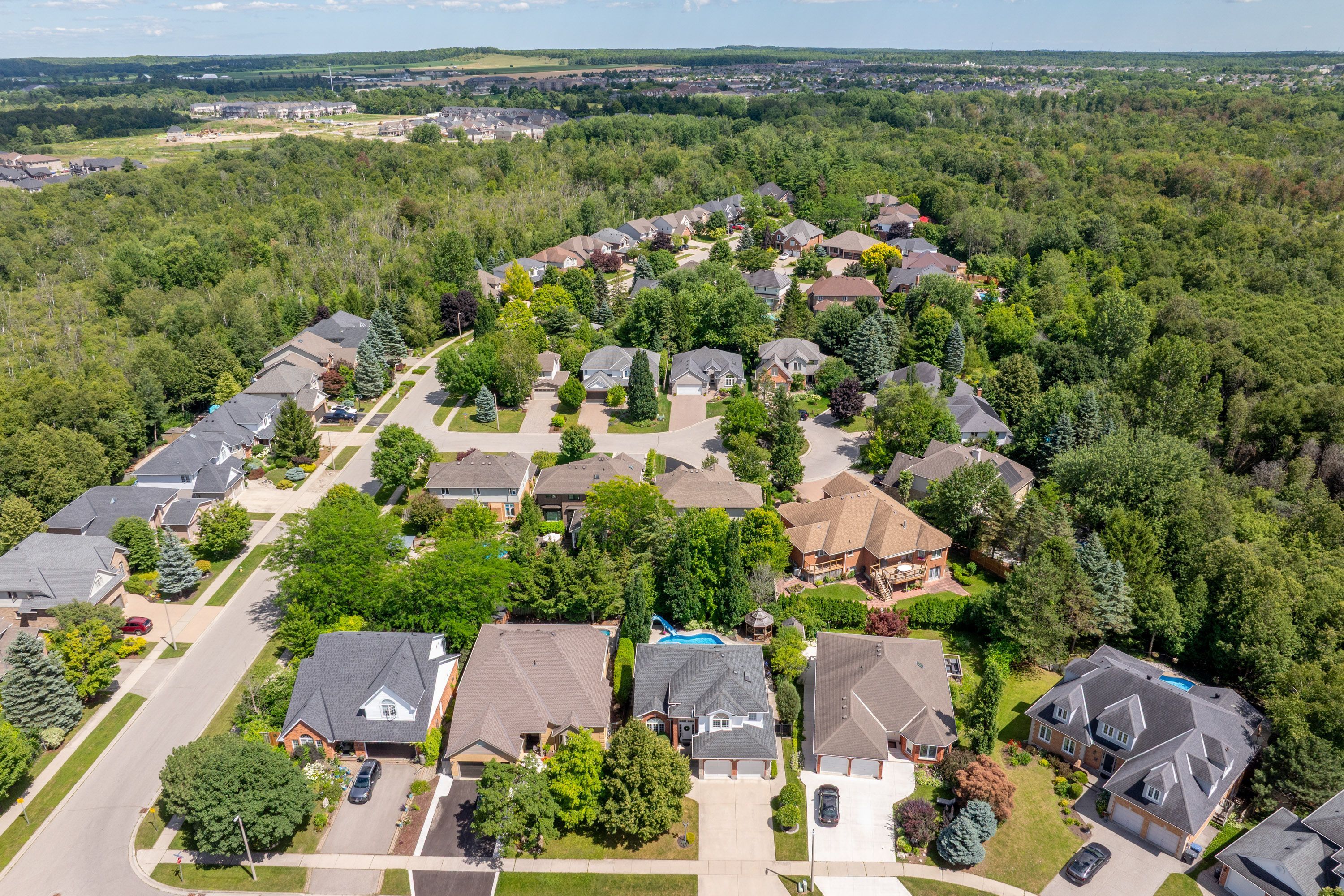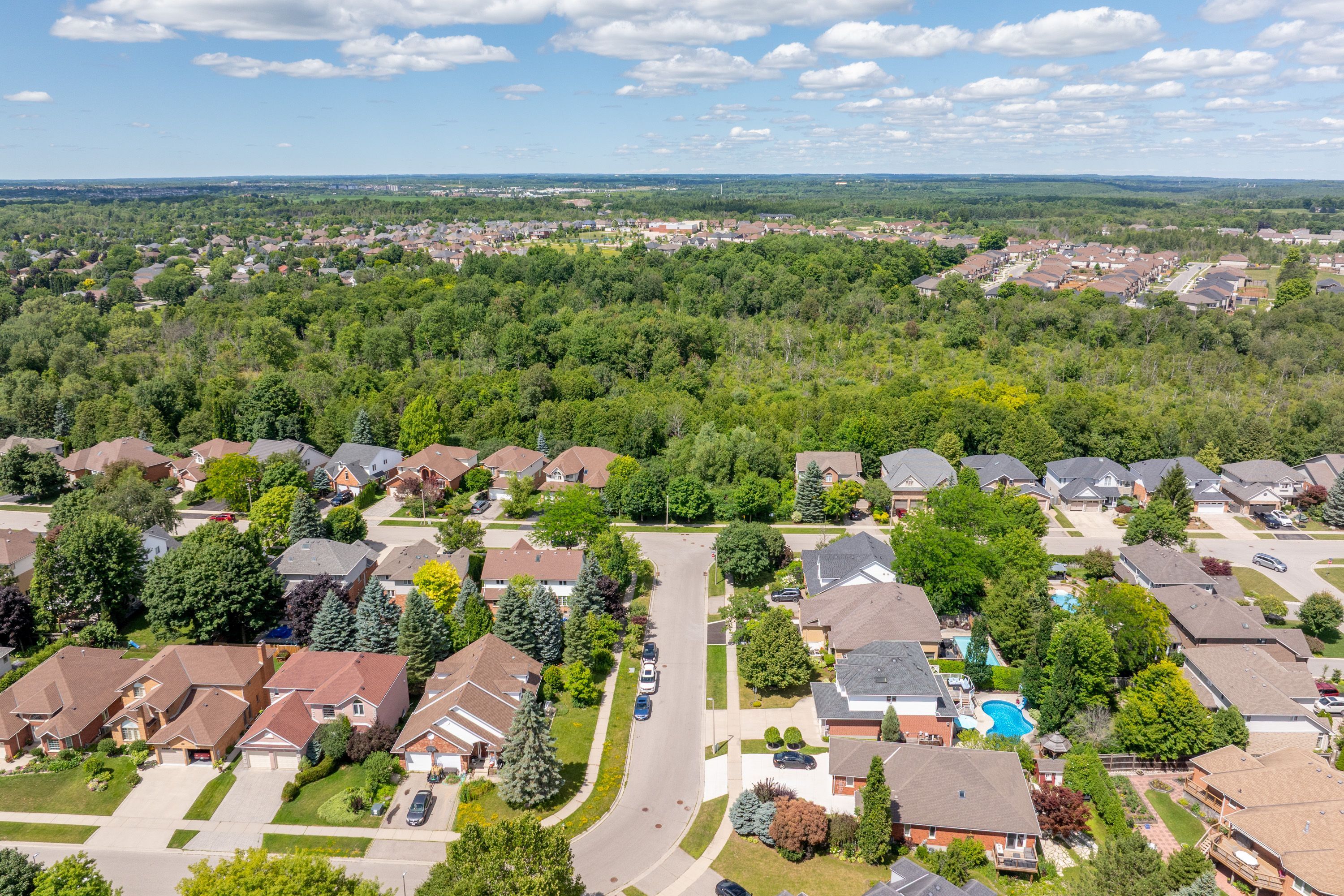 Tucked away at the far end of fieldstone rd, this elegant family home offers a rare opportunity to own on one of kortright east's most sought-after streets in south end guelph. Surrounded by executive homes and nearby greenspace, the property sits on a beautifully treed lot featuring a classic kidney-shaped in-ground pool, creating a private backyard retreat for summer entertaining and family gatherings. Built in 1995, the home reflects genuine pride of ownership while offering an excellent opportunity for a new family to make it their own. The layout also offers flexibility, with an upper loft that could be enclosed to create a fourth bedroom and a walk-out lower level with strong potential for an in-law or multi-generational living space. Inside, the main level offers a warm and functional layout. The foyer features cathedral ceilings and opens to a bright formal living area. The generous eat-in kitchen provides access to the upper deck overlooking the backyard. The adjacent formal dining room is currently used as a secondary home office, offering flexibility depending on your needs. A spacious family room with fireplace anchors the main floor, while a mudroom with built-in cabinetry sits just off the double car garage, perfect for everyday convenience. Upstairs you will find a primary suite with walk-in closet and 4-piece ensuite. Two additional bedrooms share another full bathroom, while the upper loft overlooks the living room and could easily be enclosed to create a fourth bedroom, studio, or playroom. The walk-out basement offers a recreation room with bar, full bathroom/laundry, and multiple storage areas, with direct access to the backyard and pool and excellent potential for an in-law or multi-generational suite. Homes on this street rarely become available, and with surrounding executive homes, mature landscape, and a strong sense of neighbourhood pride, it's easy to see why families stay here for decades.