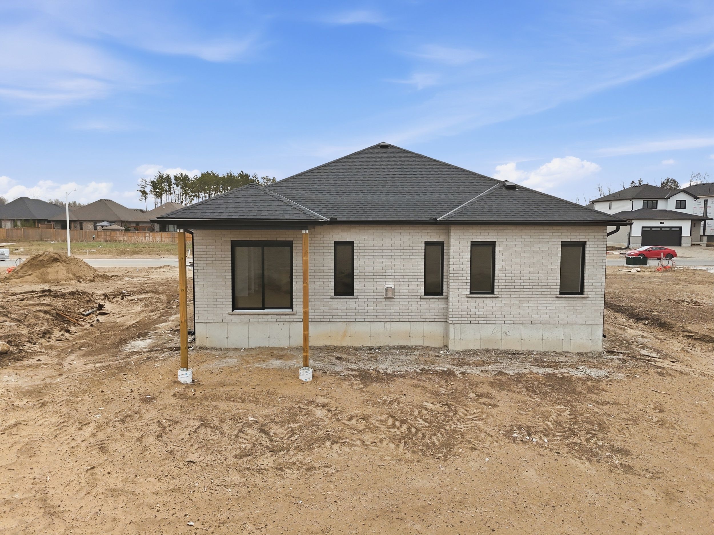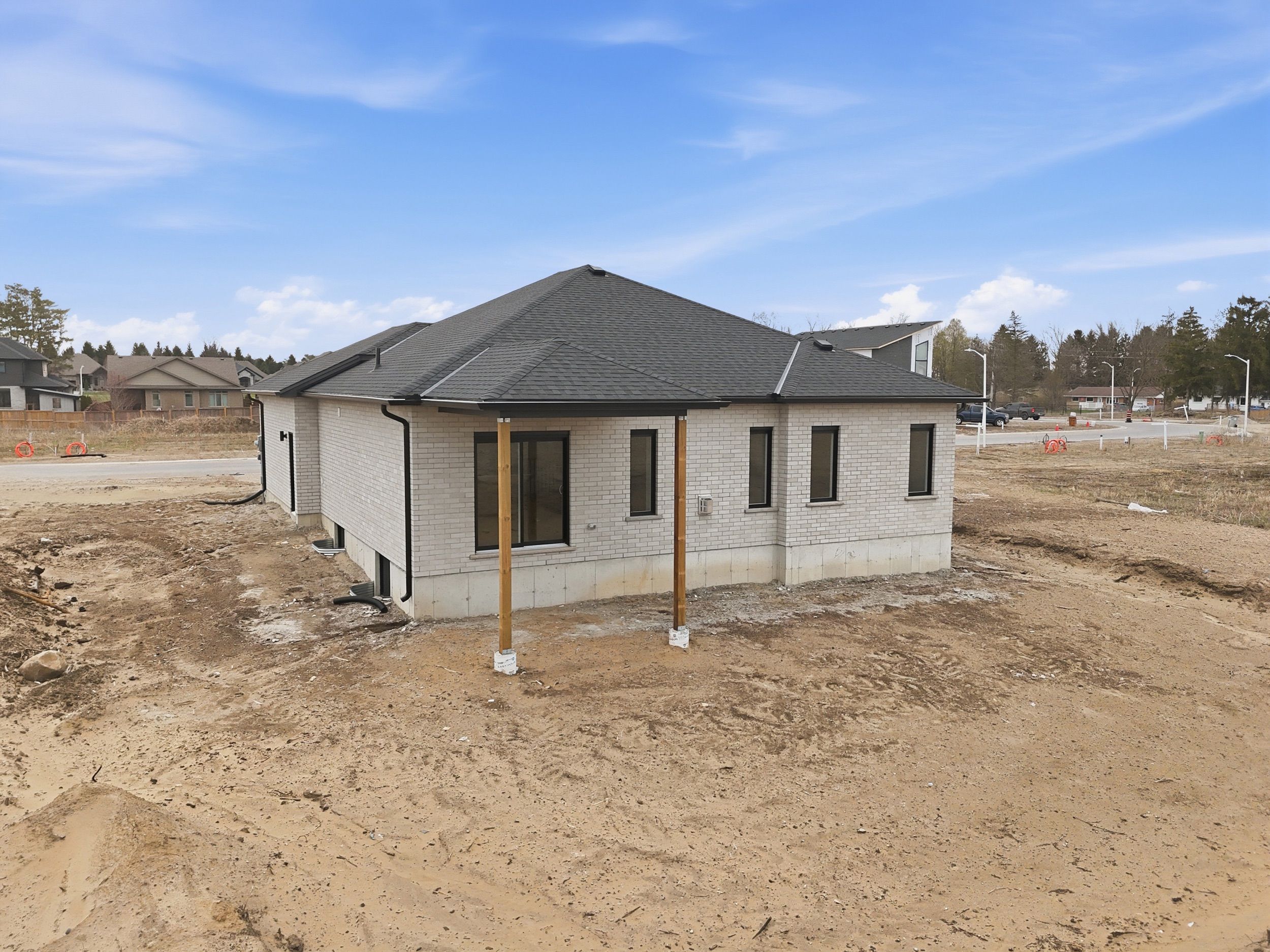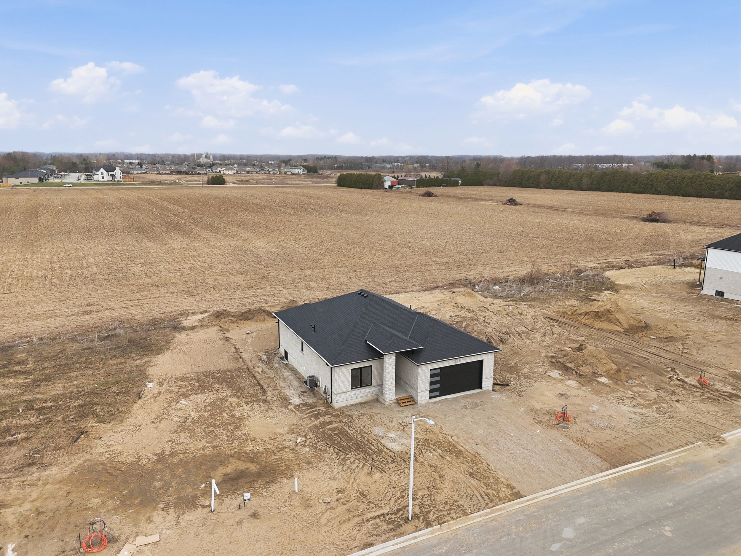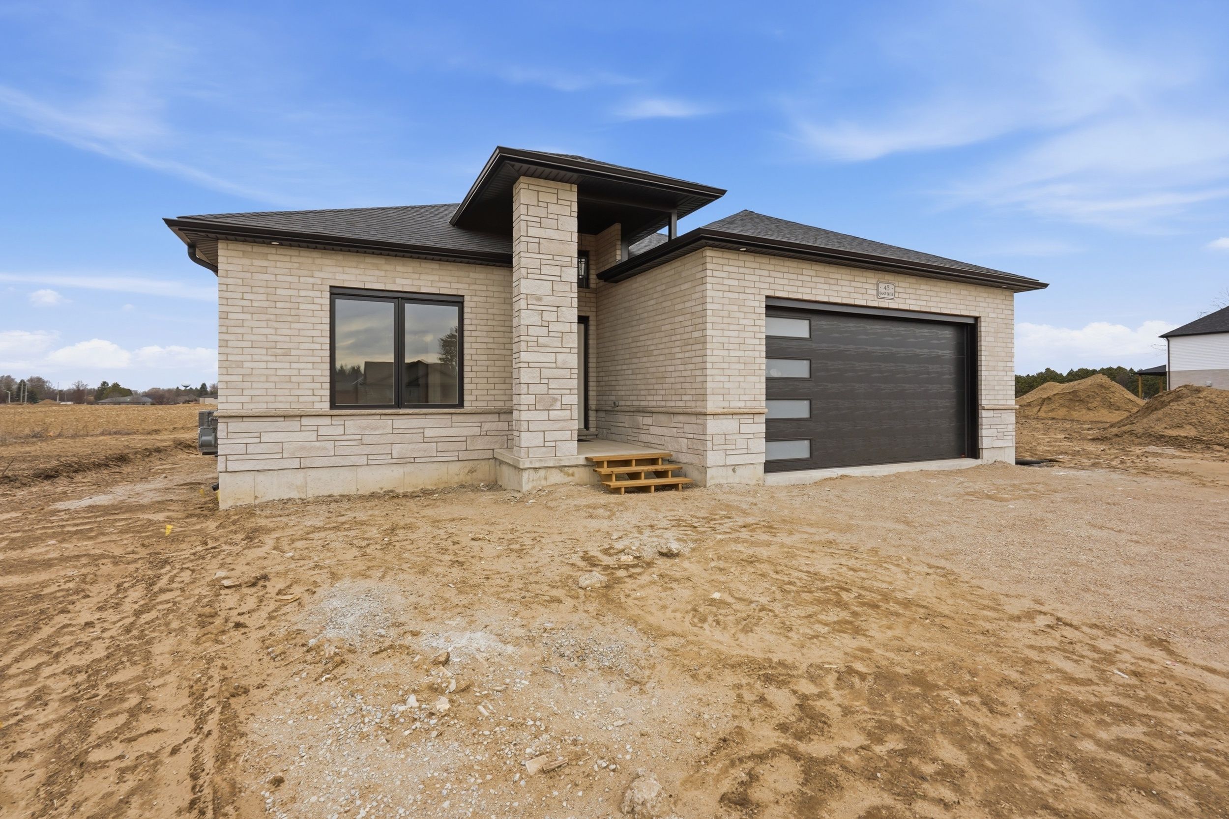 Welcome to 45 hardy drive, platynum constructions stunning builders model home located in the highly sought-after final phase of southgrove meadows community in strathroy, just steps from caradoc sands golf club. This beautifully crafted home offers 2 bed, 2 bath, and an impressive array of upscale finishes that set it apart from standard builds. From the moment you arrive, the exceptional curb appeal stands out, featuring a timeless all-brick exterior with a stone skirt and inviting covered porches at both the front and rear. Inside, a grand foyer with 12-foot ceilings welcomes you into a bright, open-concept living space filled with natural light and finished with rich hardwood flooring throughout. The great room is a true focal point, showcasing an oversized tray ceiling and a modern gas fireplace, perfectly balancing warmth and contemporary style. The custom kitchen is equally impressive, complete with crisp white cabinetry, stunning quartz countertops, black hardware, and a functional layout that includes convenient access to the main floor laundry and mudroom. The adjoining dining area opens onto a covered deck with a gas line for bbqs, overlooking farm land-ideal for entertaining or relaxing outdoors. The primary suite is a private retreat, highlighted by a tray ceiling, spacious walk-in closet, and a spa-inspired ensuite featuring a walk-in tile shower. A second bedroom and full bathroom complete the main level. The lower level is unfinished to add your personal touches. Perfectly located close to shopping, dining, schools, and with easy access to highway 402, this home offers the ideal combination of luxury, comfort, and convenience in one of strathroy's most desirable communities.