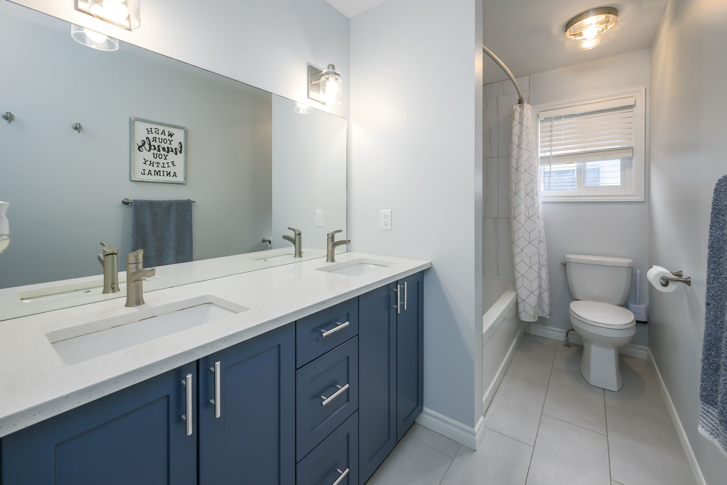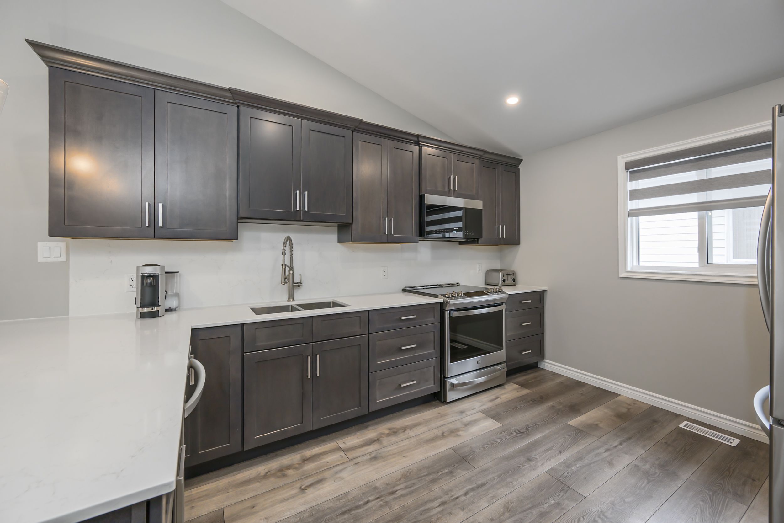 • Modern kitchen features quartz countertops, stainless steel appliances, and breakfast bar.