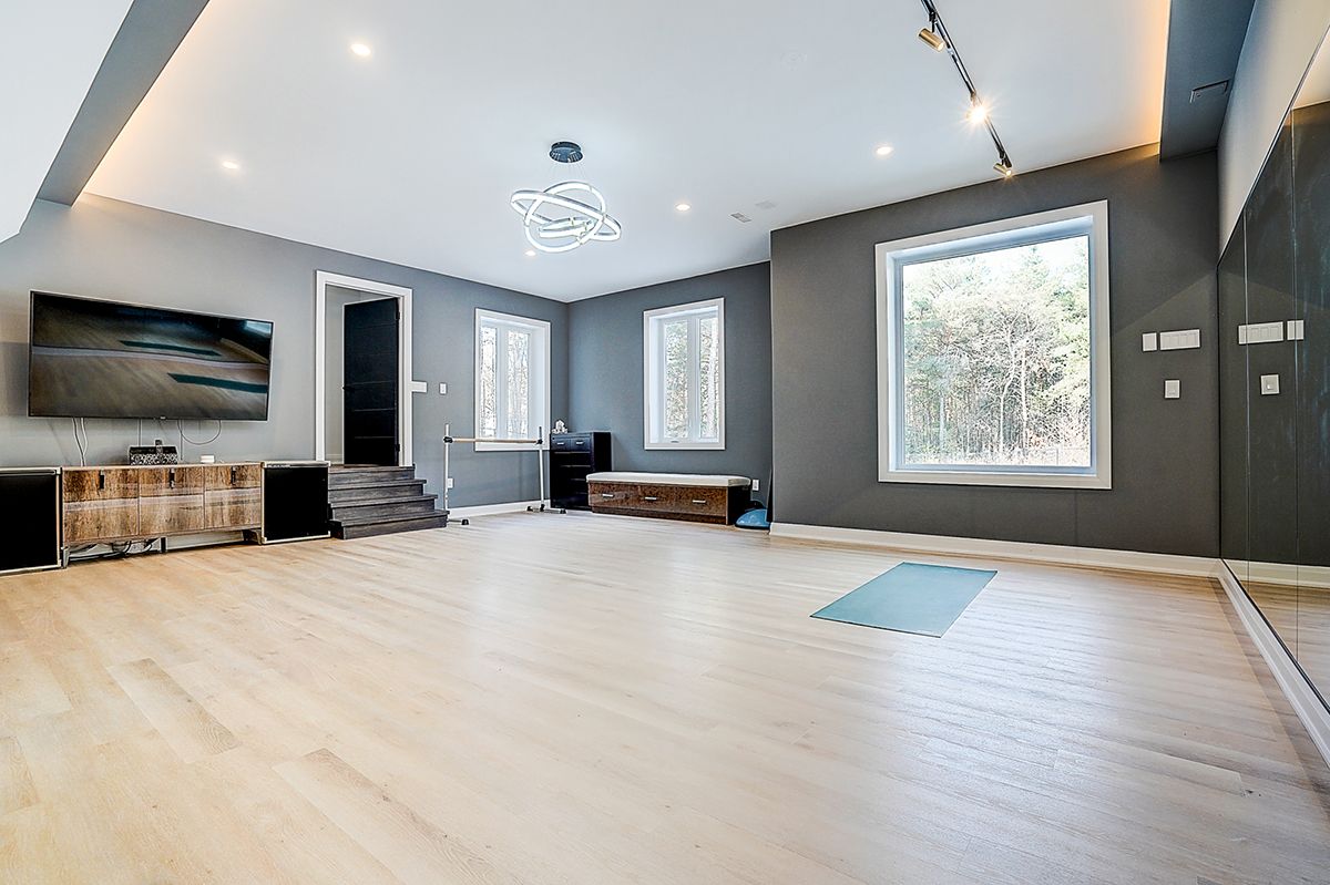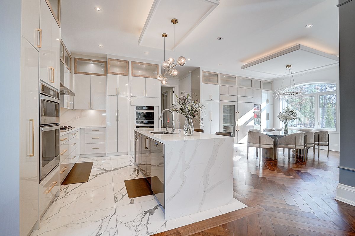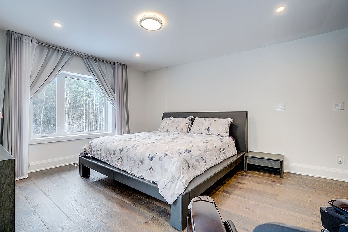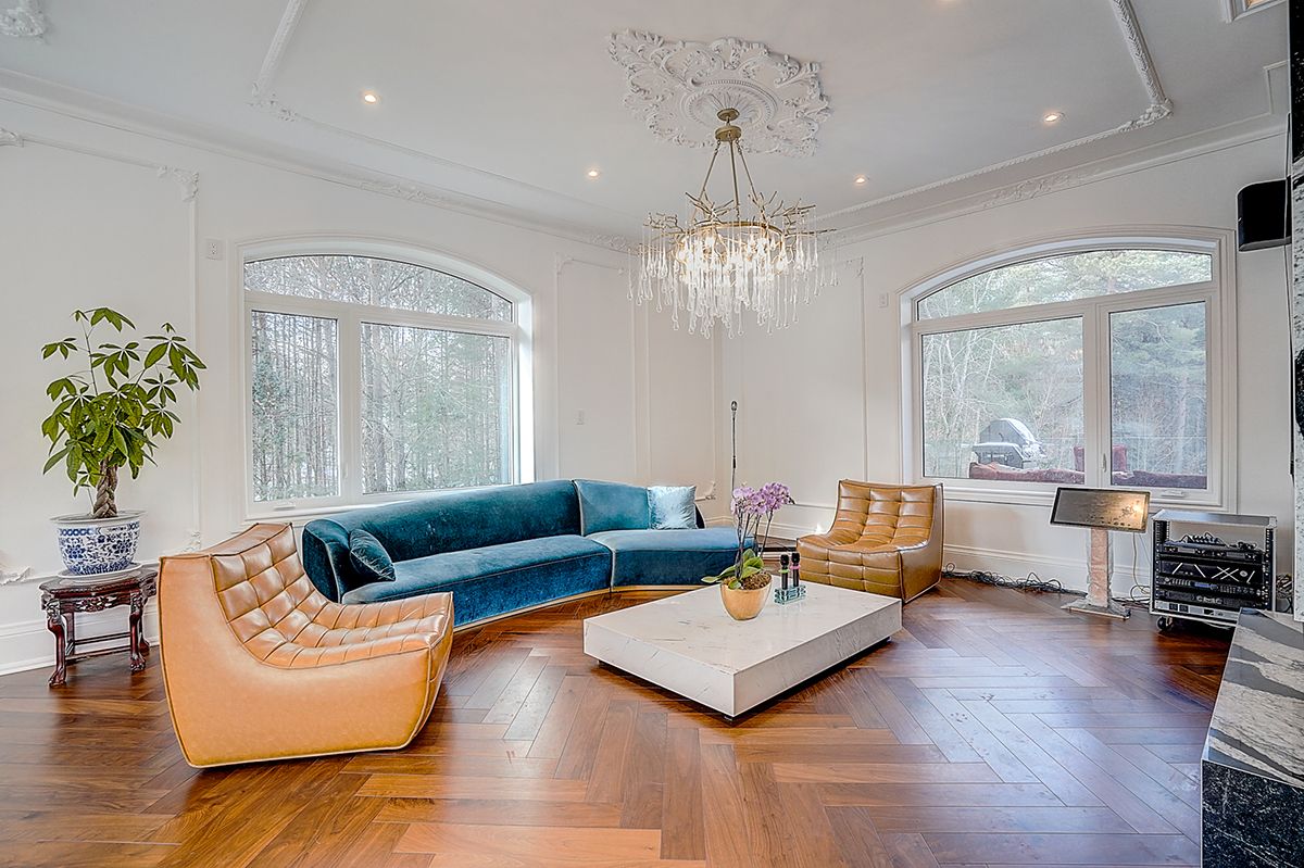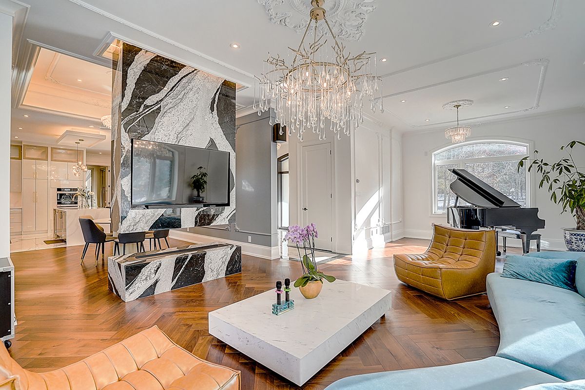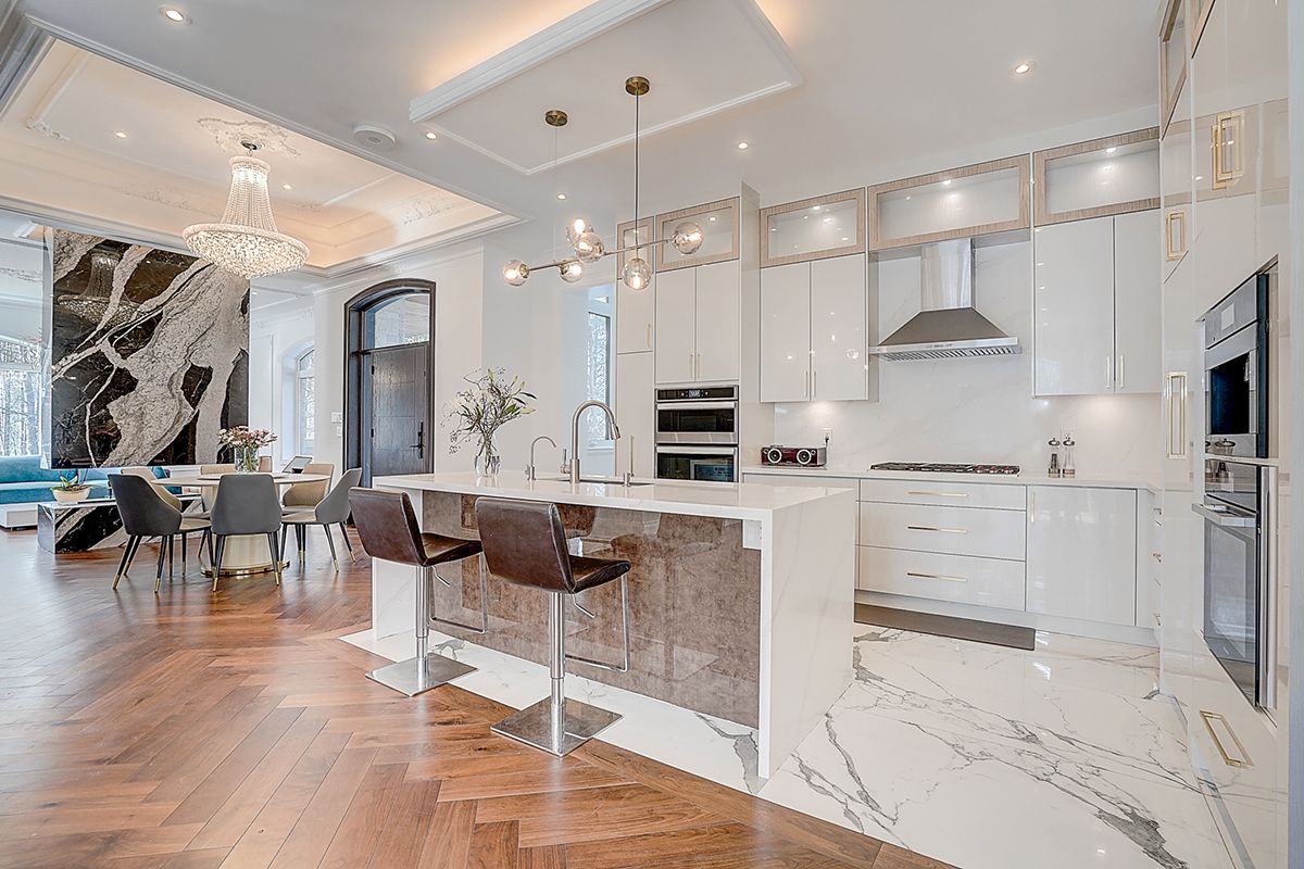 Rare modern french luxury bungalow estate. A rare offering in today's market, this exceptional modern french-inspired luxury bungalow redefines high-end living by seamlessly combining estate-level luxury with unparalleled everyday convenience-all on one expansive level. Set on a 2-acre private lot backing onto an endless forest, the home welcomes you with a crescent-shaped driveway and refined architectural detailing. Inside 12' ceiling (main), solid walnut chevron flooring, custom plaster wall trims, medallion ceilings, and a dramatic floating marble tv and fireplace wall reflect timeless modern french craftsmanship. The gourmet kitchen is fully equipped with elite appliances, including a 72" see-through sub-zero refrigerator and freezer, wolf gas cooktop, and miele built-in coffee machine, steam oven, and dishwasher-designed to elevate daily living hile supporting effortless entertaining. The main-level primary suite offers a true spa retreat, featuring a luxury ensuite bathroom with wet sauna, premium fixtures, and smart toilets that enhance comfort and hygiene throughout. An elegant entryway with floating custom cabinetry provides discreet and functional storage. What truly sets this bungalow apart is its fully developed 3,000-square-foot lower level, thoughtfully designed for both lifestyle and recreation. It includes a professional dance studio (10'), gym, walk-in temperature-controlled wine cellar, traditional wood sauna, snooker area, private home theater, and an additional ensuite bedroom-ensuring space for every passion without sacrificing main-floor convenience. The three-car garage features a golf simulator room and an upper loft offering exceptional flexibility. Outdoor living is elevated with a super-sized concrete rooftop deck, creating a four-season retreat surrounded by nature. An extended concrete driveway into the backyard further enhances functionality and scale.