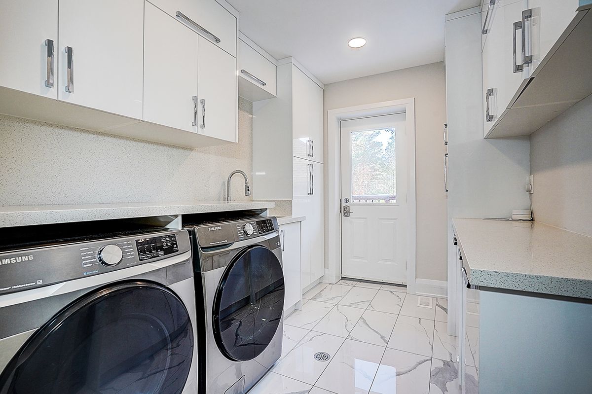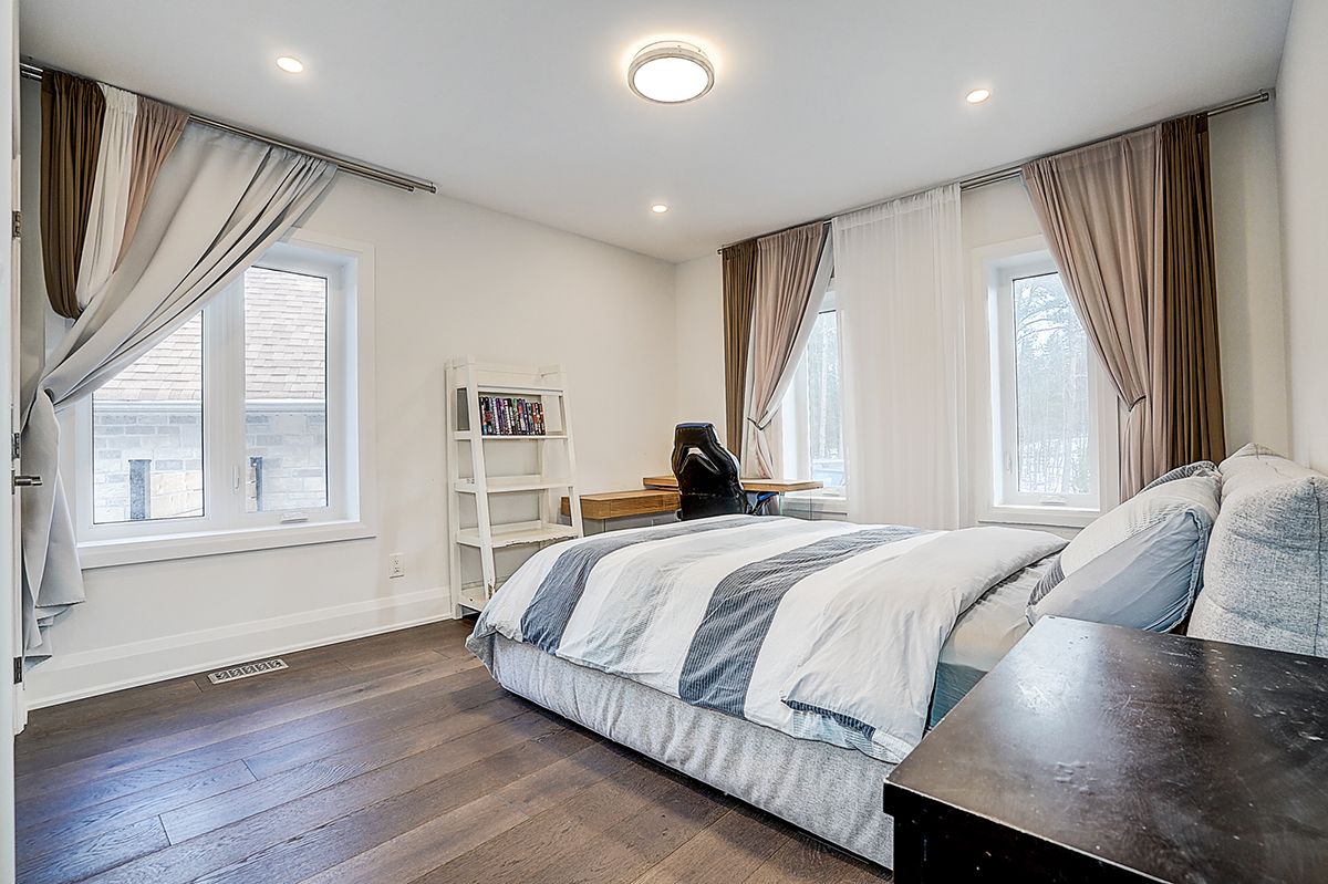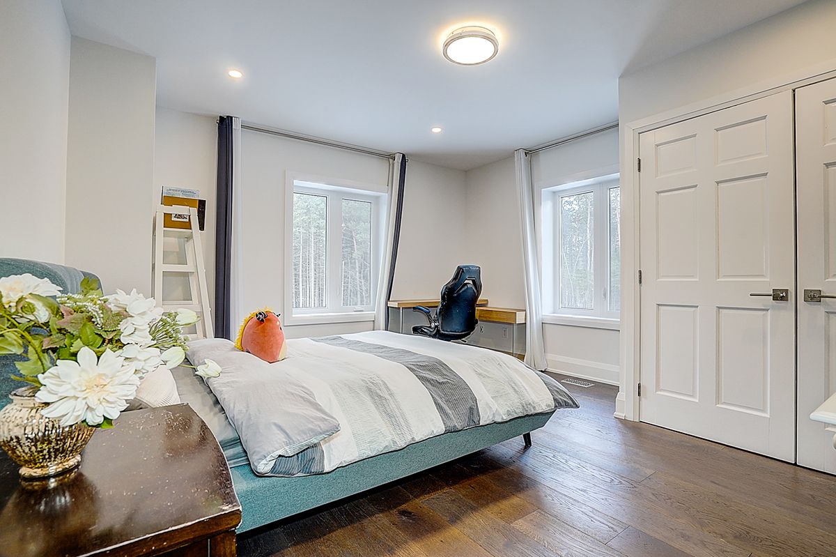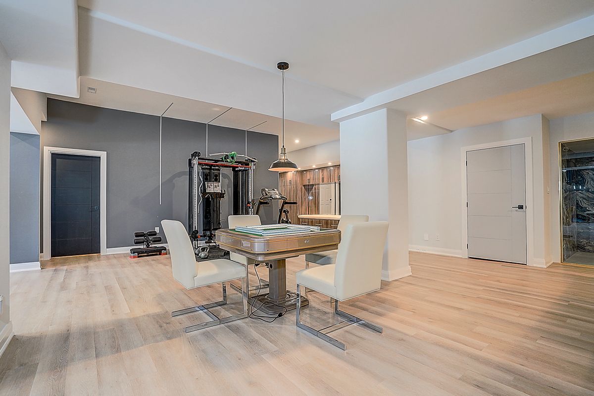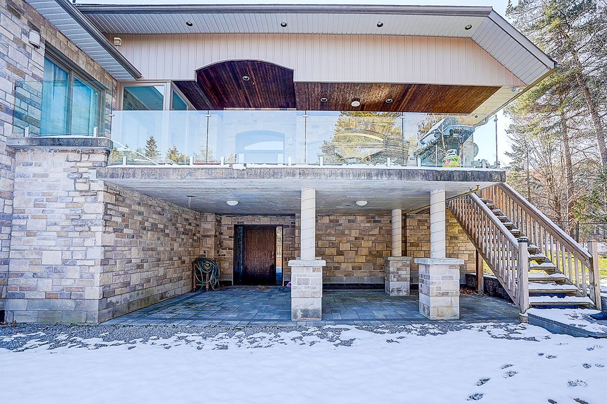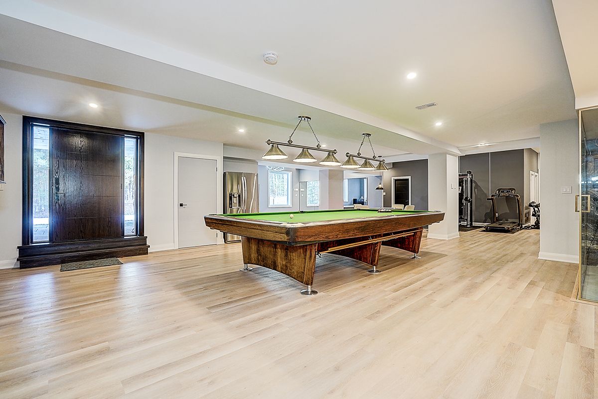 Rare modern french luxury bungalow estate. A rare offering in today's market, this exceptional modern french-inspired luxury bungalow redefines high-end living by seamlessly combining estate-level luxury with unparalleled everyday convenience-all on one expansive level. Set on a 2-acre private lot backing onto an endless forest, the home welcomes you with a crescent-shaped driveway and refined architectural detailing. Inside 12' ceiling (main), solid walnut chevron flooring, custom plaster wall trims, medallion ceilings, and a dramatic floating marble tv and fireplace wall reflect timeless modern french craftsmanship. The gourmet kitchen is fully equipped with elite appliances, including a 72" see-through sub-zero refrigerator and freezer, wolf gas cooktop, and miele built-in coffee machine, steam oven, and dishwasher-designed to elevate daily living hile supporting effortless entertaining. The main-level primary suite offers a true spa retreat, featuring a luxury ensuite bathroom with wet sauna, premium fixtures, and smart toilets that enhance comfort and hygiene throughout. An elegant entryway with floating custom cabinetry provides discreet and functional storage. What truly sets this bungalow apart is its fully developed 3,000-square-foot lower level, thoughtfully designed for both lifestyle and recreation. It includes a professional dance studio (10'), gym, walk-in temperature-controlled wine cellar, traditional wood sauna, snooker area, private home theater, and an additional ensuite bedroom-ensuring space for every passion without sacrificing main-floor convenience. The three-car garage features a golf simulator room and an upper loft offering exceptional flexibility. Outdoor living is elevated with a super-sized concrete rooftop deck, creating a four-season retreat surrounded by nature. An extended concrete driveway into the backyard further enhances functionality and scale.
