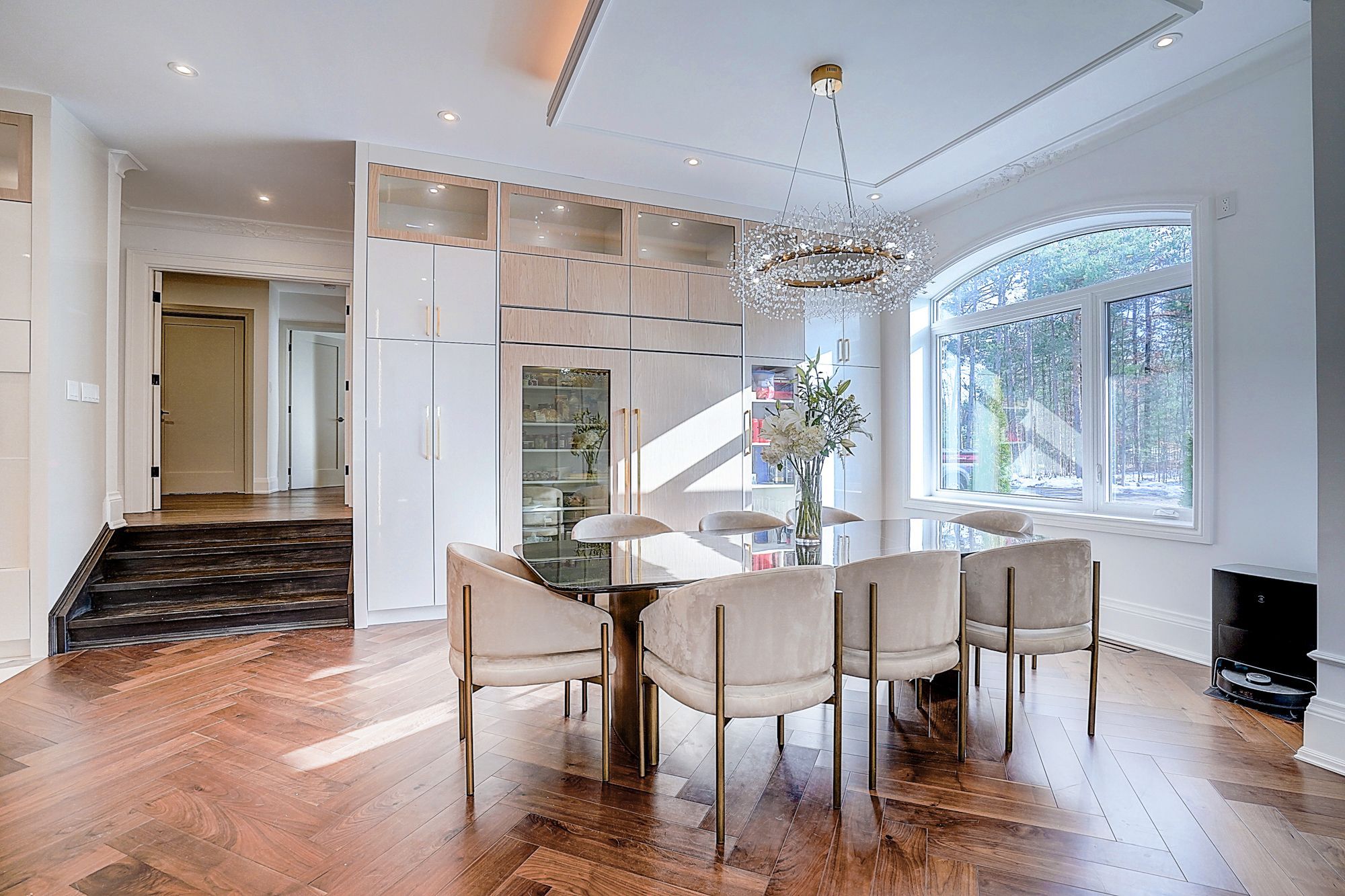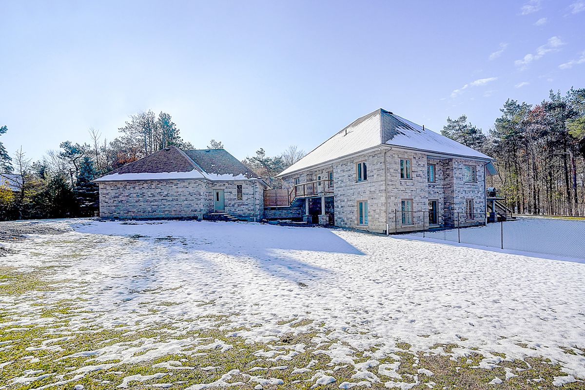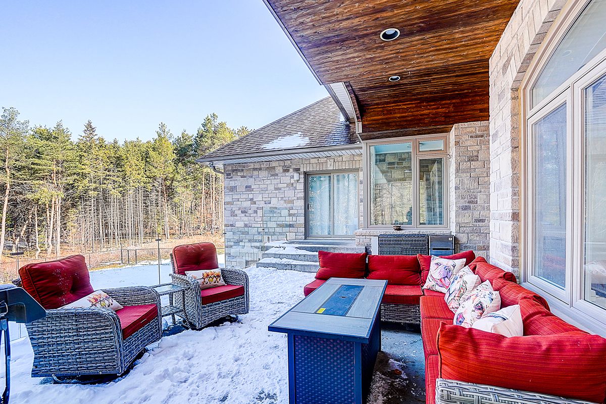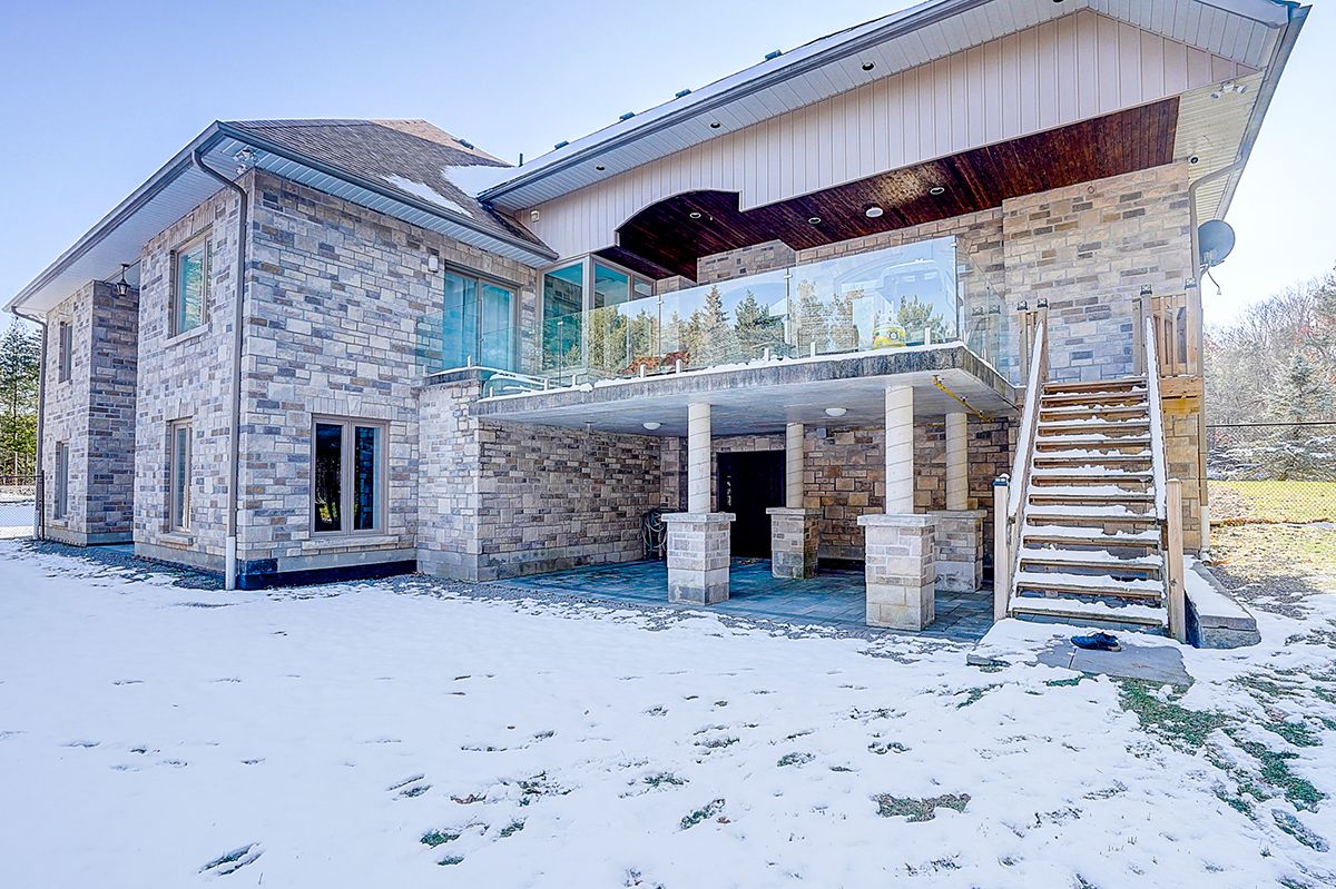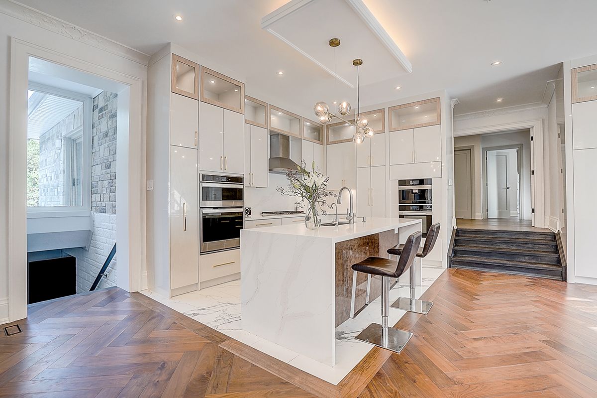 Rare modern french luxury bungalow estate. A rare offering in today's market, this exceptional modern french-inspired luxury bungalow redefines high-end living by seamlessly combining estate-level luxury with unparalleled everyday convenience-all on one expansive level. Set on a 2-acre private lot backing onto an endless forest, the home welcomes you with a crescent-shaped driveway and refined architectural detailing. Inside 12' ceiling (main), solid walnut chevron flooring, custom plaster wall trims, medallion ceilings, and a dramatic floating marble tv and fireplace wall reflect timeless modern french craftsmanship. The gourmet kitchen is fully equipped with elite appliances, including a 72" see-through sub-zero refrigerator and freezer, wolf gas cooktop, and miele built-in coffee machine, steam oven, and dishwasher-designed to elevate daily living hile supporting effortless entertaining. The main-level primary suite offers a true spa retreat, featuring a luxury ensuite bathroom with wet sauna, premium fixtures, and smart toilets that enhance comfort and hygiene throughout. An elegant entryway with floating custom cabinetry provides discreet and functional storage. What truly sets this bungalow apart is its fully developed 3,000-square-foot lower level, thoughtfully designed for both lifestyle and recreation. It includes a professional dance studio (10'), gym, walk-in temperature-controlled wine cellar, traditional wood sauna, snooker area, private home theater, and an additional ensuite bedroom-ensuring space for every passion without sacrificing main-floor convenience. The three-car garage features a golf simulator room and an upper loft offering exceptional flexibility. Outdoor living is elevated with a super-sized concrete rooftop deck, creating a four-season retreat surrounded by nature. An extended concrete driveway into the backyard further enhances functionality and scale.
