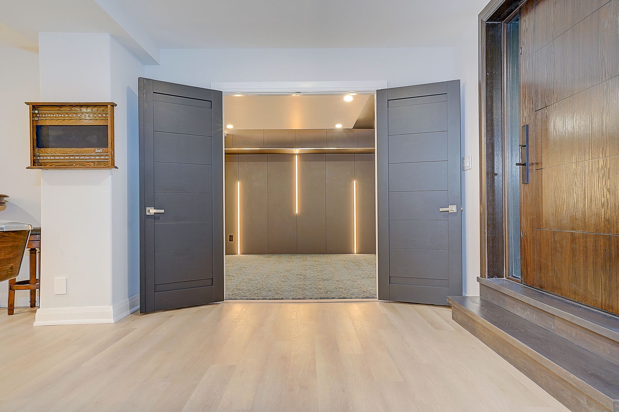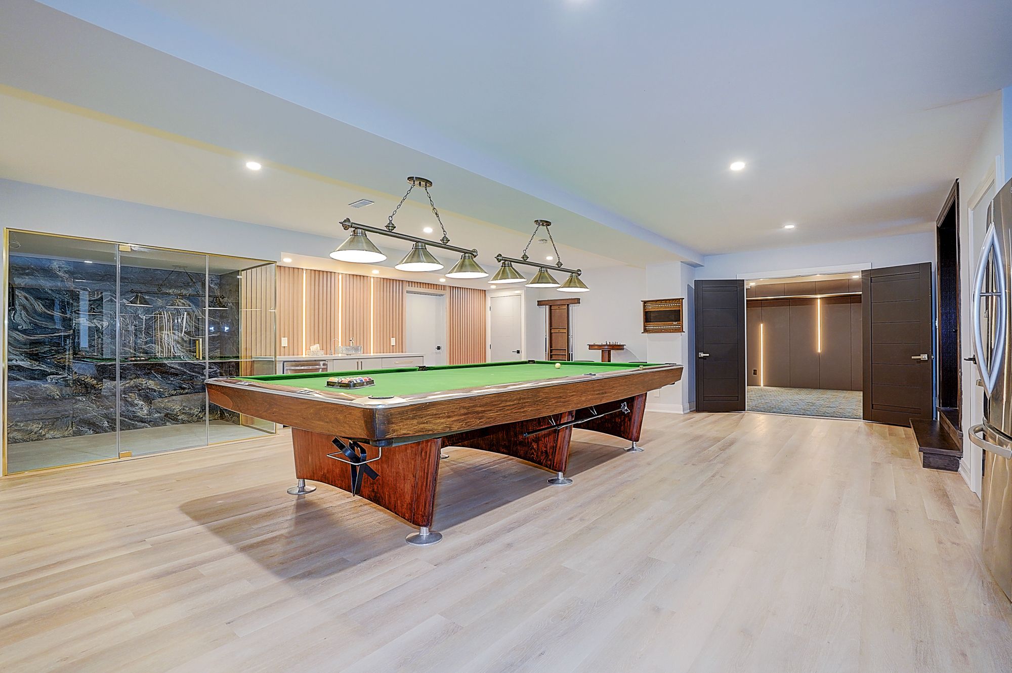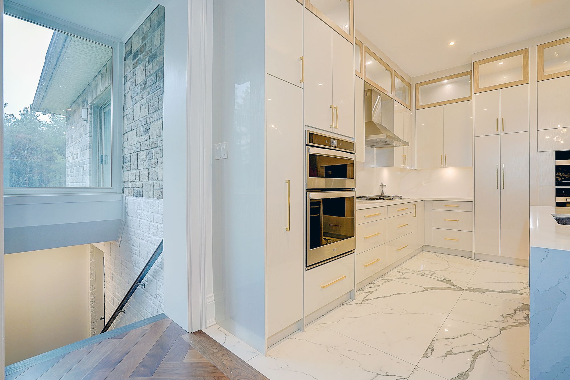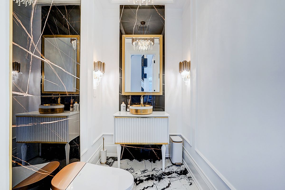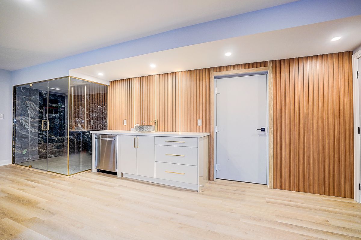 Rare modern french luxury bungalow estate. A rare offering in today's market, this exceptional modern french-inspired luxury bungalow redefines high-end living by seamlessly combining estate-level luxury with unparalleled everyday convenience-all on one expansive level. Set on a 2-acre private lot backing onto an endless forest, the home welcomes you with a crescent-shaped driveway and refined architectural detailing. Inside 12' ceiling (main), solid walnut chevron flooring, custom plaster wall trims, medallion ceilings, and a dramatic floating marble tv and fireplace wall reflect timeless modern french craftsmanship. The gourmet kitchen is fully equipped with elite appliances, including a 72" see-through sub-zero refrigerator and freezer, wolf gas cooktop, and miele built-in coffee machine, steam oven, and dishwasher-designed to elevate daily living hile supporting effortless entertaining. The main-level primary suite offers a true spa retreat, featuring a luxury ensuite bathroom with wet sauna, premium fixtures, and smart toilets that enhance comfort and hygiene throughout. An elegant entryway with floating custom cabinetry provides discreet and functional storage. What truly sets this bungalow apart is its fully developed 3,000-square-foot lower level, thoughtfully designed for both lifestyle and recreation. It includes a professional dance studio (10'), gym, walk-in temperature-controlled wine cellar, traditional wood sauna, snooker area, private home theater, and an additional ensuite bedroom-ensuring space for every passion without sacrificing main-floor convenience. The three-car garage features a golf simulator room and an upper loft offering exceptional flexibility. Outdoor living is elevated with a super-sized concrete rooftop deck, creating a four-season retreat surrounded by nature. An extended concrete driveway into the backyard further enhances functionality and scale.