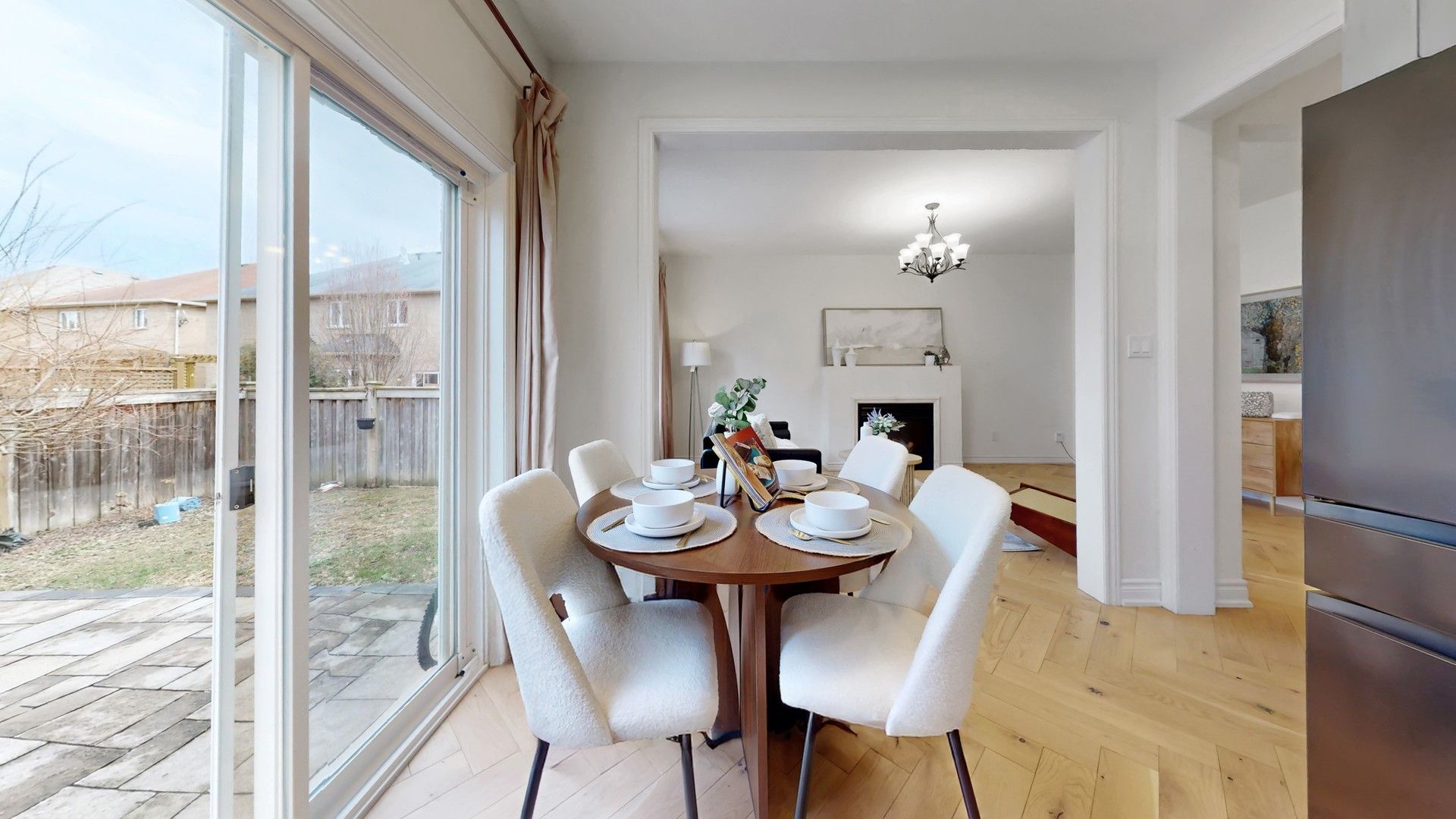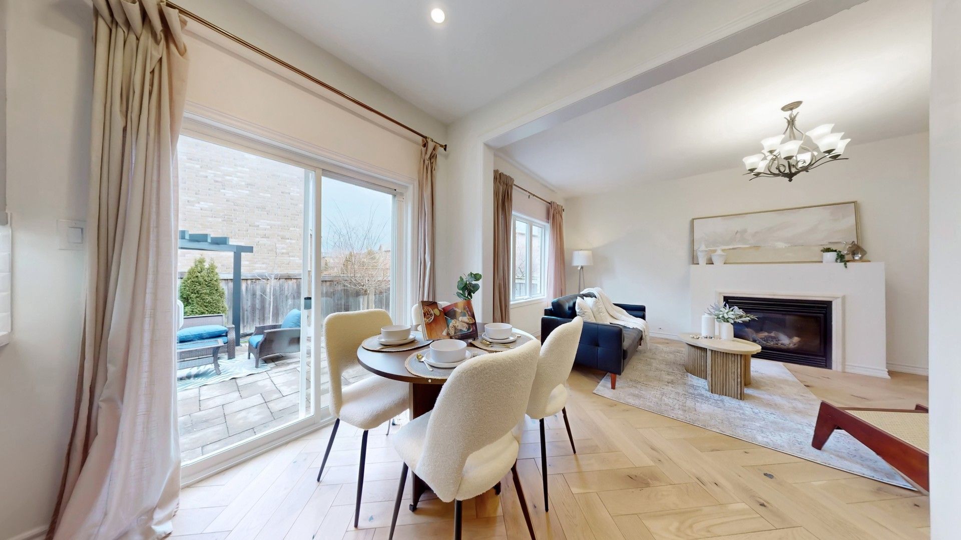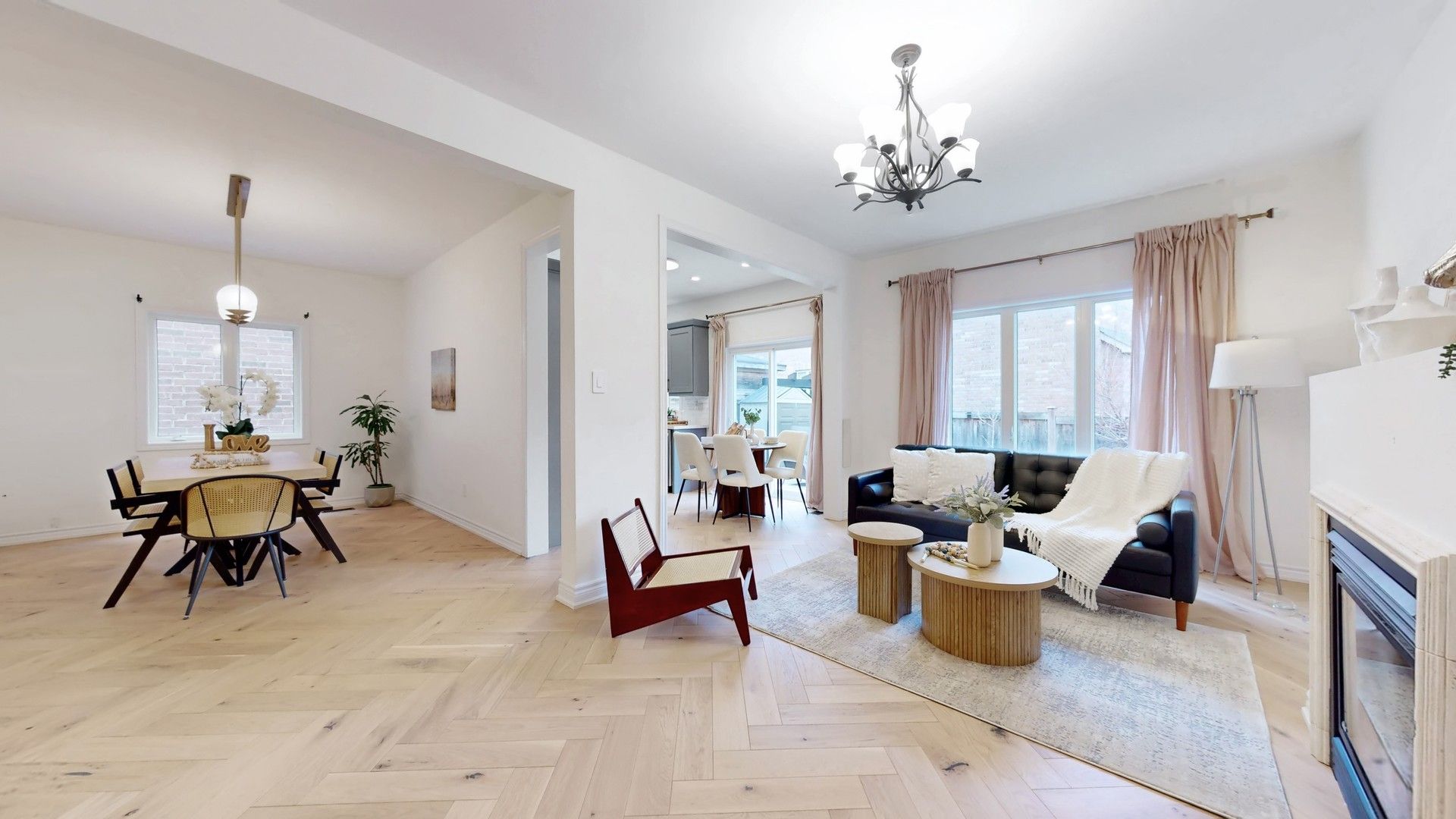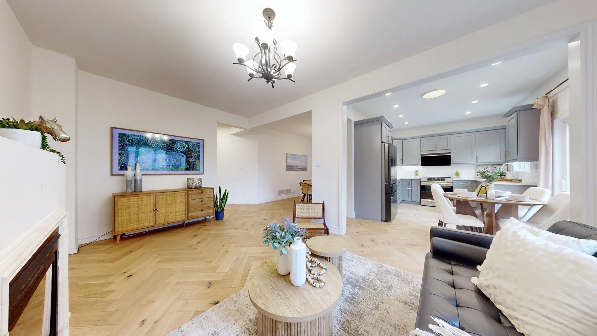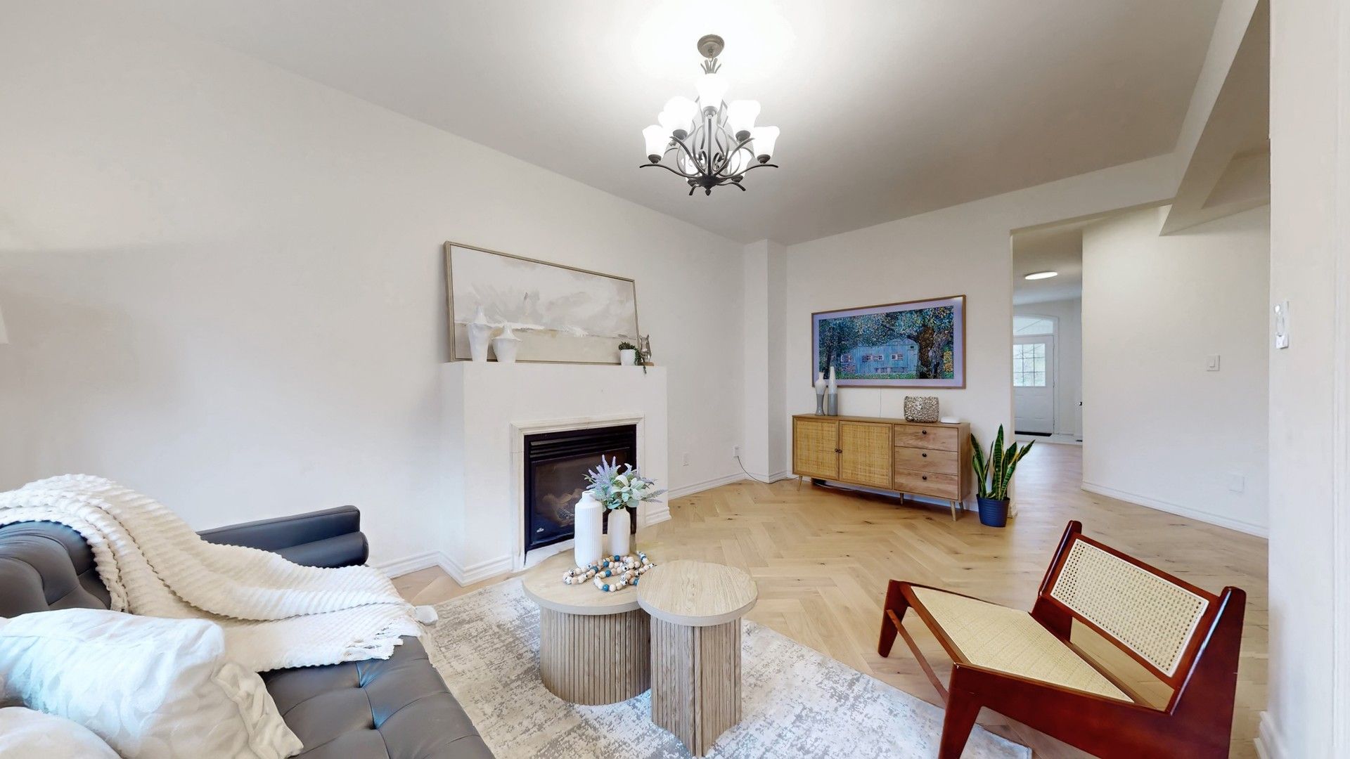 • Spacious interior with open-concept design and cozy living room fireplace.
