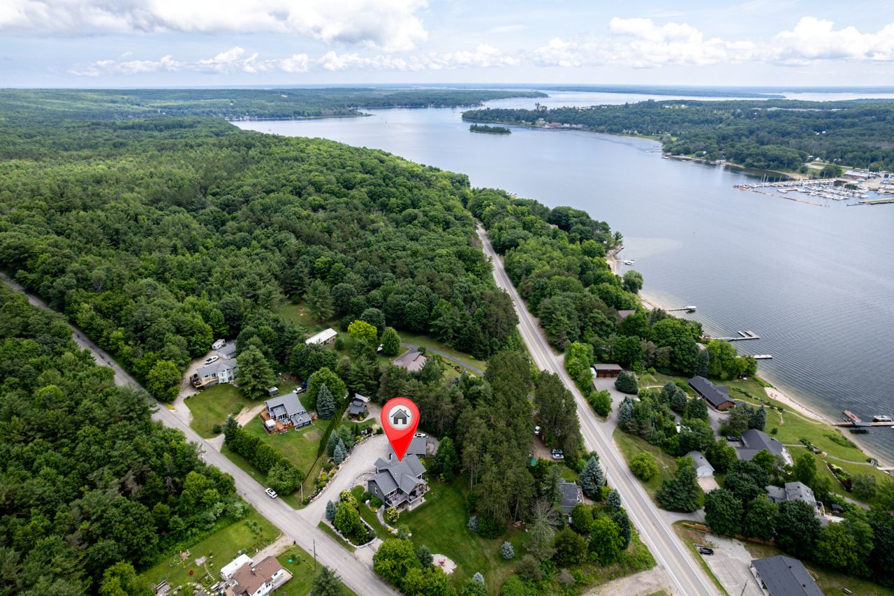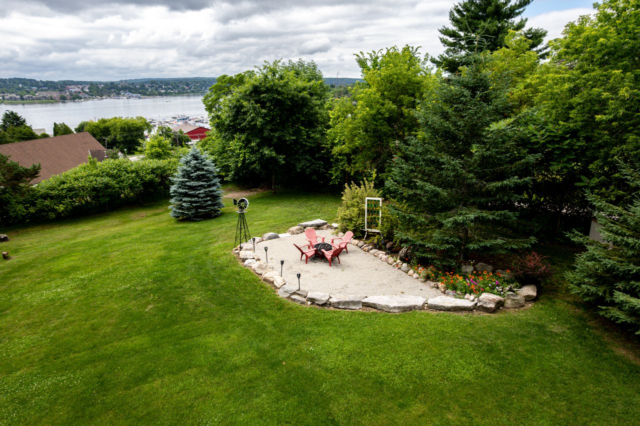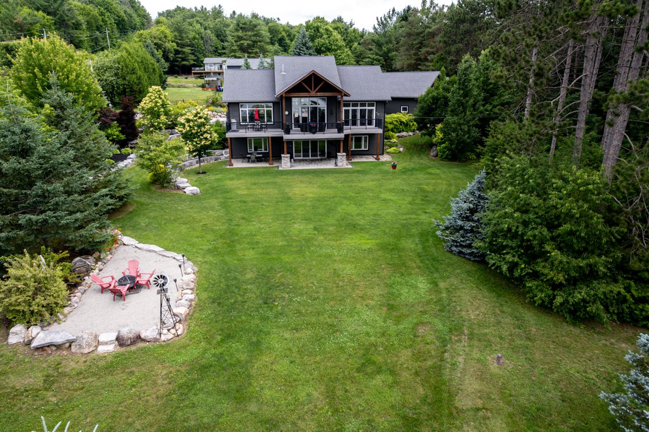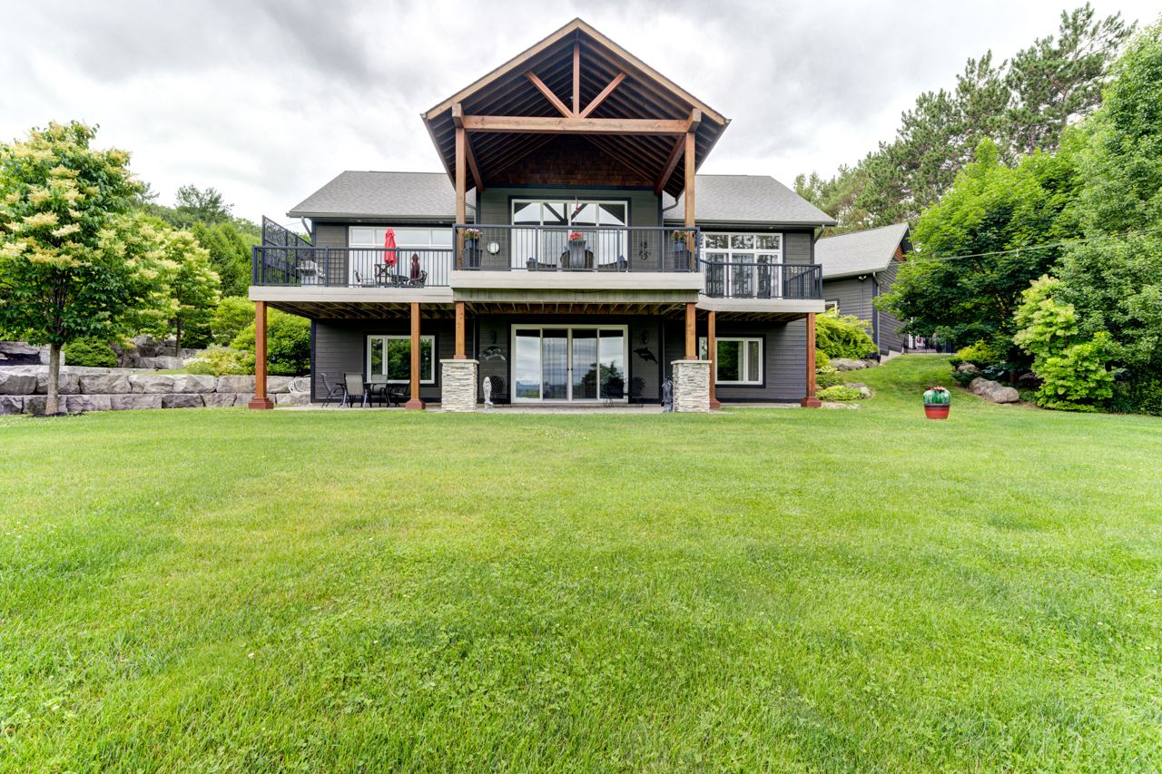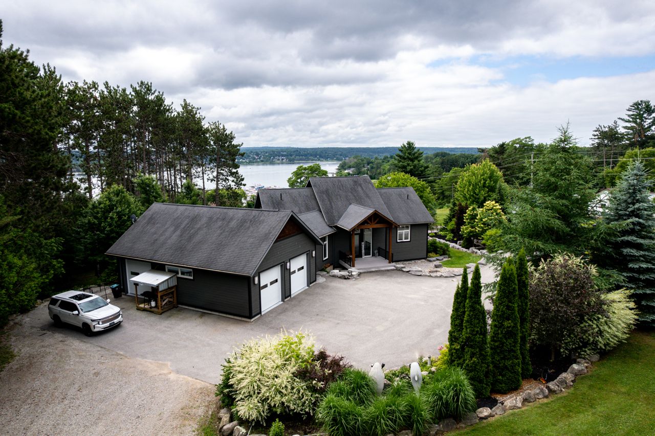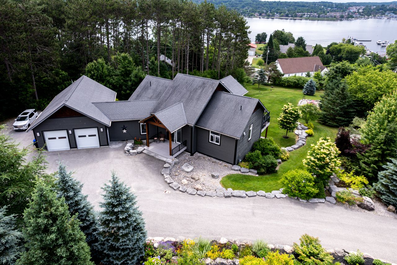 This stunning custom-built luxury home offers the ultimate in refined living with breathtaking views over the harbour in penetanguishene. Designed for comfort and style, the home features a gourmet island kitchen with high-end appliances, perfect for entertaining, and opens into the elegant living and dining areas where a double-sided stone fireplace creates a dramatic feature wall. Step out to the covered composite deck and take in the views surrounded by professionally landscaped grounds. Rich mahogany wood floors flow throughout the main level, which also includes a spacious laundry room with a built-in feature closet wall and interior access to the oversized, heated, and insulated attached garage. The lower level is equally impressive with two generously sized bedrooms, a walk-in closet, ample storage, and a large rec room with patio doors leading to a private patio area. Outdoors, enjoy a charming shed/playhouse with electricity, a large firepit gathering area, and beautifully designed gardens all perfectly positioned to capture the serene harbour views. For added peace of mind, the home also features a generac generator that automatically activates in the event of a power outage. A truly exceptional property that combines luxury, function, and unmatched setting.