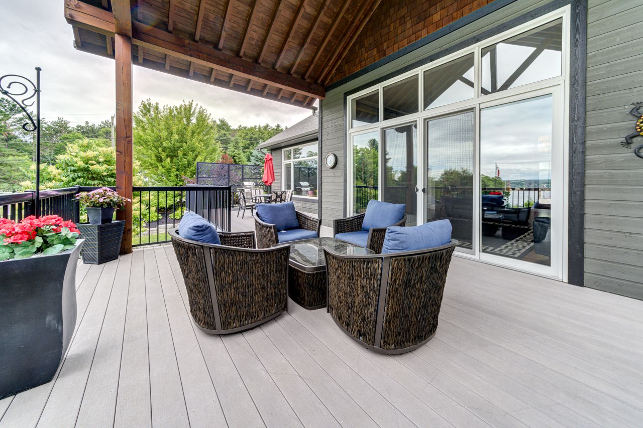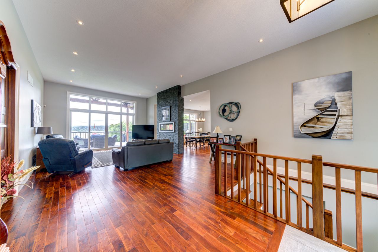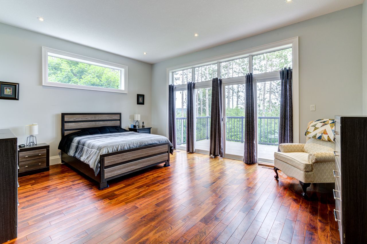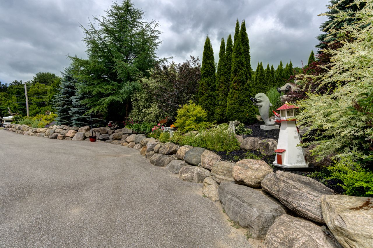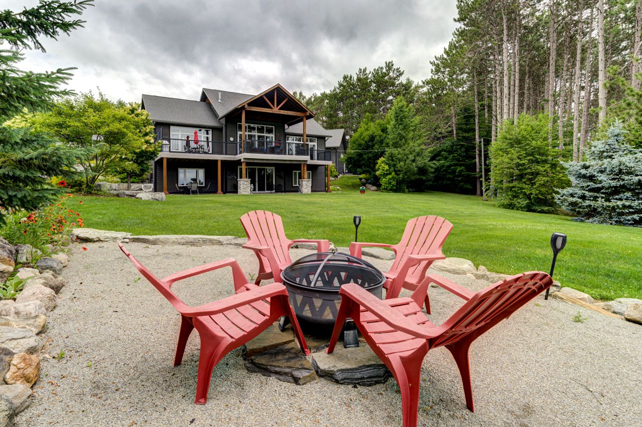 This stunning custom-built luxury home offers the ultimate in refined living with breathtaking views over the harbour in penetanguishene. Designed for comfort and style, the home features a gourmet island kitchen with high-end appliances, perfect for entertaining, and opens into the elegant living and dining areas where a double-sided stone fireplace creates a dramatic feature wall. Step out to the covered composite deck and take in the views surrounded by professionally landscaped grounds. Rich mahogany wood floors flow throughout the main level, which also includes a spacious laundry room with a built-in feature closet wall and interior access to the oversized, heated, and insulated attached garage. The lower level is equally impressive with two generously sized bedrooms, a walk-in closet, ample storage, and a large rec room with patio doors leading to a private patio area. Outdoors, enjoy a charming shed/playhouse with electricity, a large firepit gathering area, and beautifully designed gardens all perfectly positioned to capture the serene harbour views. For added peace of mind, the home also features a generac generator that automatically activates in the event of a power outage. A truly exceptional property that combines luxury, function, and unmatched setting.
