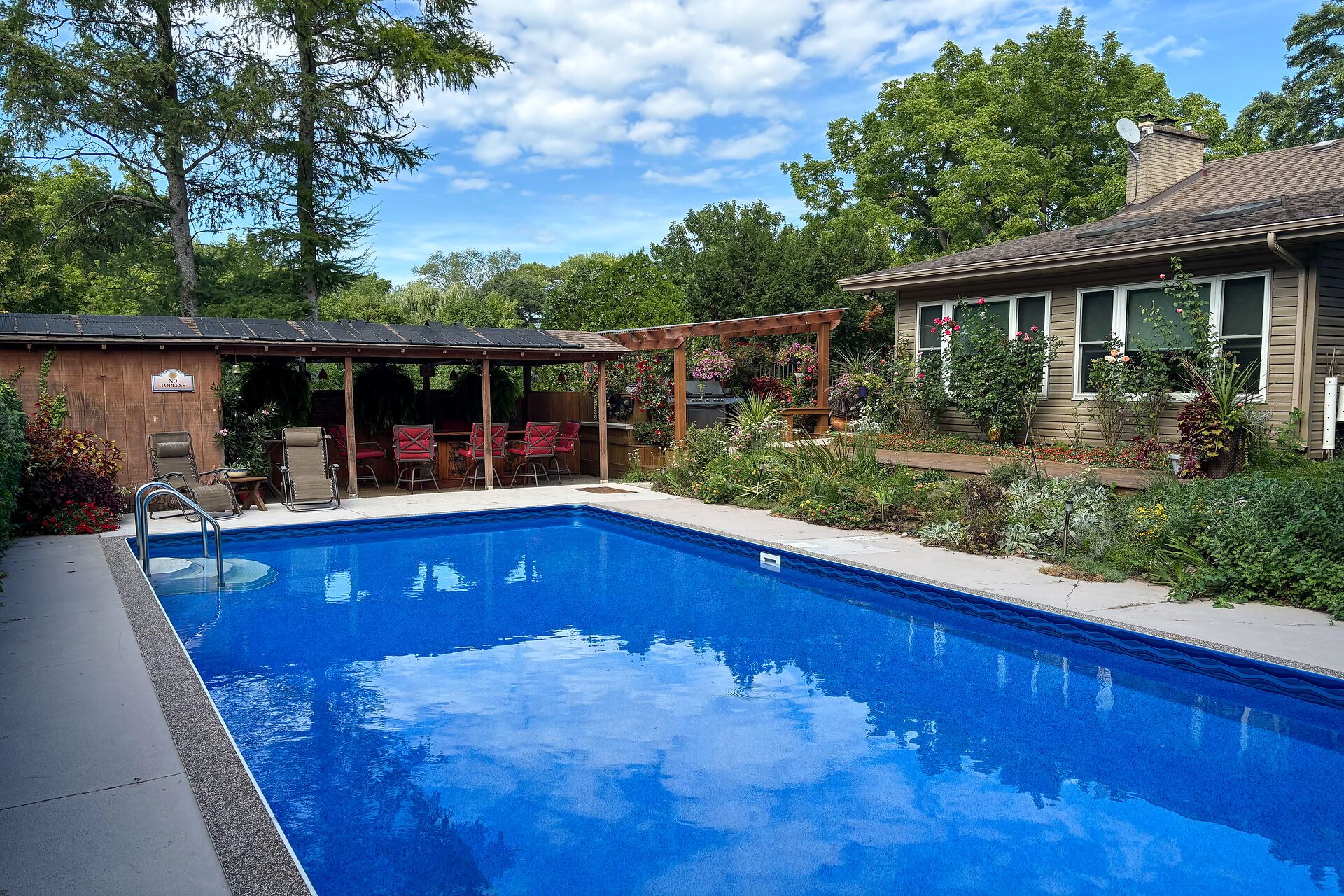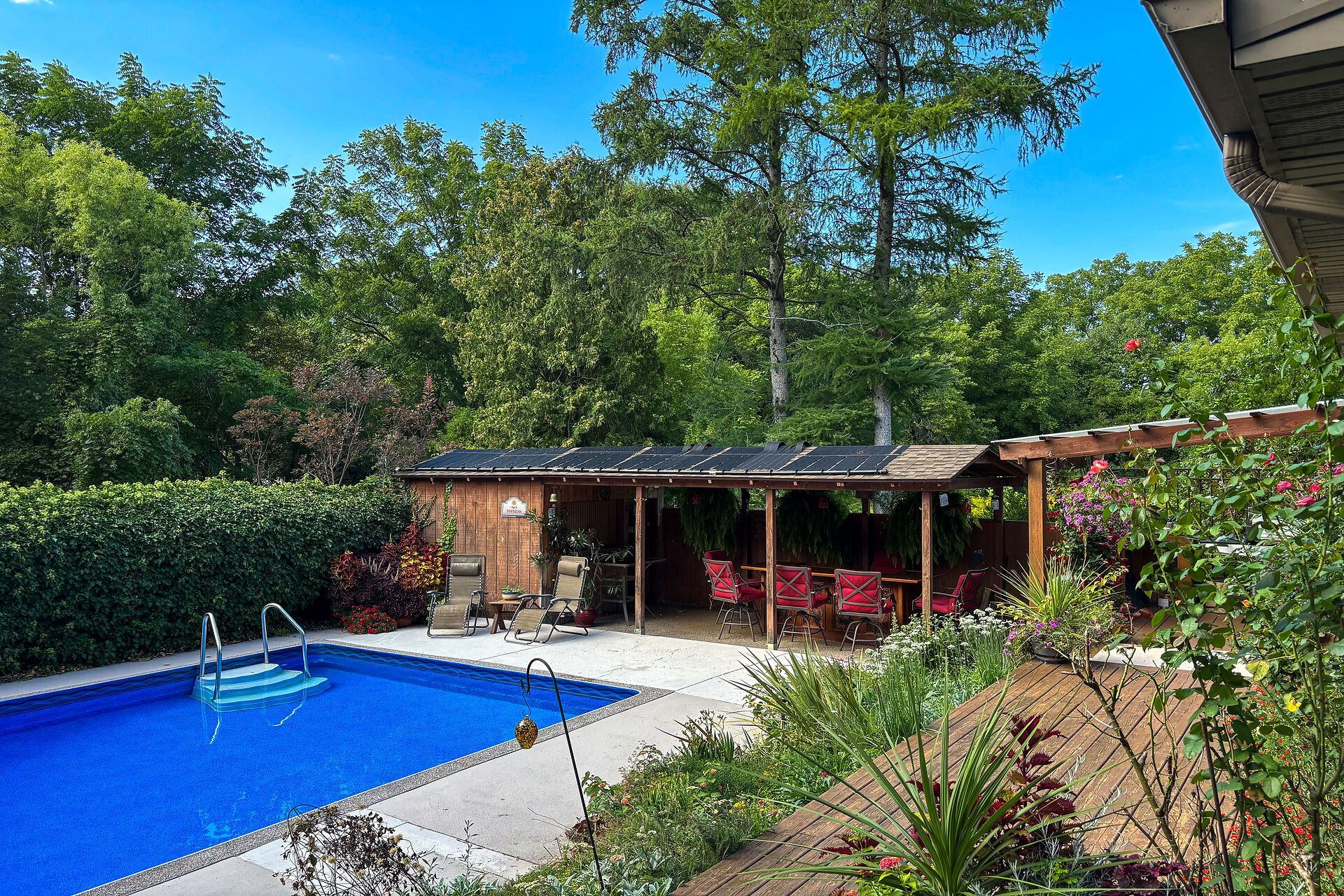 • In-ground solar heated pool offers a private backyard oasis for relaxation.