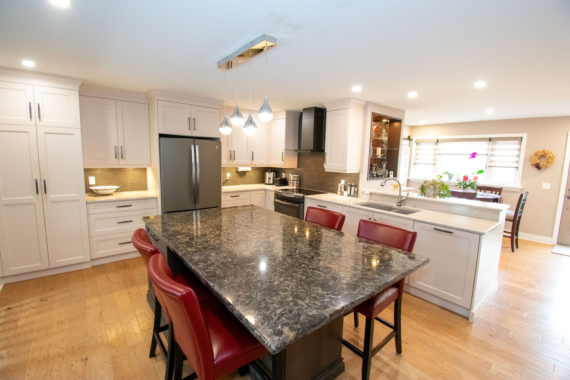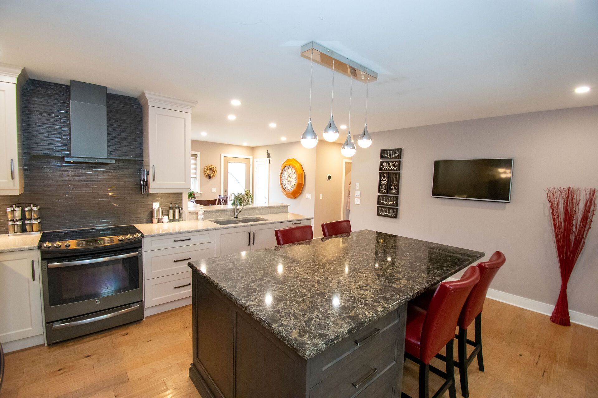 • Updated open concept kitchen with plenty of cabinet and granite counter space.