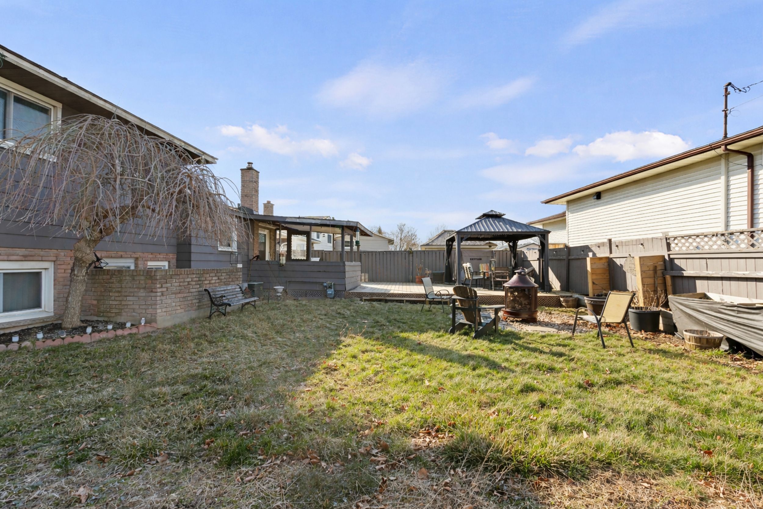 • Backyard ready for enjoyment with a firepit and gazebo.