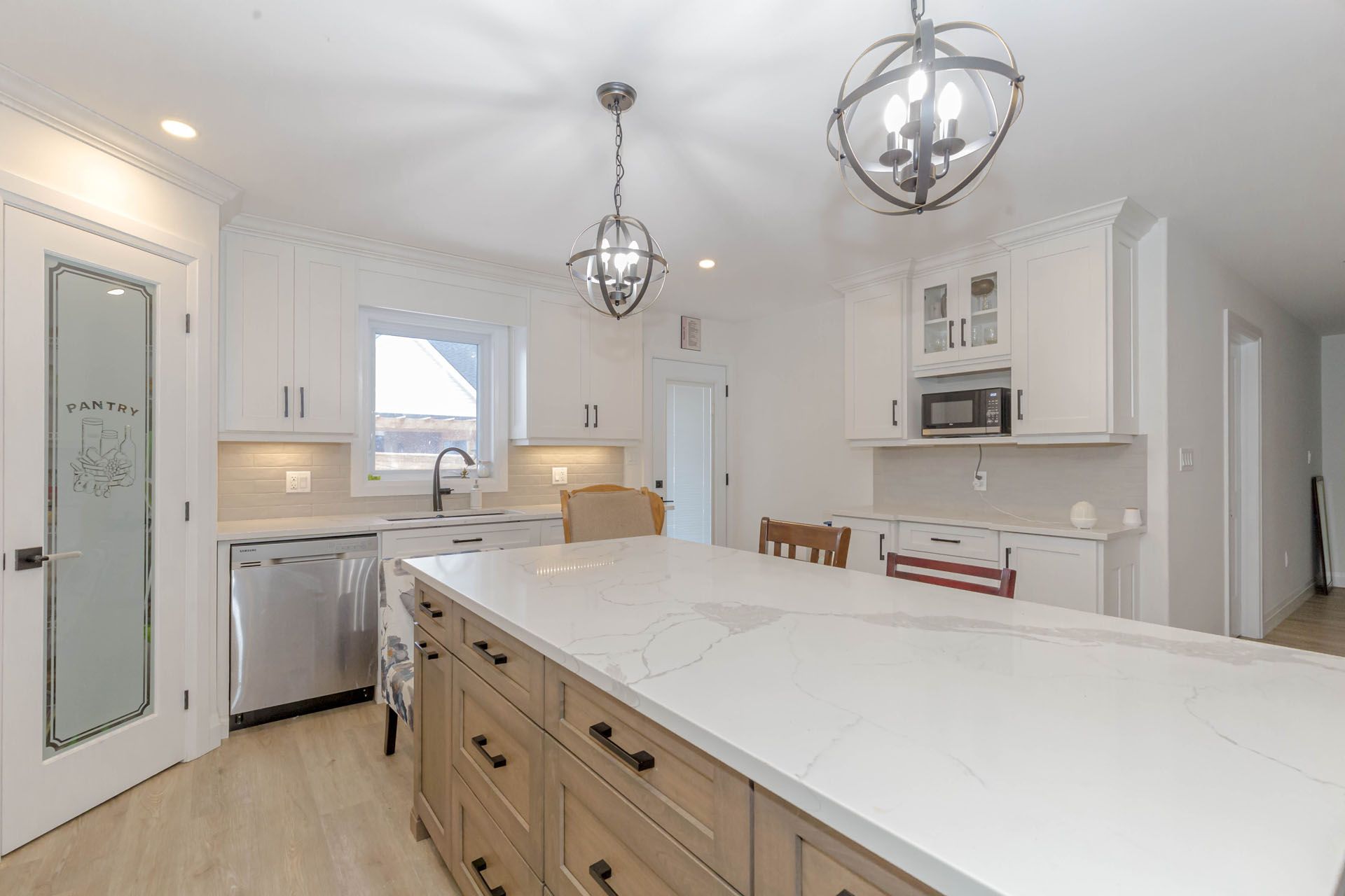 • Lovely white kitchen equipped with granite counters and seating island.
