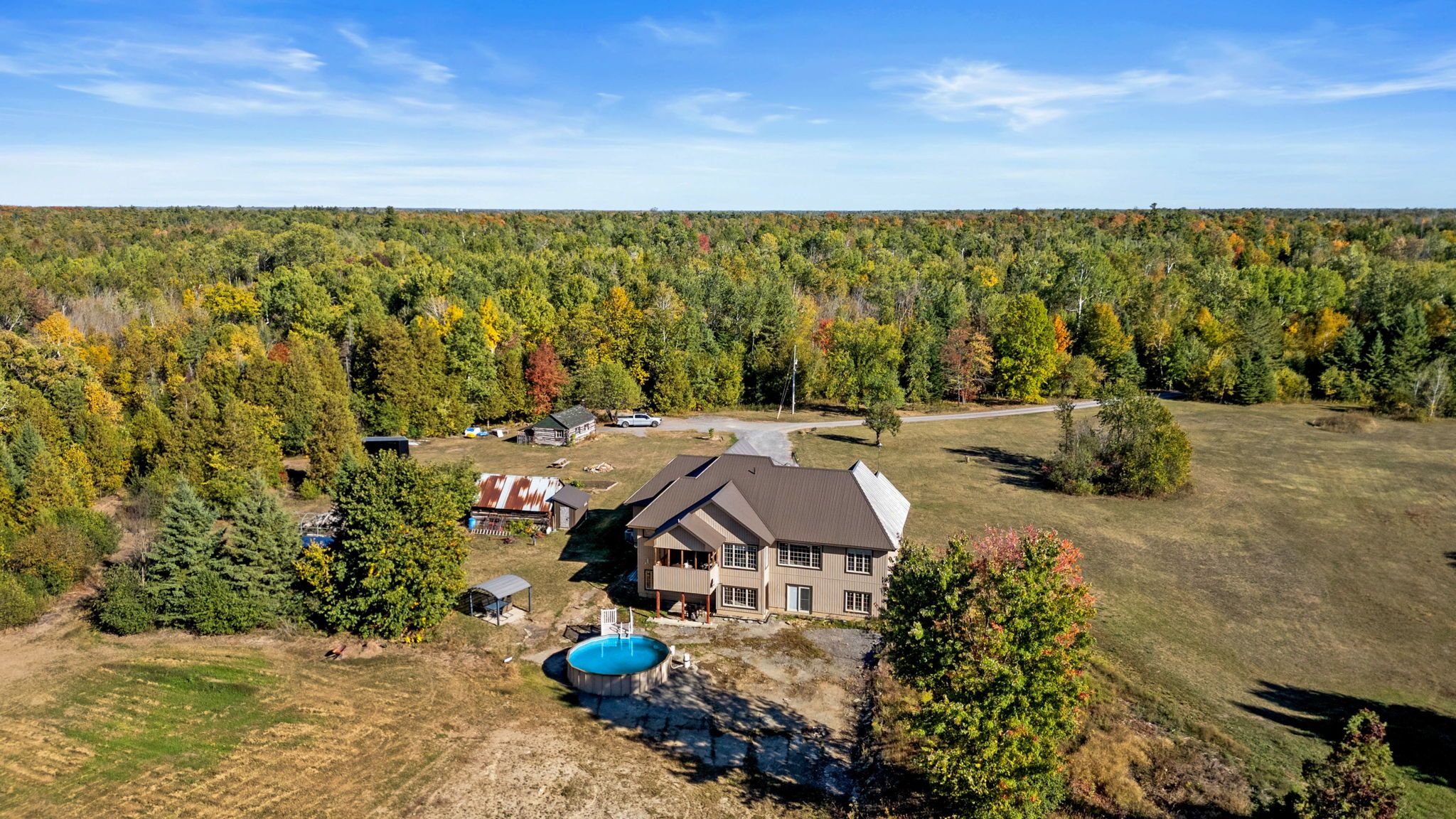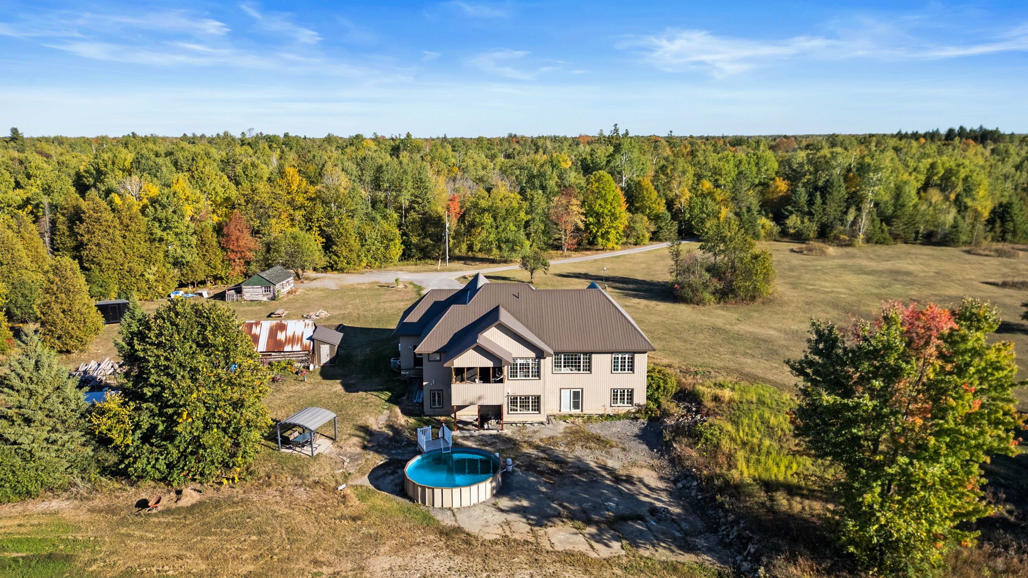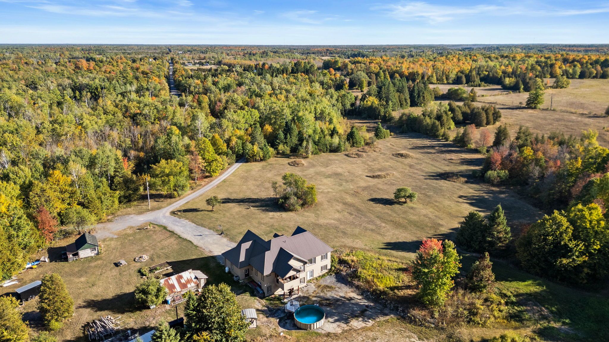 Welcome to your dream country escape! Nestled on nearly 300 acres of pristine land, this exceptional 5-bedroom, 3-bathroom walk-out bungalow offers the perfect blend of comfort, quality, and opportunity. Built approx 10 years ago to the highest standards, this home features icf construction from foundation to roofline, providing superior energy efficiency (ask about the r-value!) and incredible year-round comfort, topped with a lifetime steel roof for peace of mind. The spacious main floor boasts a high-end kitchen, with a bright dining area and walk-out to the elevated deck (ideal for morning coffee with wildlife views), a cozy living room, and three generous bedrooms including a private primary suite with ensuite bath. The two additional bedrooms share a full bath. A main floor office & bonus room above the garage give more flexibility. Below, the light-filled, walk-out basement offers radiant in-floor heating, two more bedrooms, a roughed in bathroom, and a family room that opens to a backyard oasis complete with a pond that freezes for winter skating & hockey. Dual heating systems, propane and a large outdoor wood furnace, keep utility bills in check. Cut your own wood from the land and heat the home for next to nothing! Radiant floor heating extends into the insulated triple car garage. The wood furnace is powerful enough to heat additional structures, offering excellent flexibility for future development. Outbuildings include a cabin with a wood stove and bunkbeds, perfect for guests or a rustic retreat. There's also a large barn with dual rafters for storage or hobby use. With hydro capacity to support a second home and zoning that permits one, the potential for expansion or multi-generational living is real. Trails wind through the landscape, teeming with deer, moose, turkey, and even the occasional bear, a true paradise for nature lovers, hunters, and those seeking peace and privacy. Contact the listing agent for a full list of premium construction details.