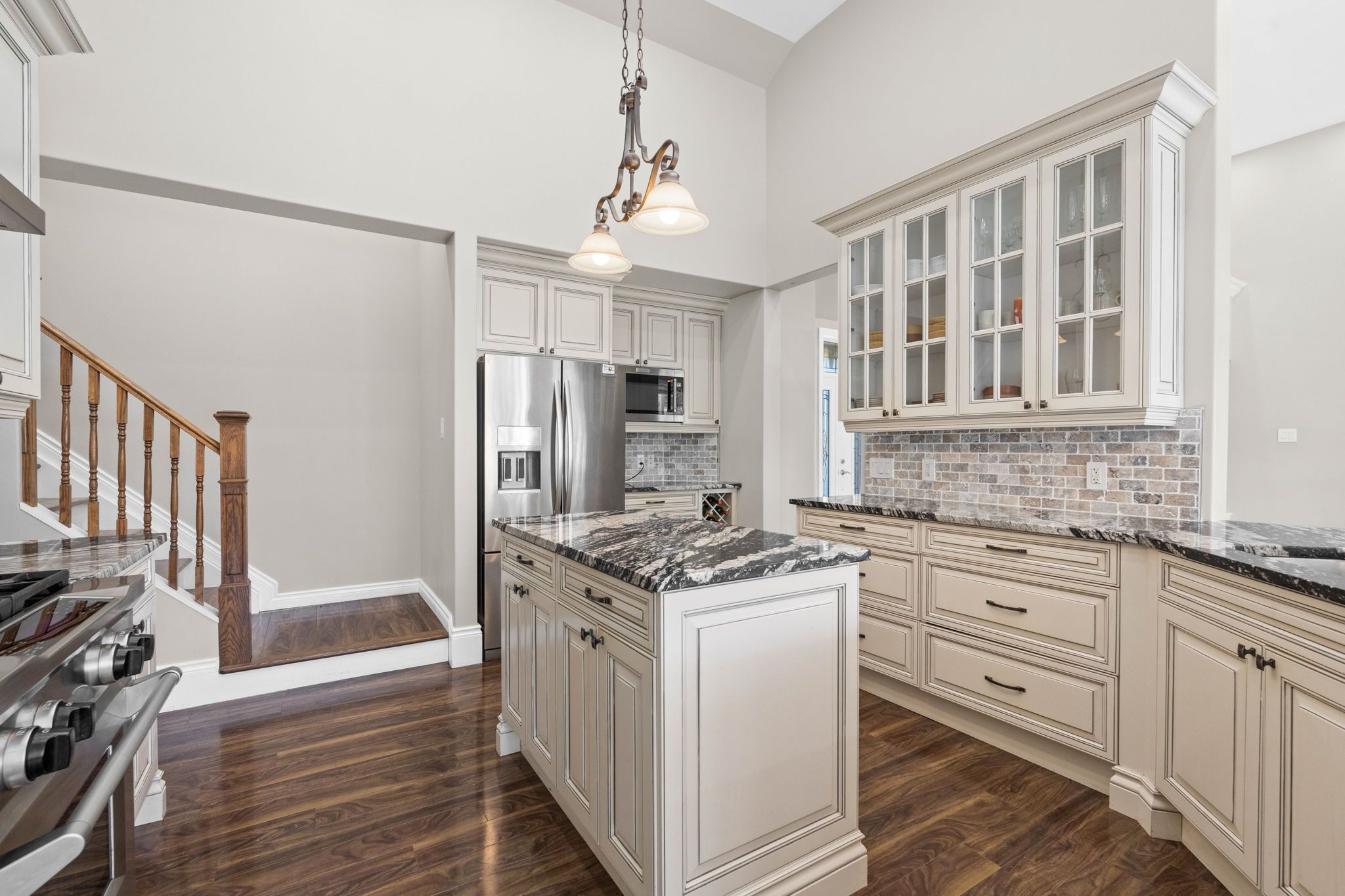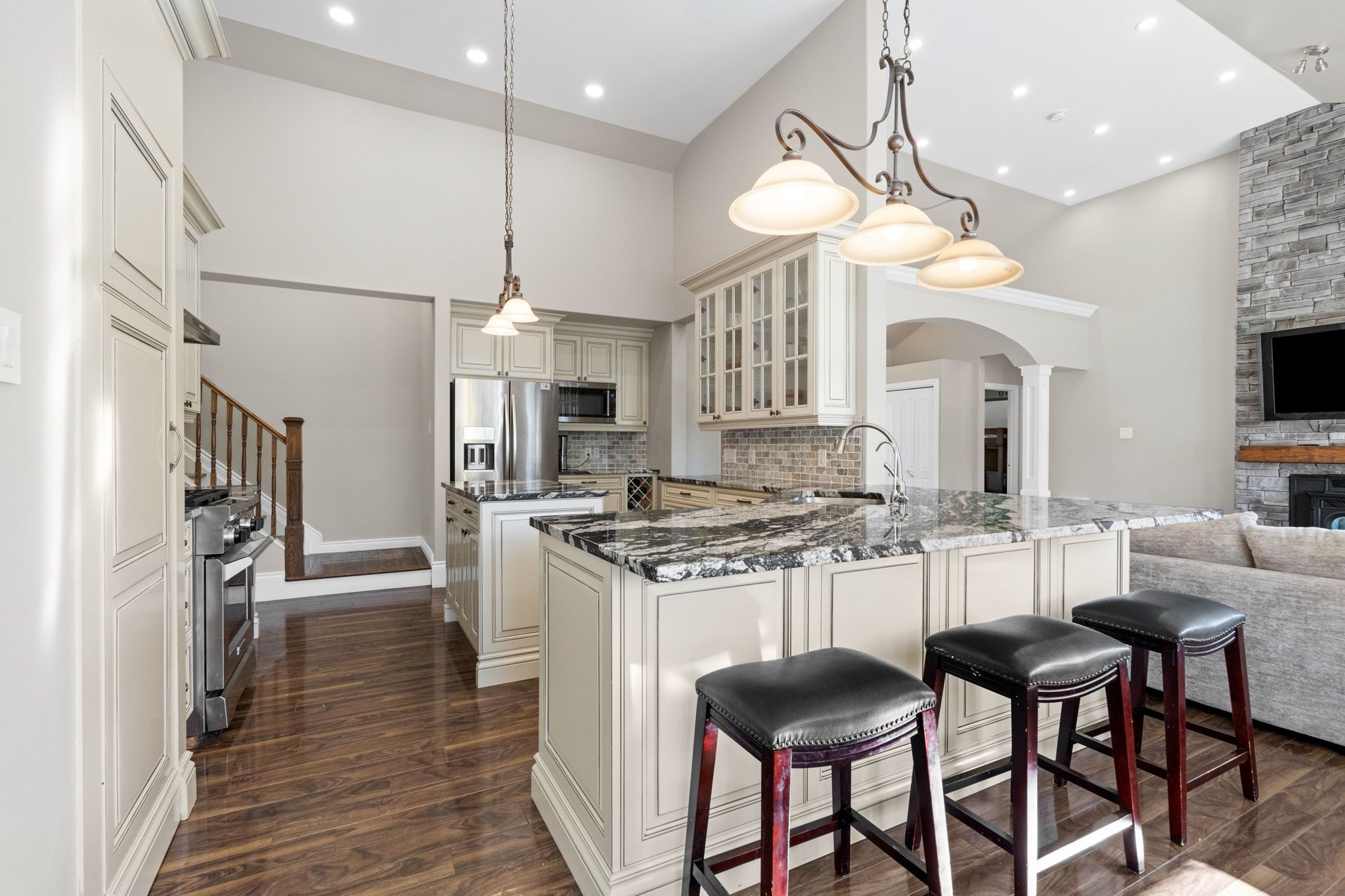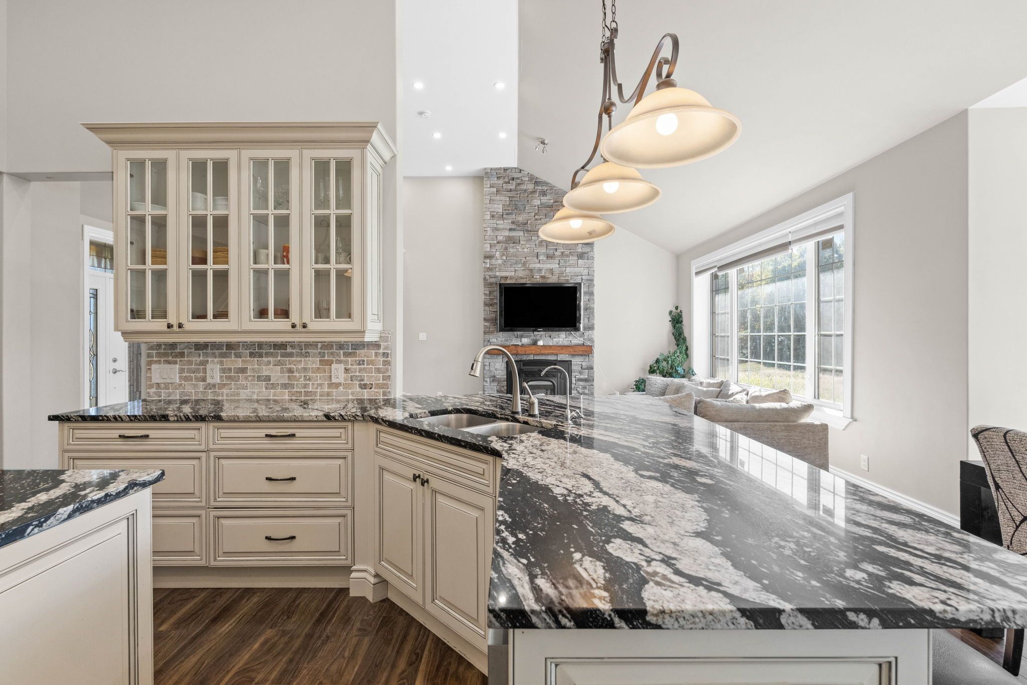 • Light-filled walk-out basement with family room opening to a backyard pond.