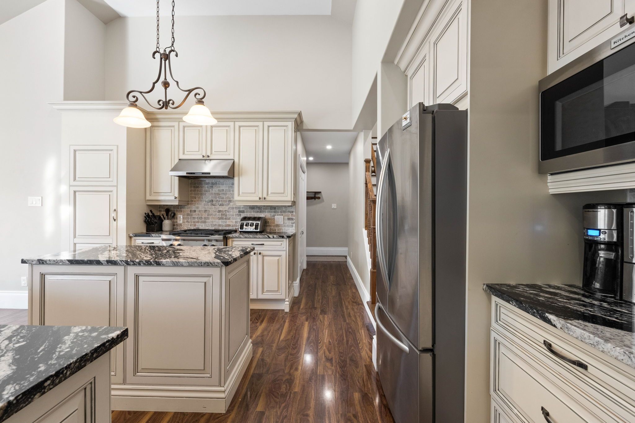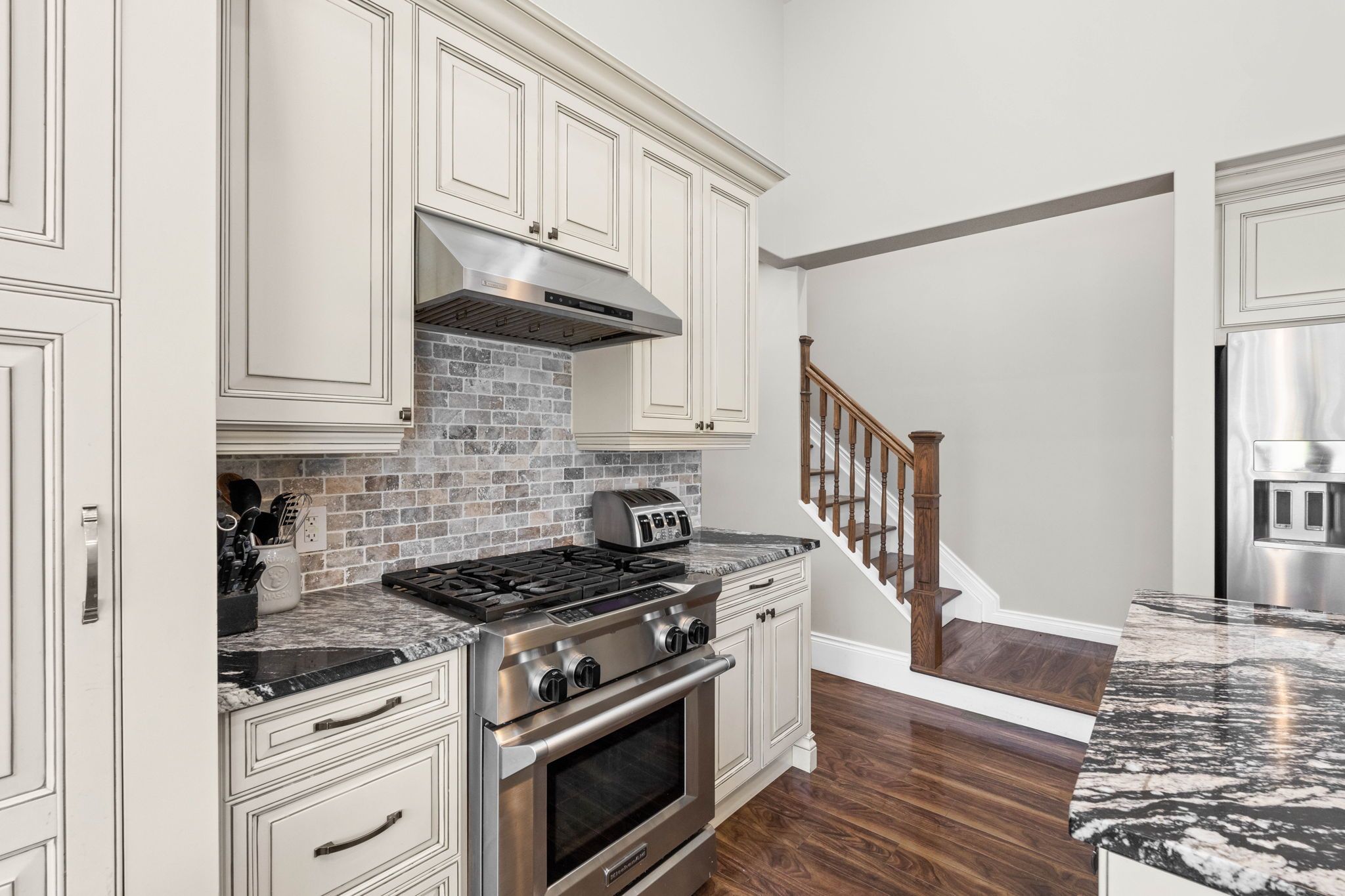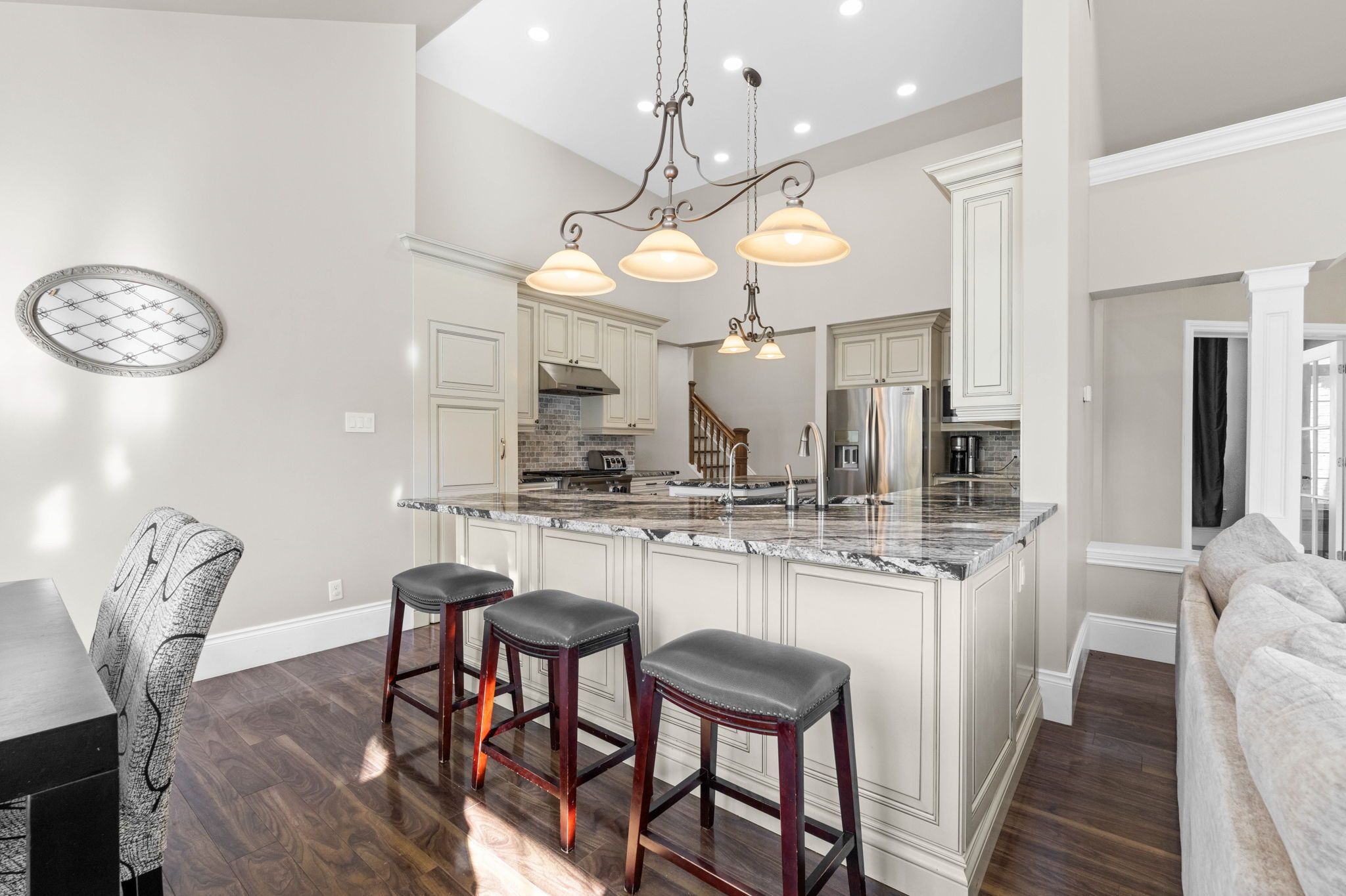 • Light-filled walk-out basement with family room opening to a backyard pond.