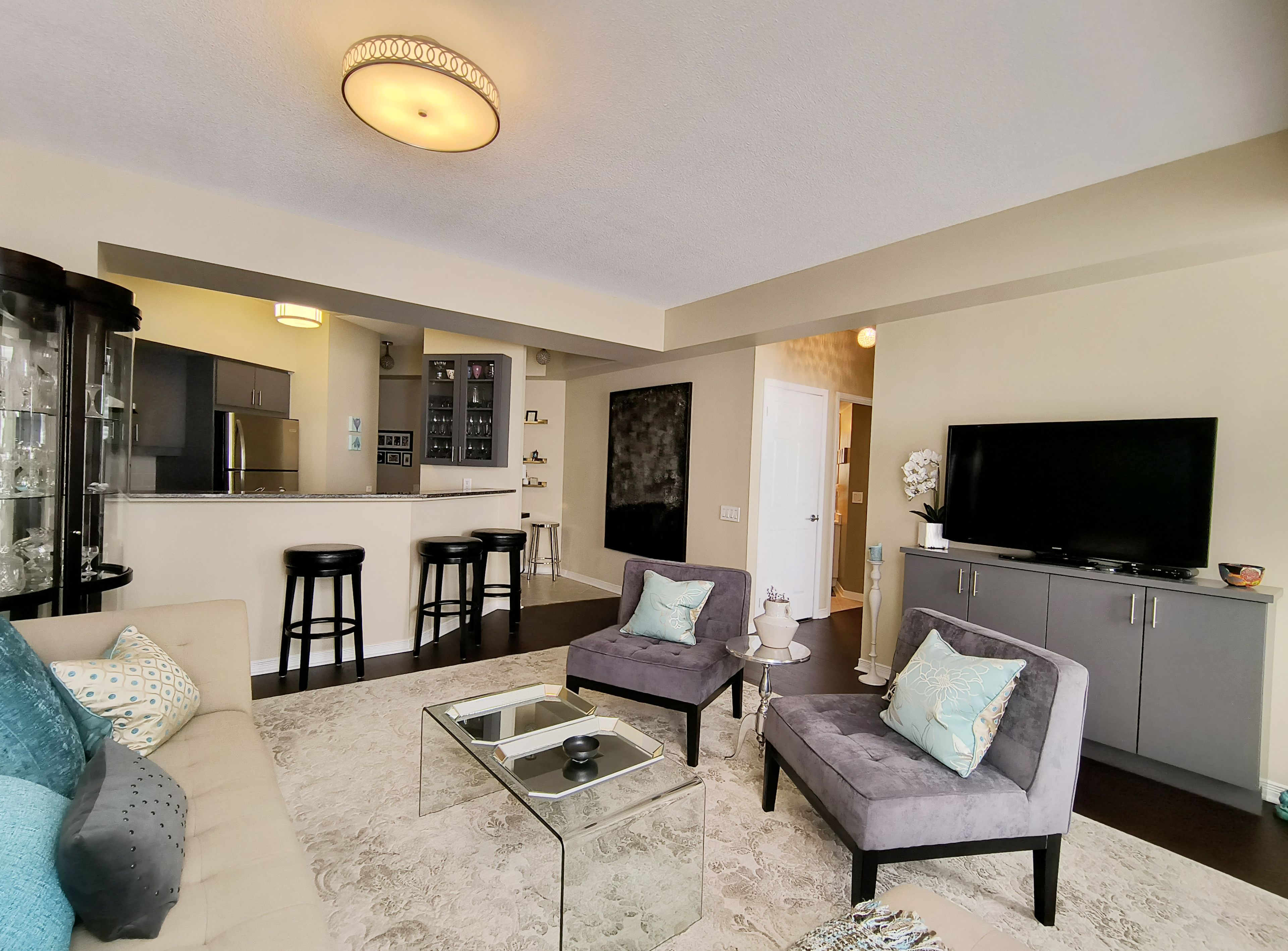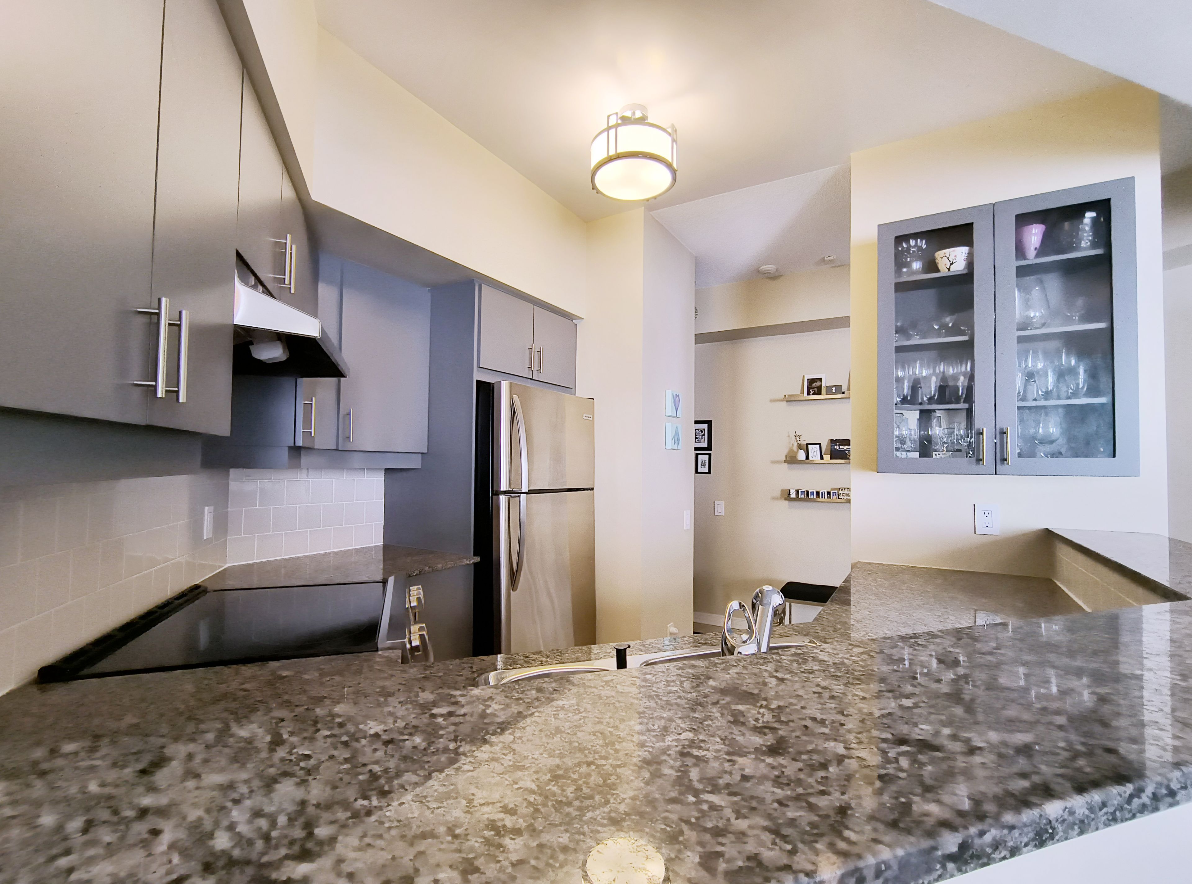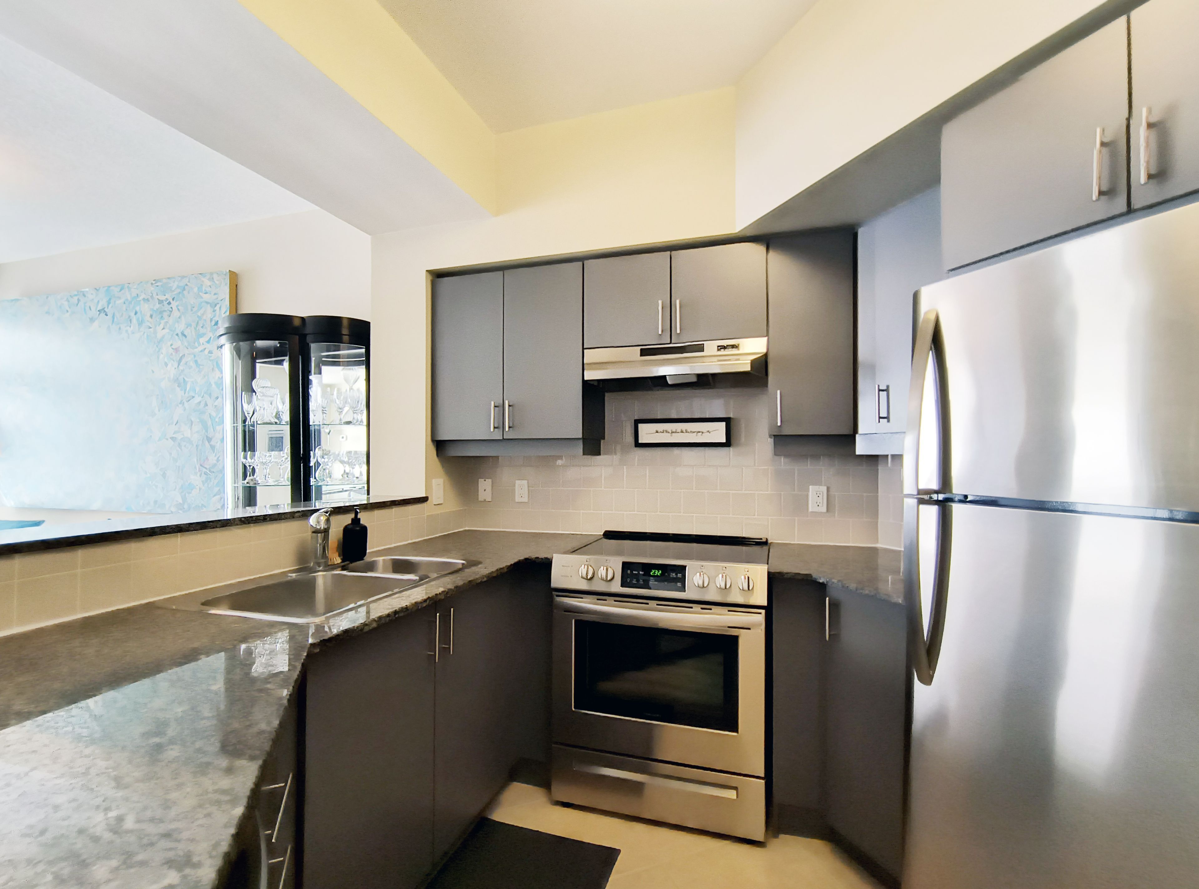• Upgraded kitchen with stainless-steel appliances and breakfast counter.