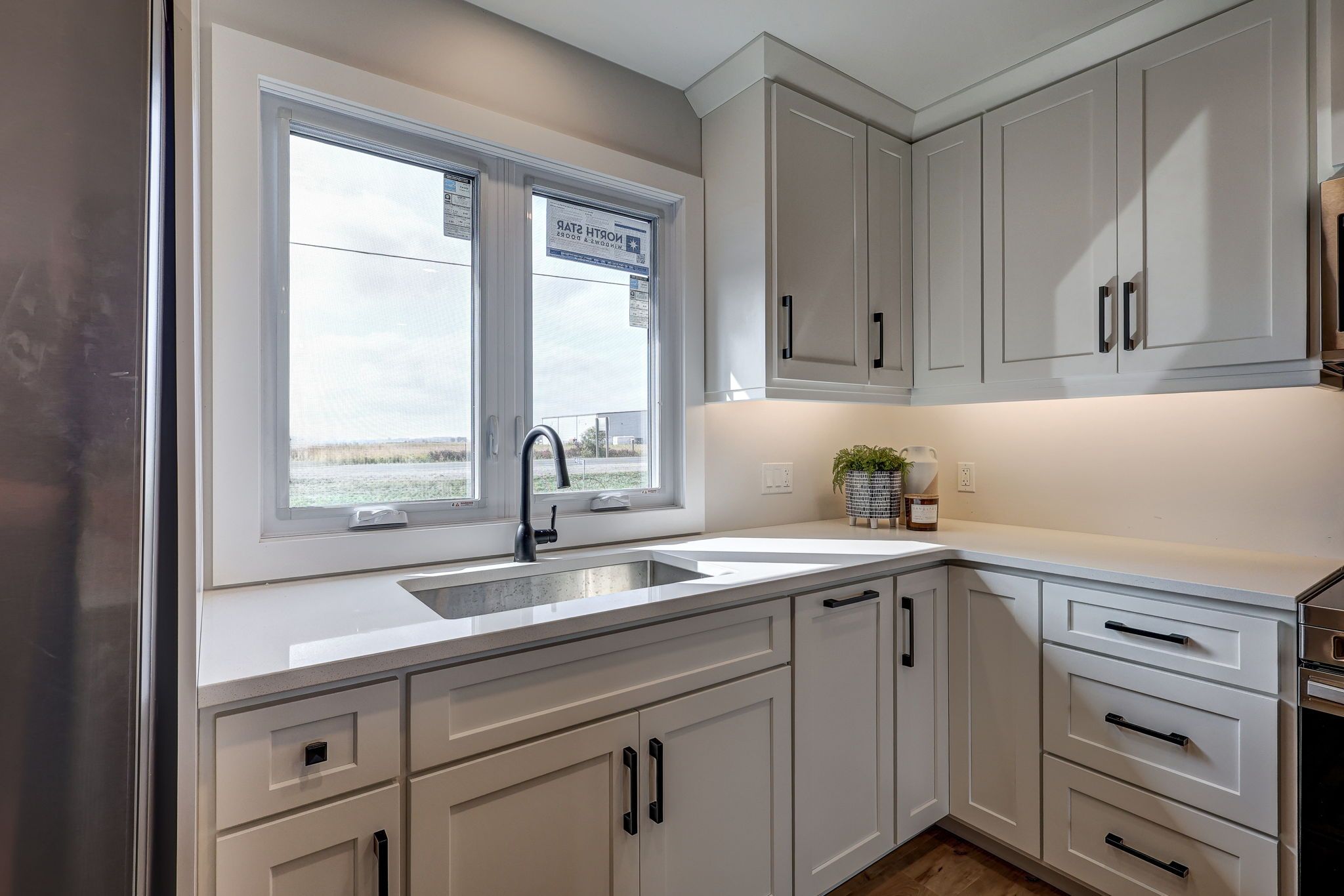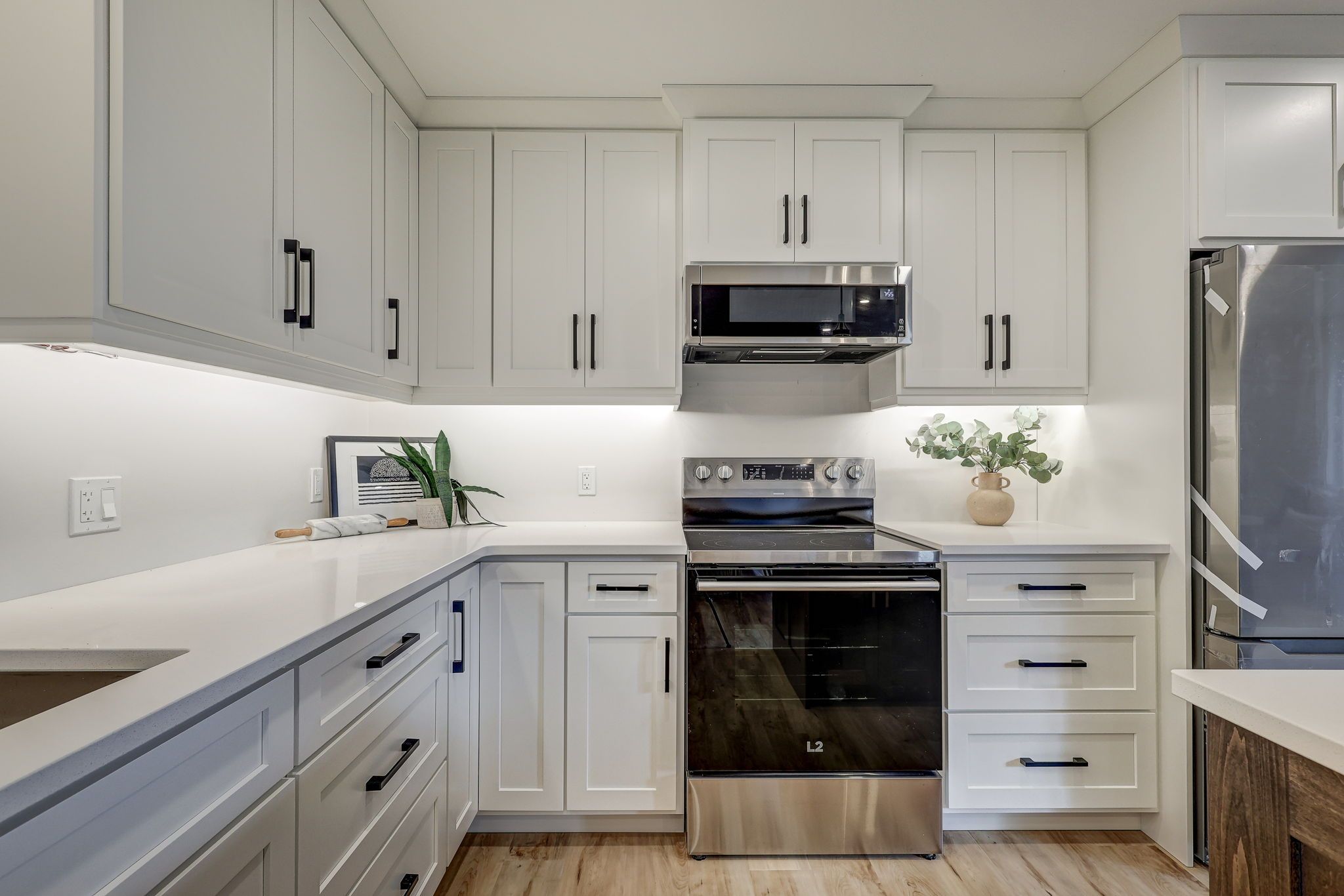 • High-end custom kitchen with quartz countertops and newer appliances.