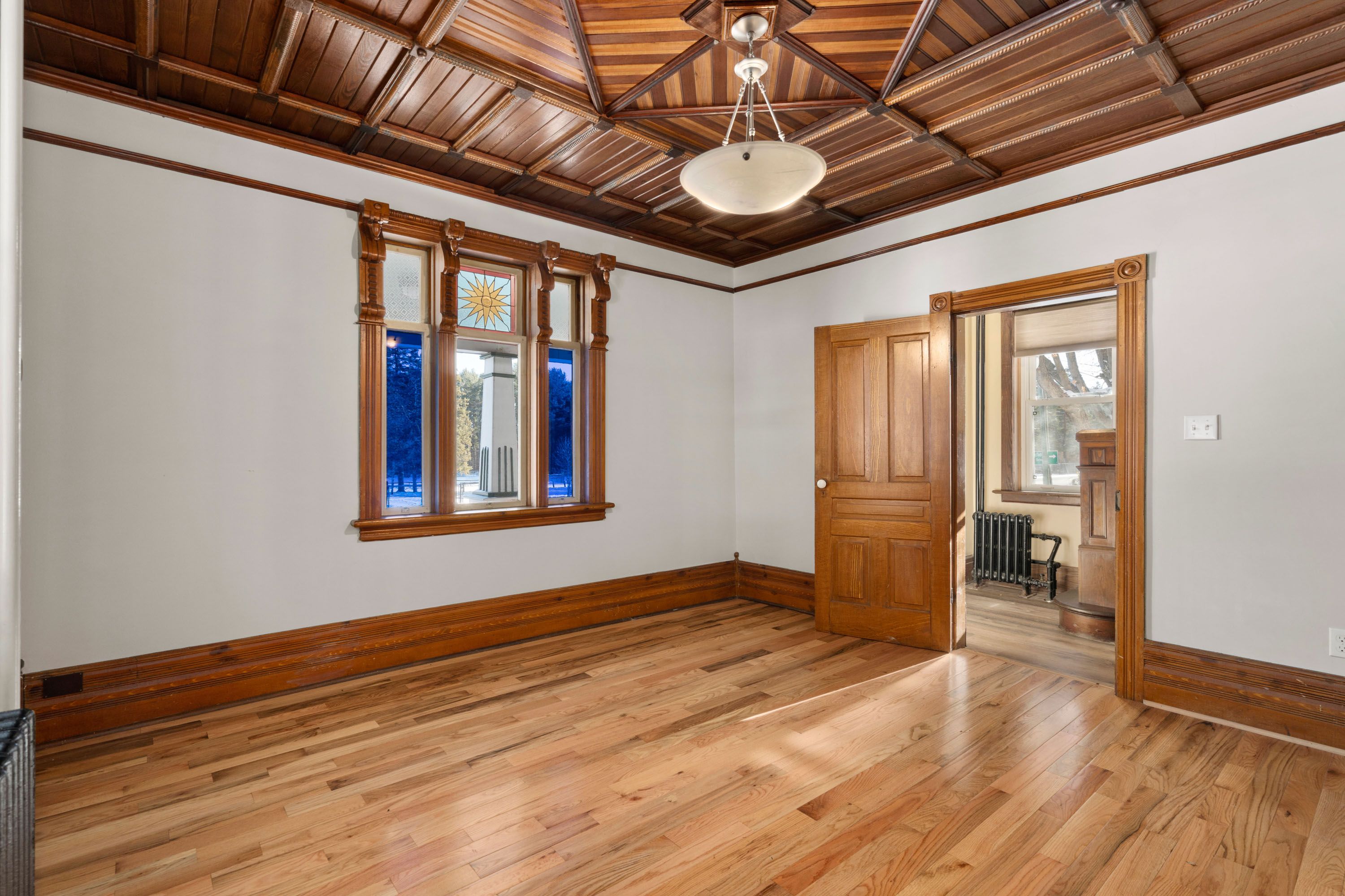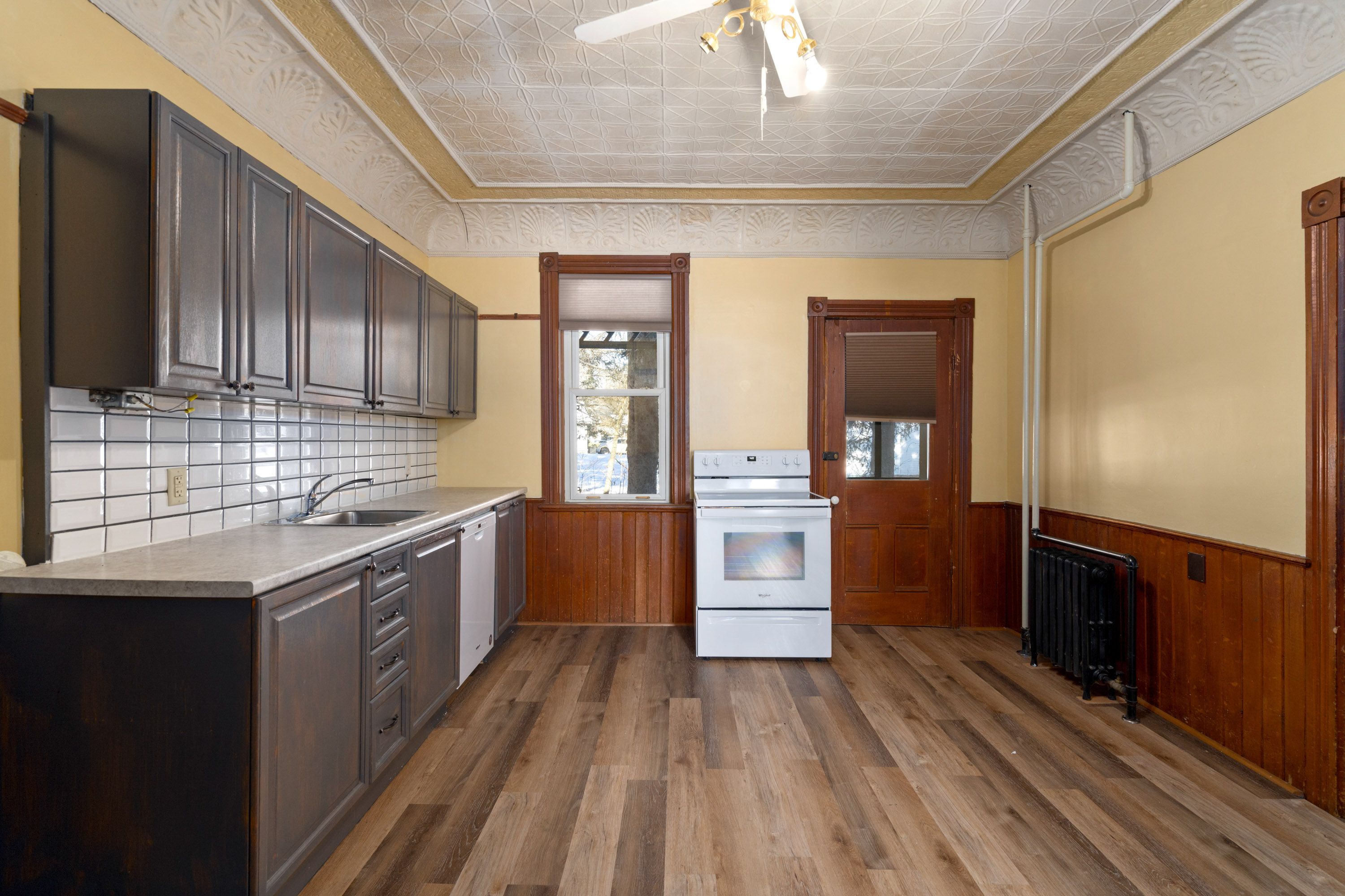 • Spacious kitchen features original tin ceiling and walkout to side deck.