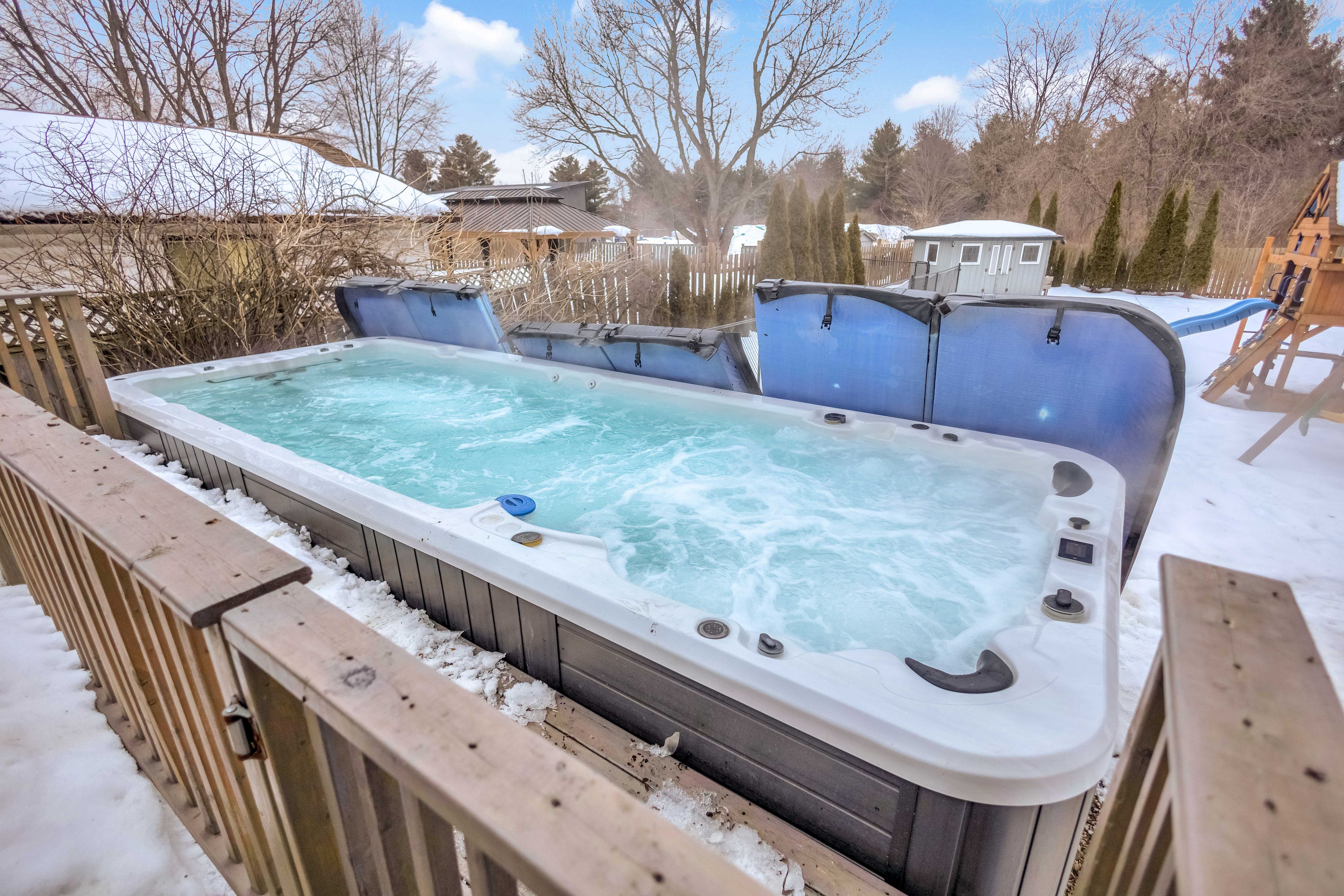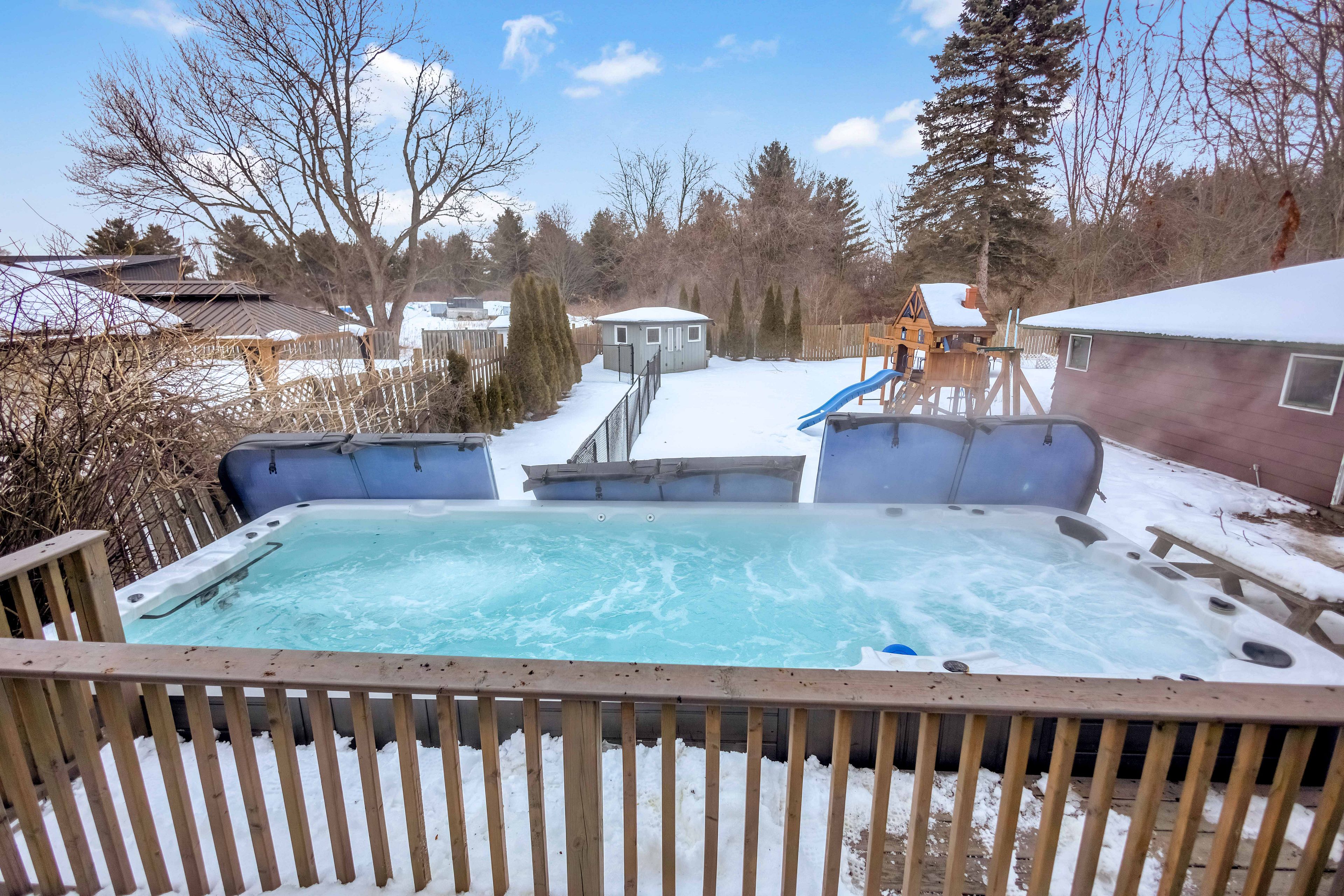 Tucked along one of the most desirable edge-of-city corridors between ancaster and hamilton, this exceptional bungalow offers a lifestyle defined by space, privacy, and effortless comfort. Set on an impressive 75' x 200' estate-style property, the home enjoys a peaceful setting surrounded by mature landscapes with fully fenced yard (2021) and open skies - creating the feeling of country living while remaining moments from premier amenities, commuter routes, and everyday conveniences. Inside, a sun-filled open-concept layout creates a warm and welcoming atmosphere where the living, dining, and kitchen areas blend seamlessly - designed equally for relaxed daily living and entertaining. Three well-appointed bedrooms and a 4-piece bath complete the main level. The finished lower level extends the home's versatility, featuring a spacious recreation room anchored by a gas fireplace, along with a private suite ideal for guests, multigenerational living, or a refined home office, complete with ensuite that has key fixtures already installed and remaining finishes ready for customization. Outdoors, the property transforms into a private retreat. A large deck overlooks the expansive backyard where a newer year-round 19 foot swim spa (2020) provides both relaxation and fitness in every season. The oversized detached garage accommodates up to four vehicles and offers exceptional flexibility for collectors, hobbyists, or workshop use. Located minutes from ancaster meadowlands shopping, conservation trails, golf, and highway access, this property delivers the rare opportunity to enjoy a tranquil setting without sacrificing connectivity. A refined country-inspired lifestyle - right at the city's edge.