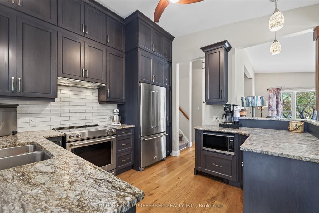 • Custom kitchen features solid wood cabinetry and leathered granite countertops.