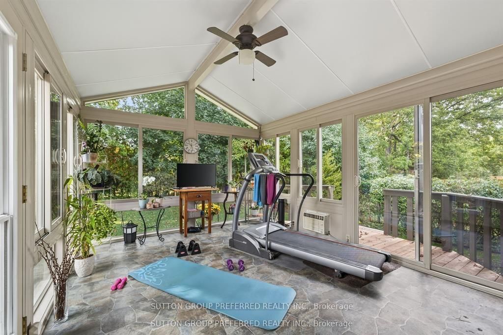 • Bright sunroom leading to a landscaped backyard oasis with water feature.
