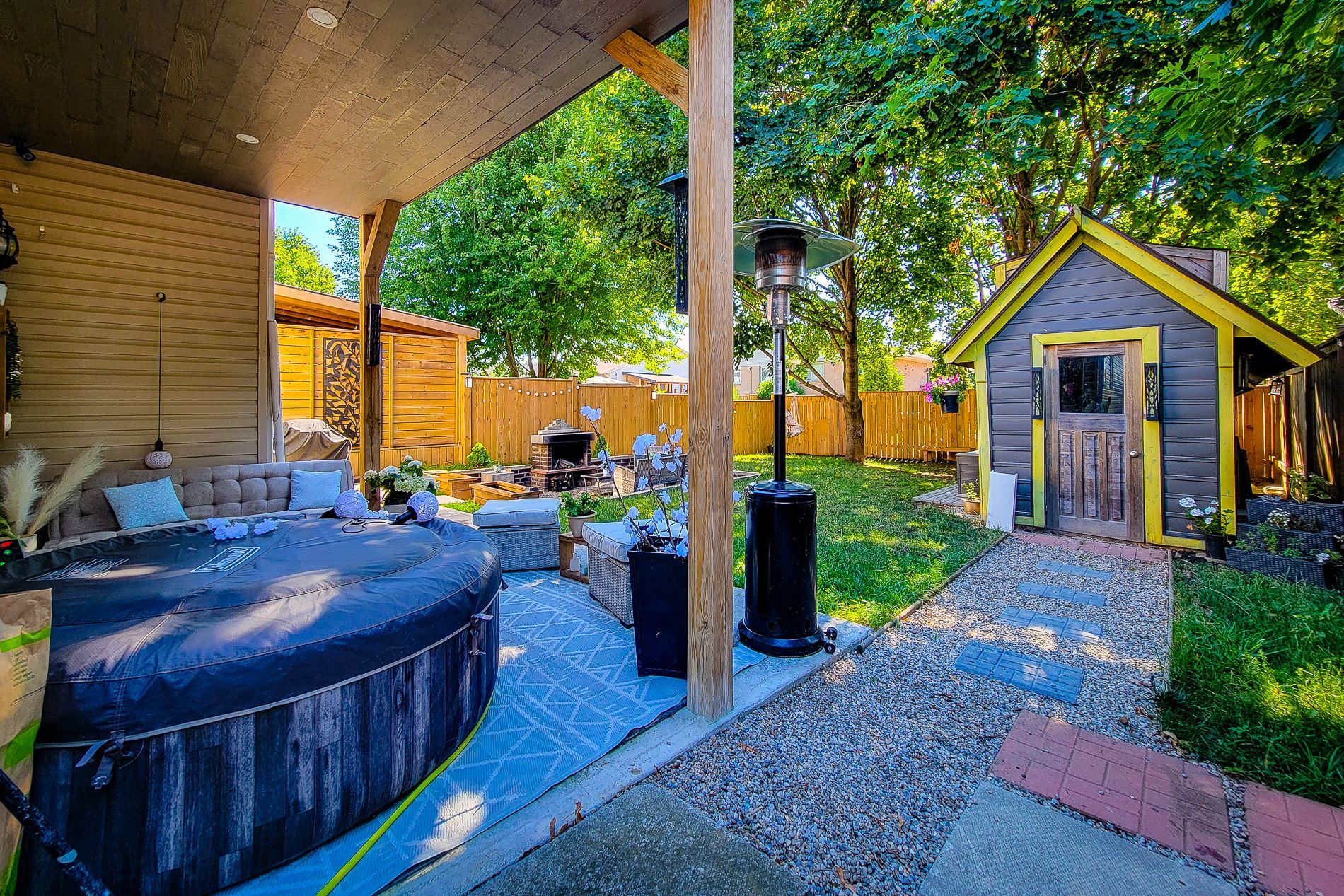 • Fully fenced backyard features deck, fire pit, and storage shed.