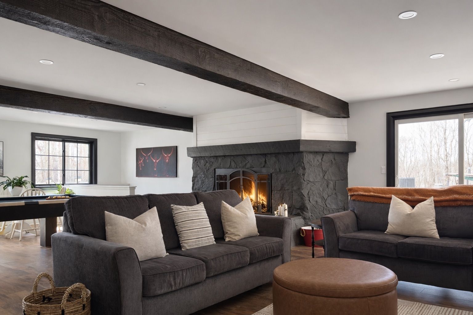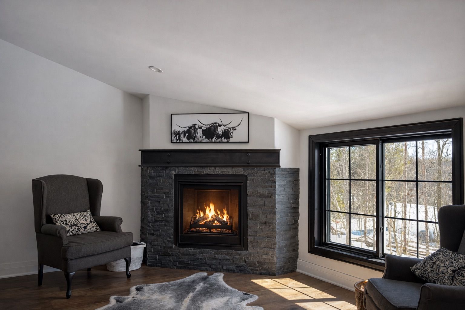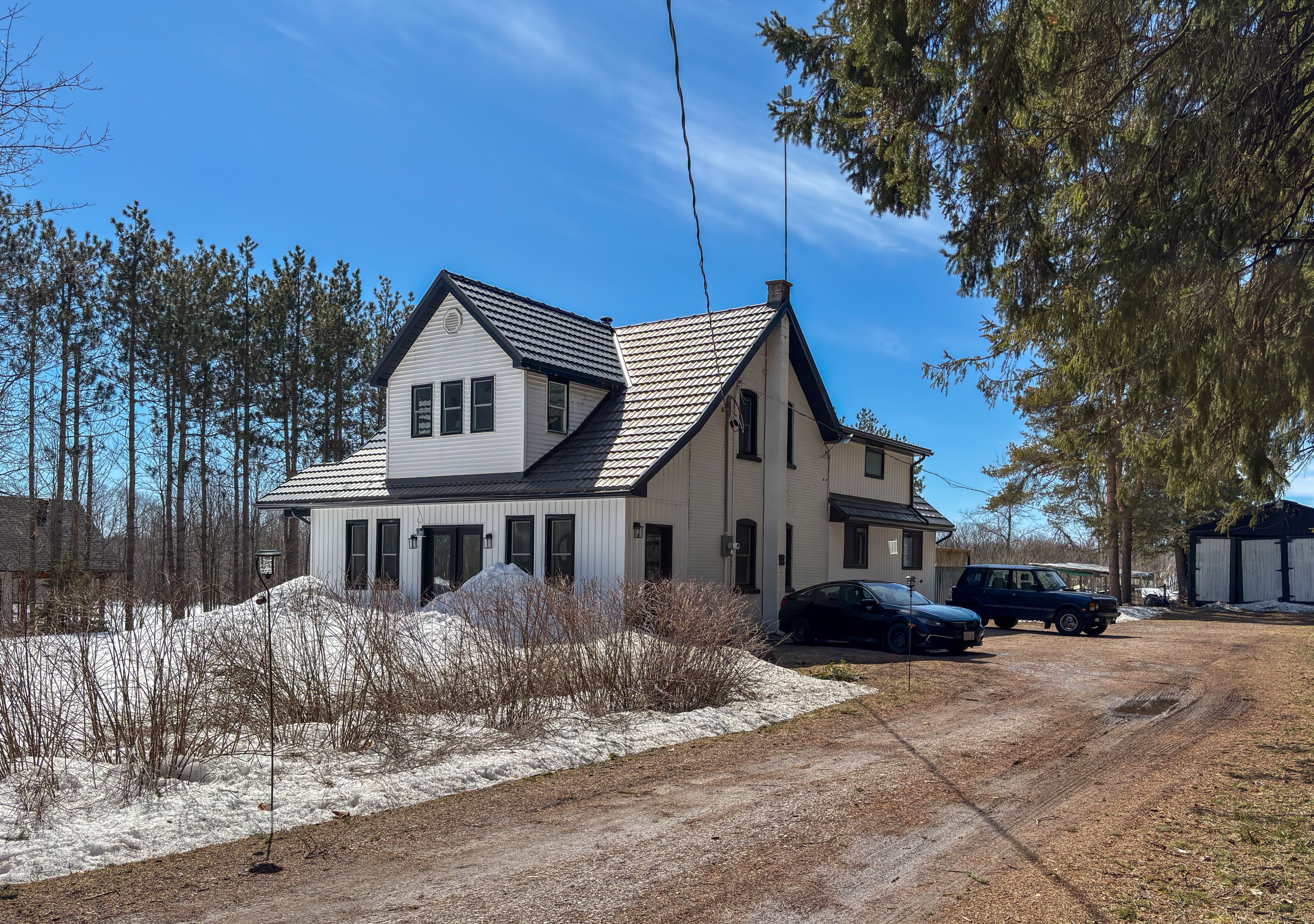 Stunning modern country residence ideally situated minutes from mount st. Louis moonstone, offering over 4,500 square feet of beautifully reimagined living space on a private one-acre setting. This extensively renovated home blends timeless character with refined contemporary design, featuring seven bedrooms and five elegant bathrooms. A showstopping chef's kitchen anchors the main level with an expansive island and seamless flow into a generous dining area, perfect for memorable gatherings. The open concept great room showcases a striking wood burning fireplace and multiple conversation zones, creating a warm and inviting atmosphere. The primary suite is a luxurious retreat with a spa-inspired five piece ensuite and walk-in closet, complemented by three additional bedrooms, a bright sunroom or office, and convenient upper level laundry. The fully self-contained lower level offers exceptional flexibility with a modern eat-in kitchen, spacious living area, three bedrooms, one and a half bathrooms, abundant storage, and a walkout to the grounds. A substantial barn or garage with 60 amp service and 240 volt power comfortably accommodates two trucks. Enjoy proximity to horseshoe valley resort, along with easy access to barrie and orillia. Notable features include a durable steel roof, updated windows, 200 amp electrical service, enhanced insulation, upgraded plumbing and hvac systems, a 14 by 24 foot deck, distinctive brick and wood beam accents, two fireplaces, and an impressive 17 foot swim spa designed for year round enjoyment under the stars.