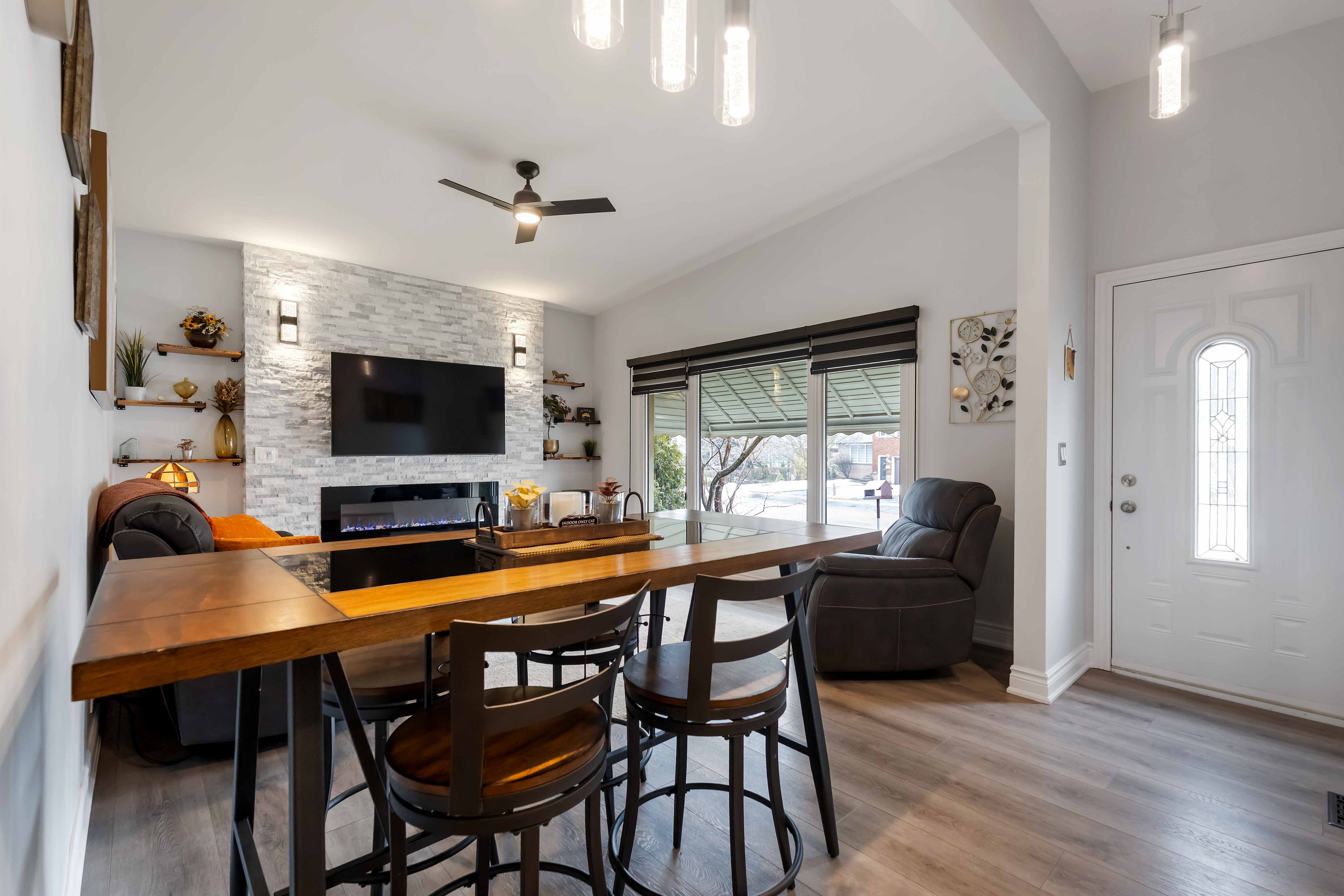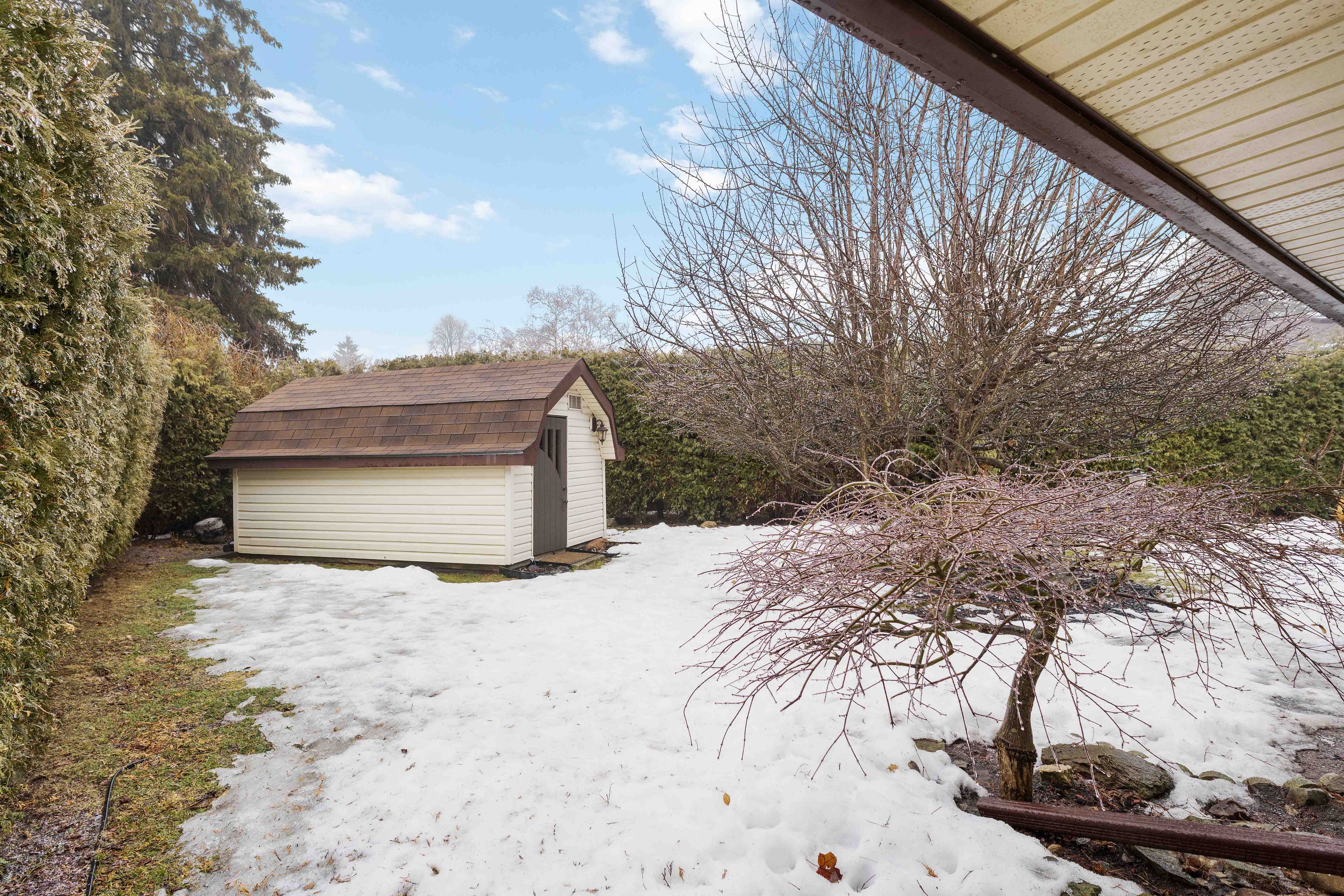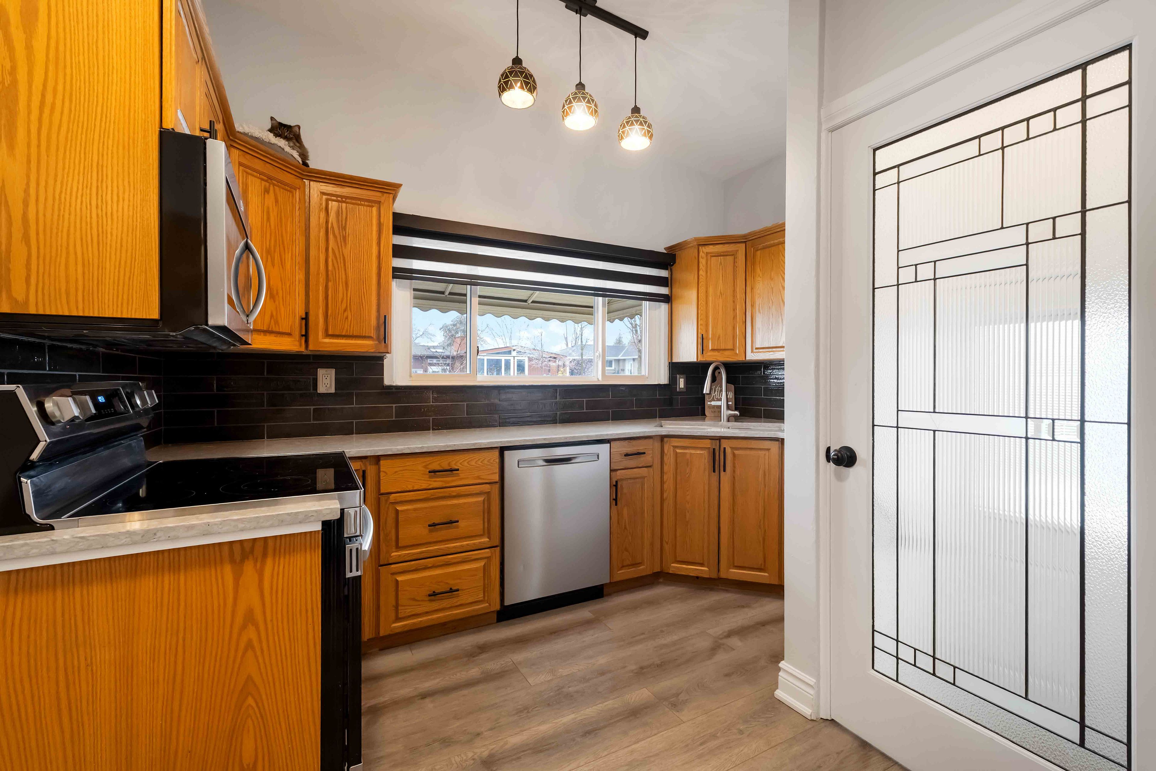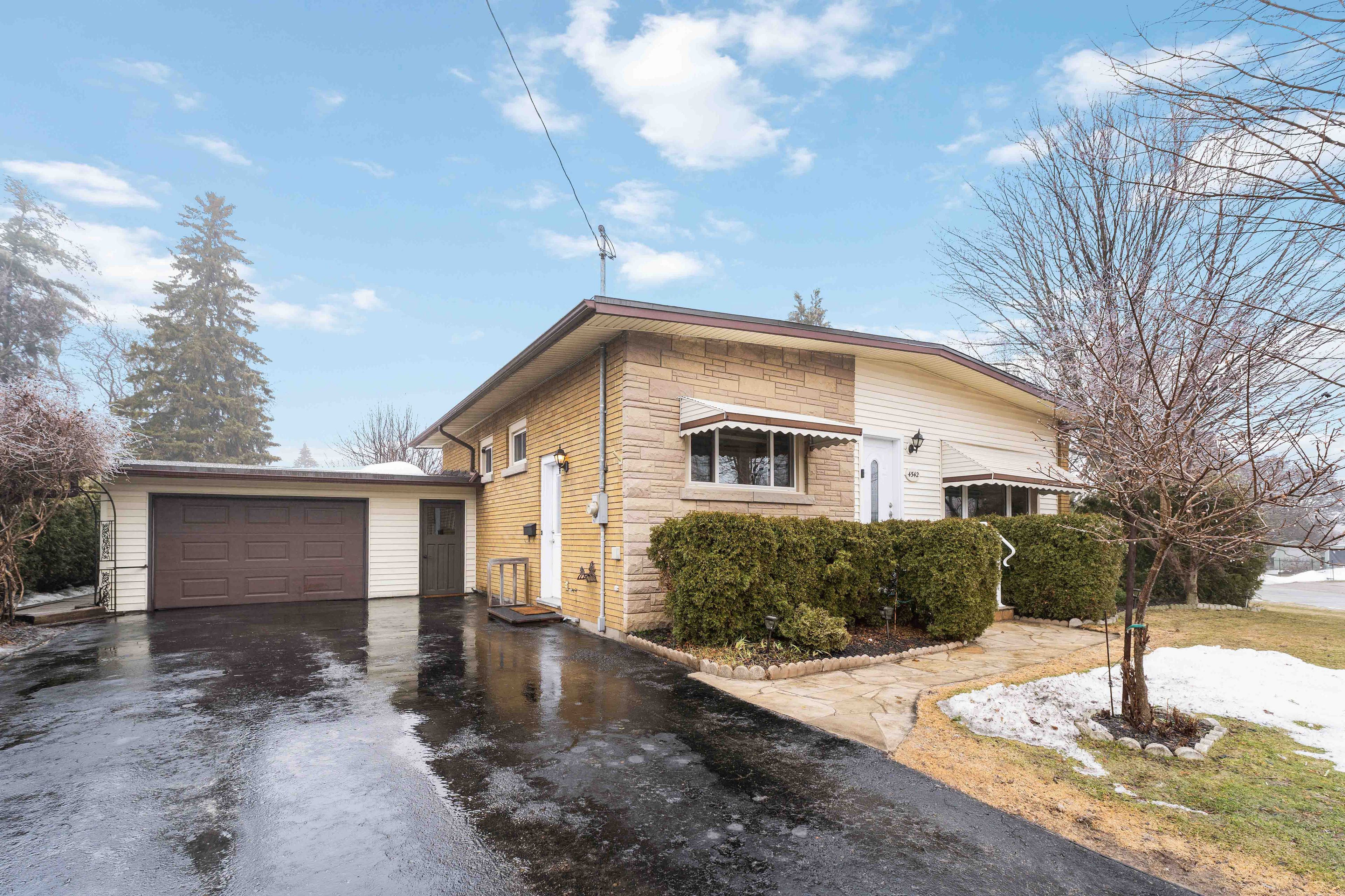 Bright, spacious, and meticulously maintained home on a large, irregular corner lot in a quiet, mature neighbourhood, just a short walk to cherrywood acres public school. Enjoy a private, tree lined backyard with a lovely apple tree. High ceilings and large windows fill the home with natural light. The living room features a beautiful fireplace feature wall and flows nicely from the kitchen, making it perfect for everyday living and entertaining. The kitchen combines classic oak cabinetry with modern touches including quartz countertops, new backsplash and stainless steel appliances. A split bedroom wing, set a few steps up, adds privacy from the main living area. Flexible layout with 3 bedrooms on the main level, while the lower level can easily serve as 2 extra bedrooms or a large family room plus an additional bedroom or multi purpose room, depending on your needs. Additional highlights include an attached garage with a rear workshop area. Roof (2013), windows and doors (2011), furnace (2019), a/c (2019), and brand new luxury vinyl flooring throughout, backsplash in kitchen and oven. A fantastic opportunity in a family friendly neighbourhood.