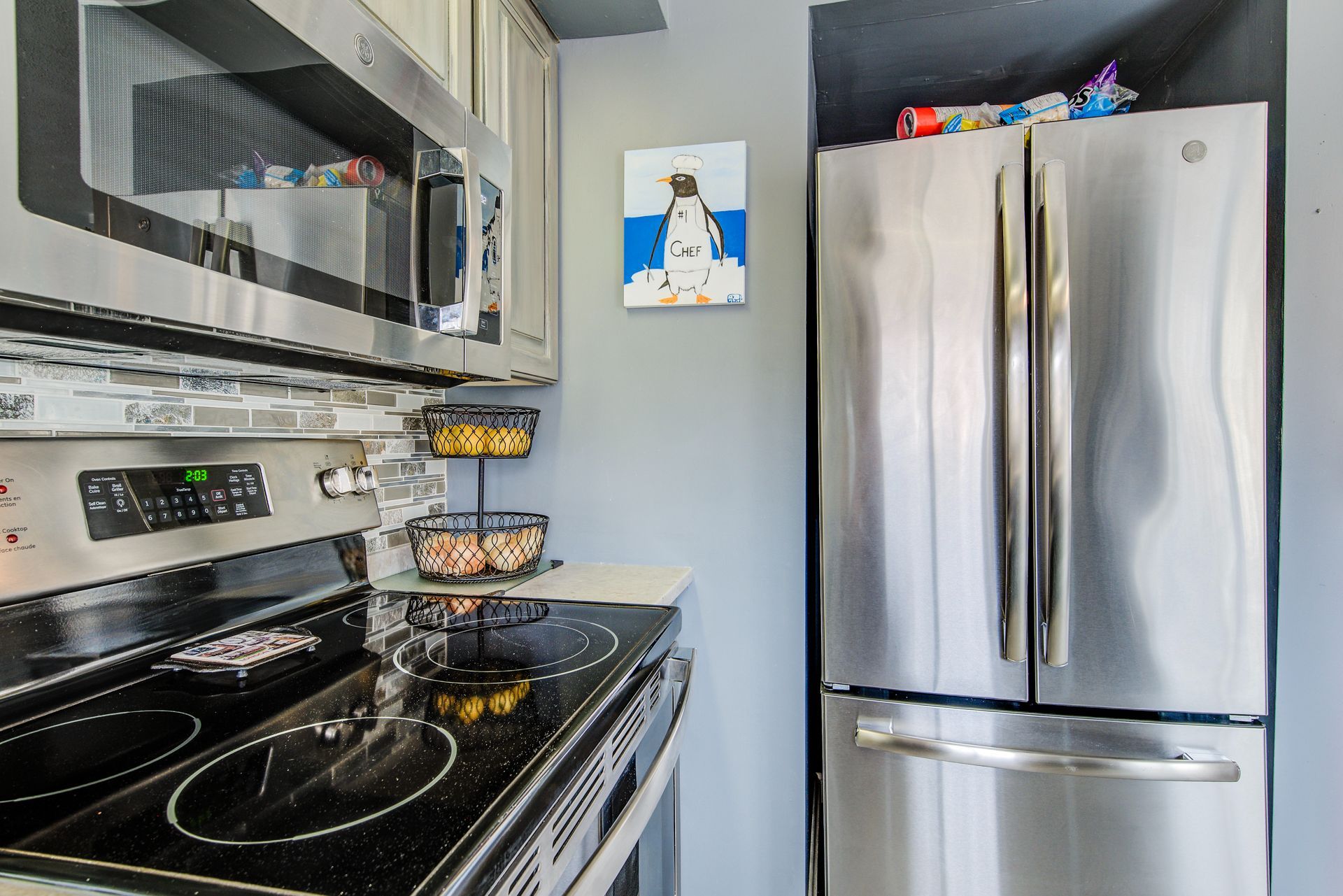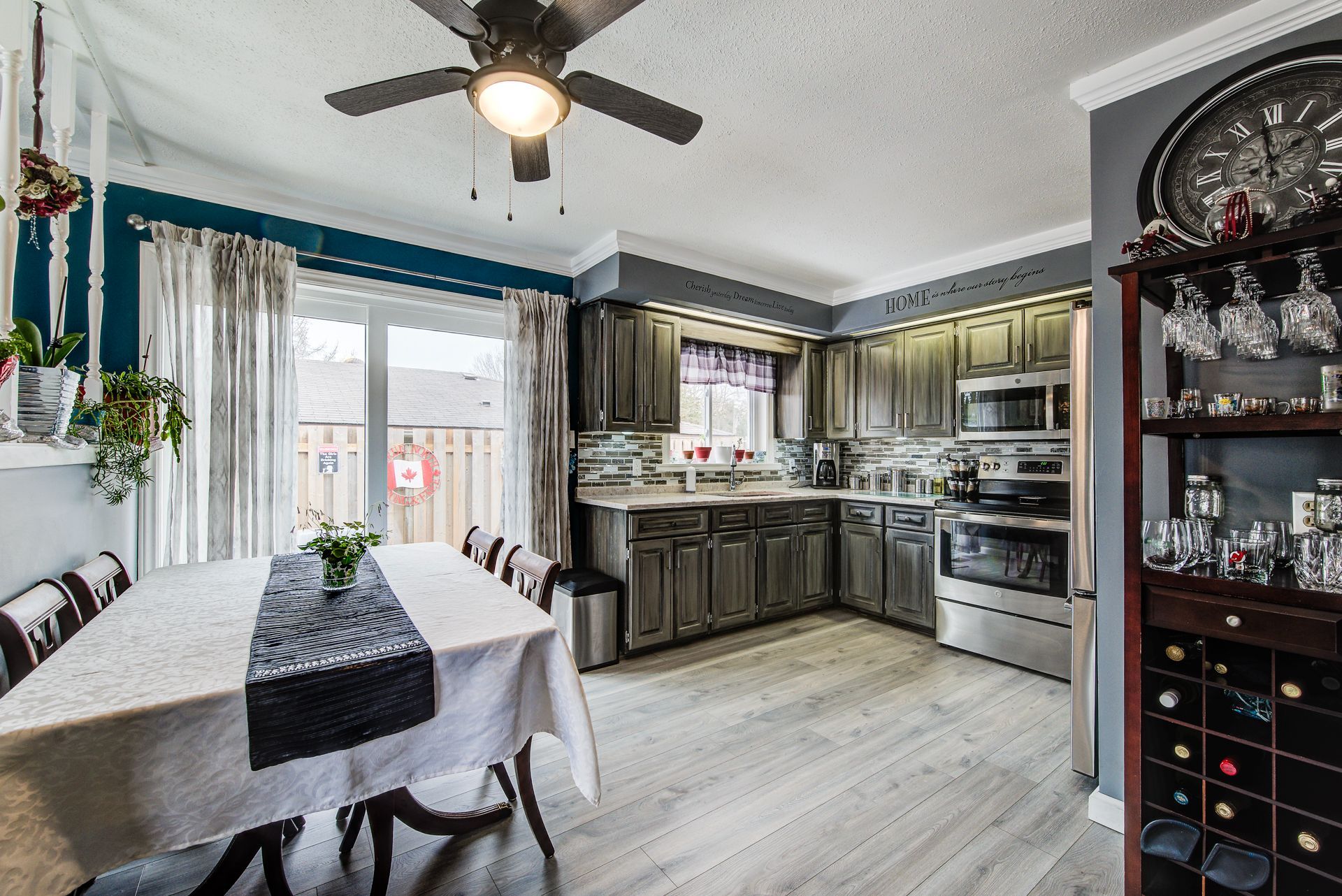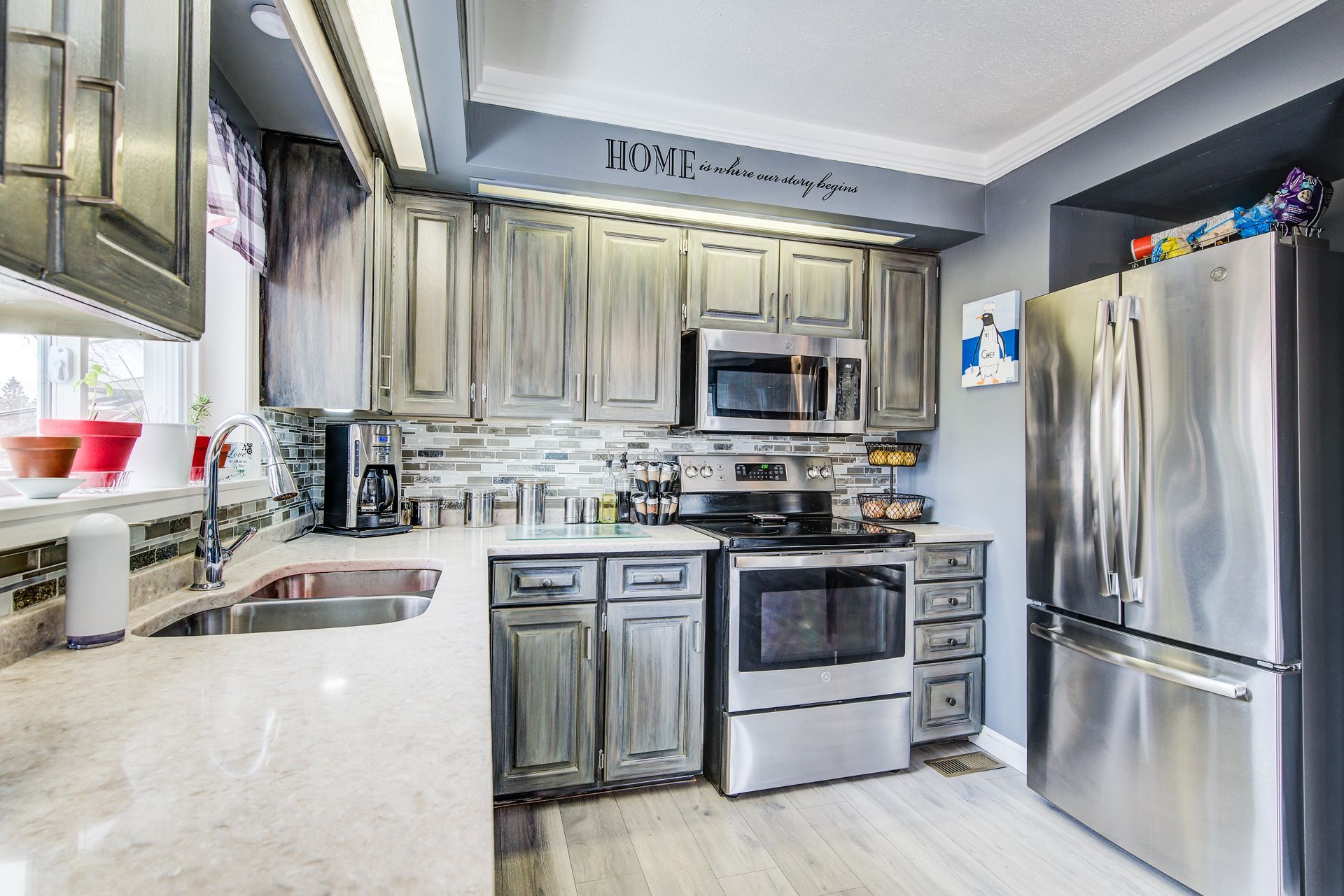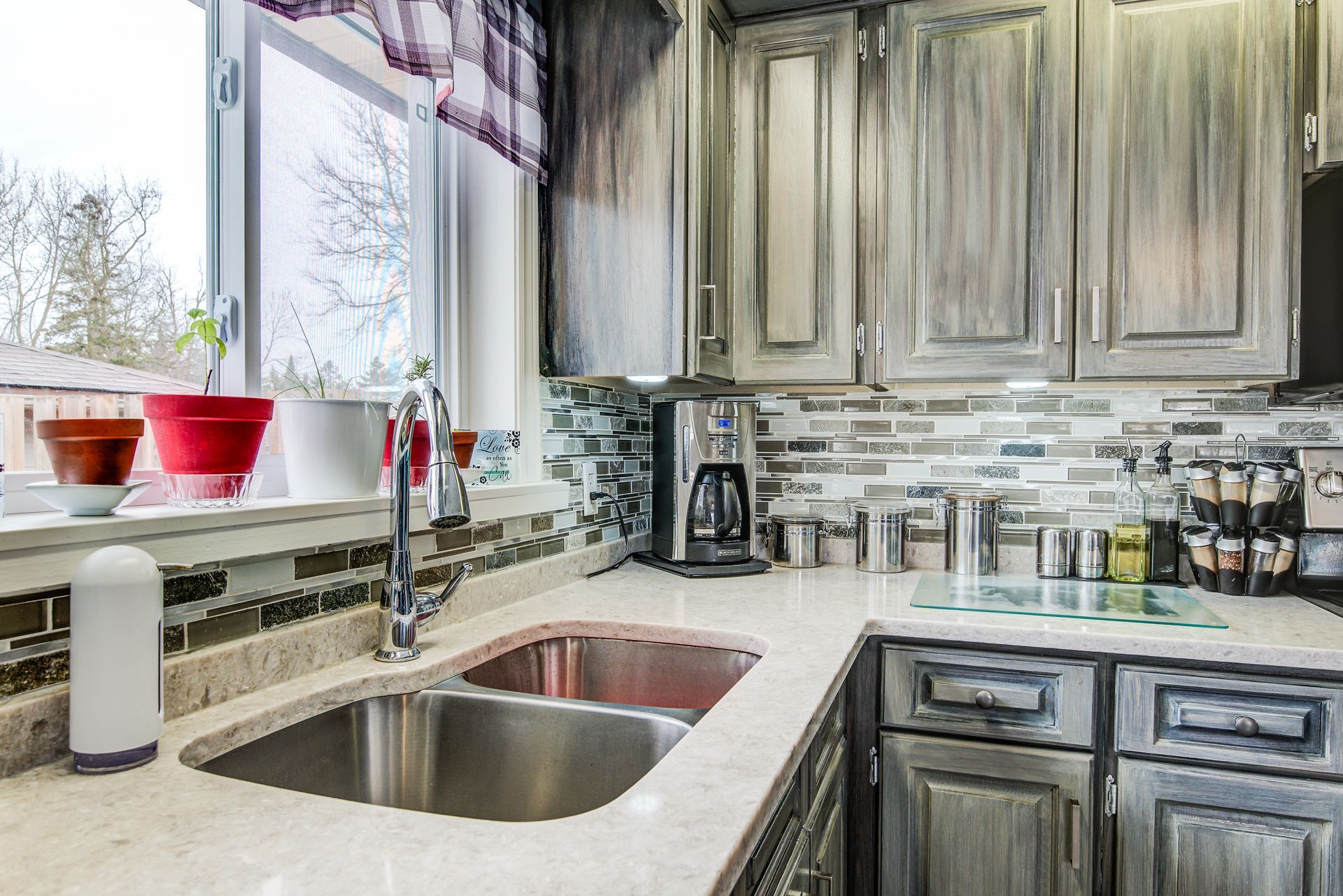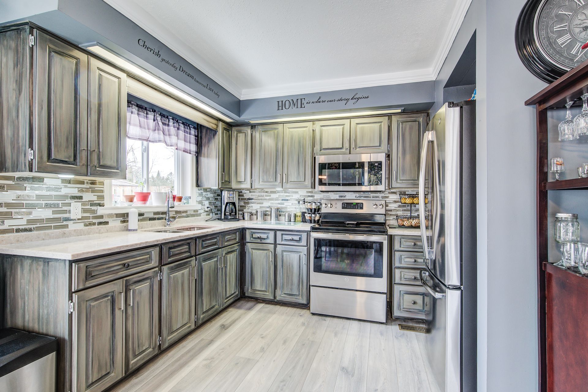 • Stylish kitchen with quartz countertops and rustic barn board accents.
